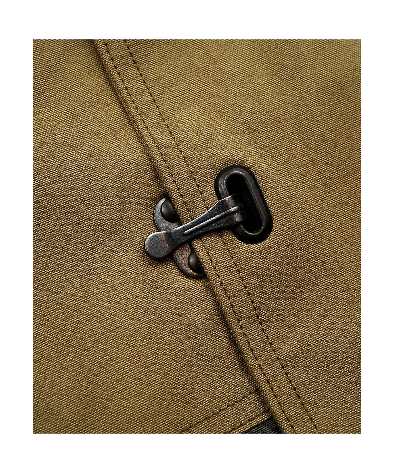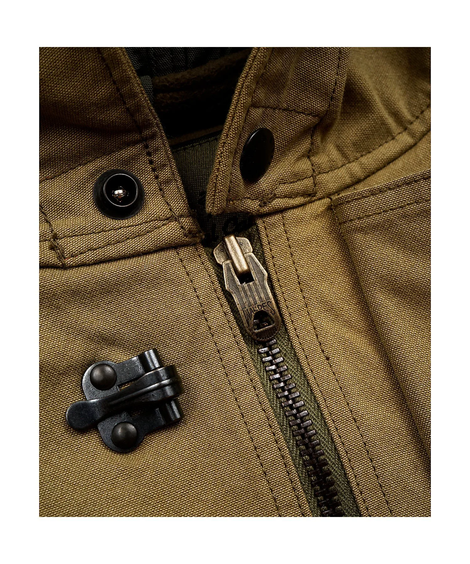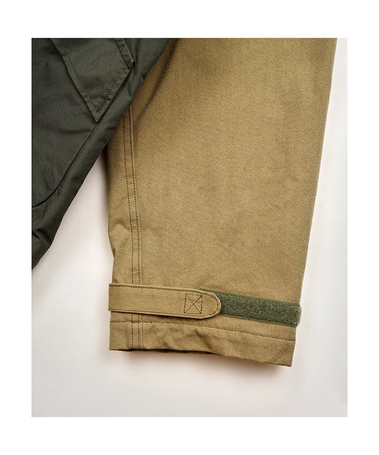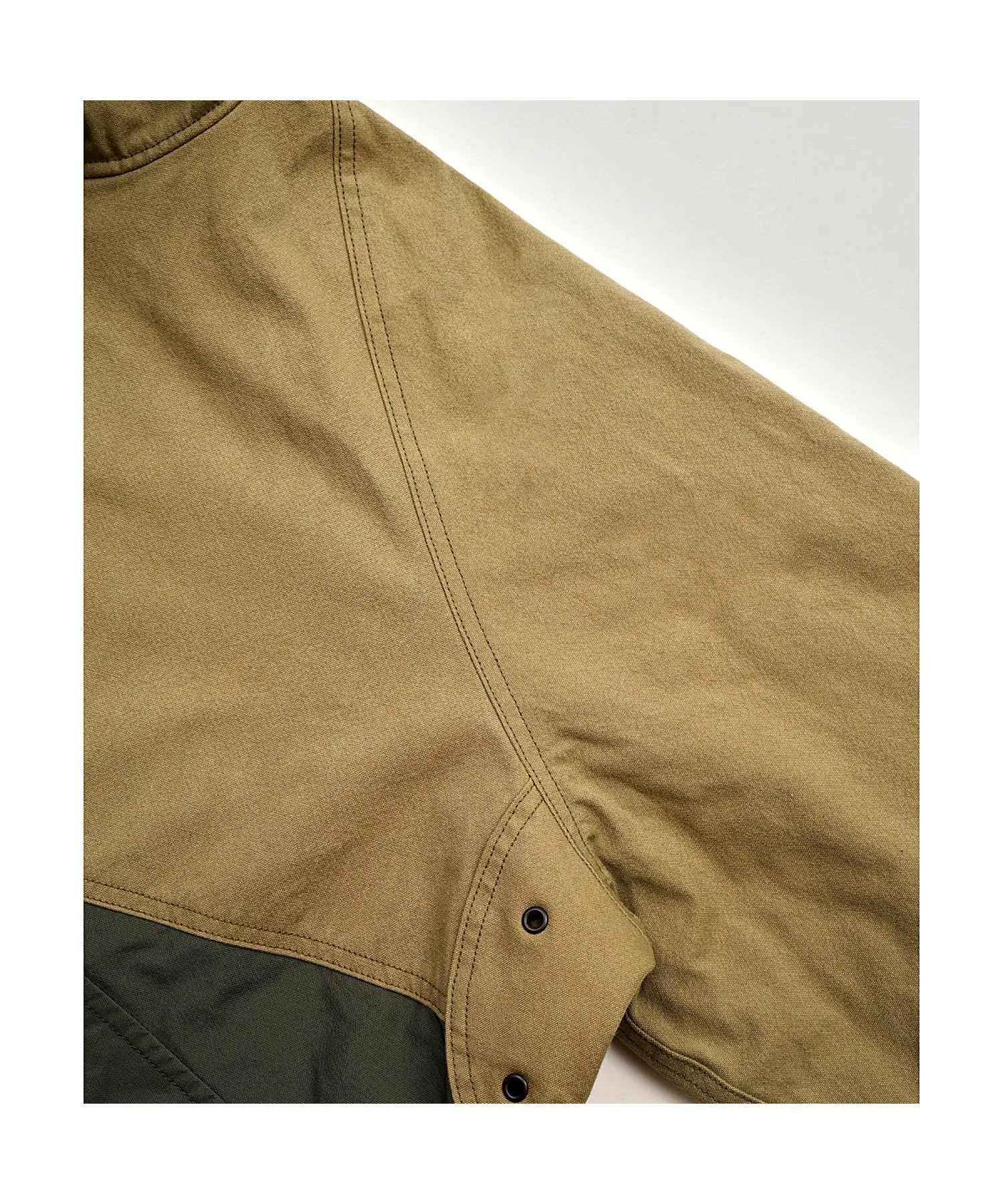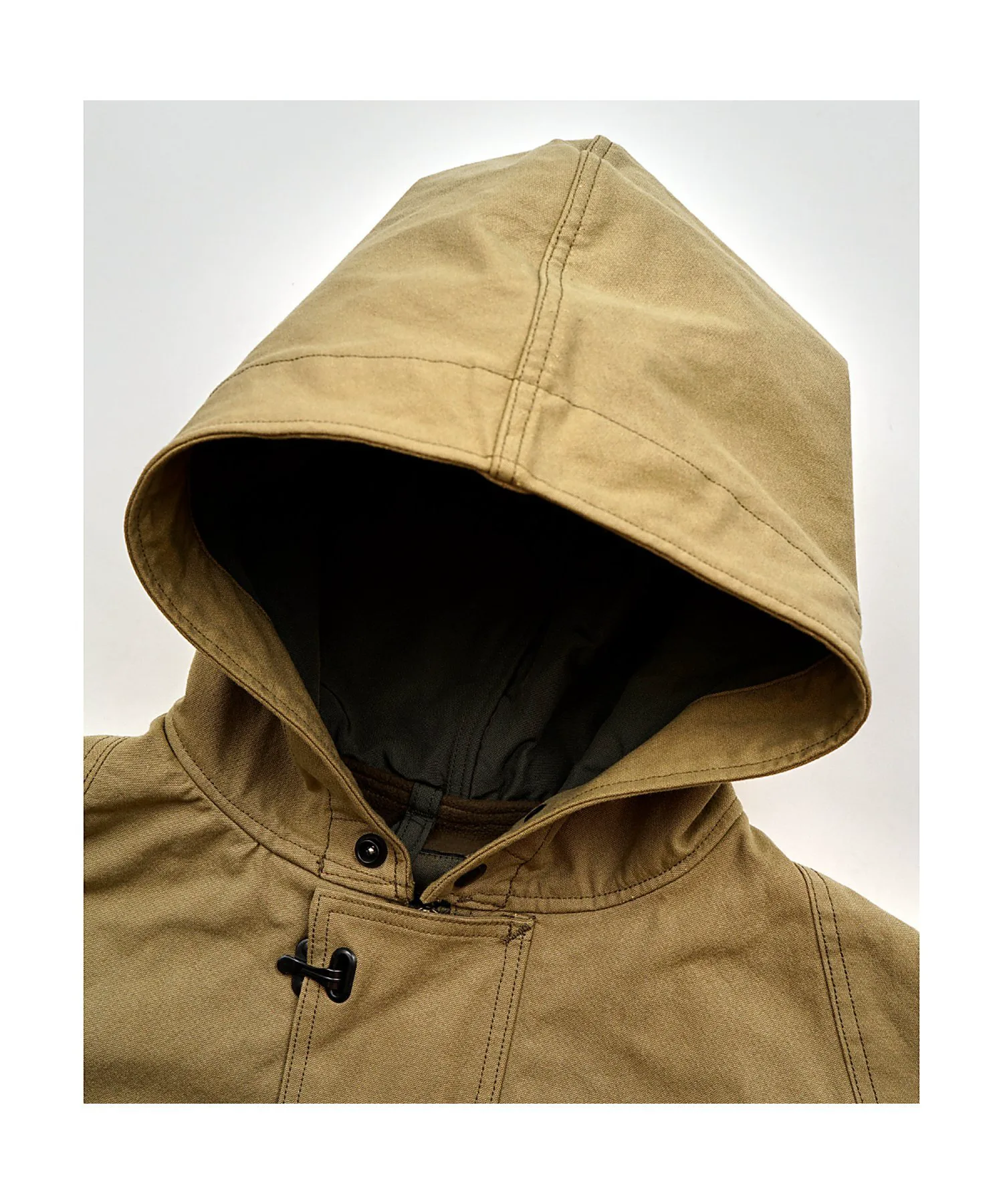 Эта модель, созданная на основе винтажной палубной куртки, искусно сочетает в себе различные элементы. Верхняя часть выполнена из ткани Halftex с её уникальной текстурой, а нижняя — из специального полиэстера, отлично сохраняющего форму. Отличительная текстура и функциональность материалов поражают, в результате чего получается одежда, которая добавляет современный штрих к классическому военному дизайну. Кроме того, шнурки на капюшоне и подоле позволяют регулировать силуэт и обеспечивают улучшенную ветрозащиту. Оригинальная ткань Найджела Кабурна, «HALFTEX», — это высокоэффективный материал, разработанный в соответствии с концепцией «100% нейлон, максимально приближенный к хлопку». Нейлоновые нити, обычно представляющие собой длинные волокна, намеренно разрезаются на короткие волокна. Полая структура, создающая сердцевину, обеспечивает характерную пышность, ощущение сухости и текстуру, напоминающую натуральные материалы. Обладая естественной текстурой, неотличимой от нейлона на первый взгляд, она сохраняет преимущество нейлона в легкости. Как указано на этикетке, она примерно вдвое легче хлопка.