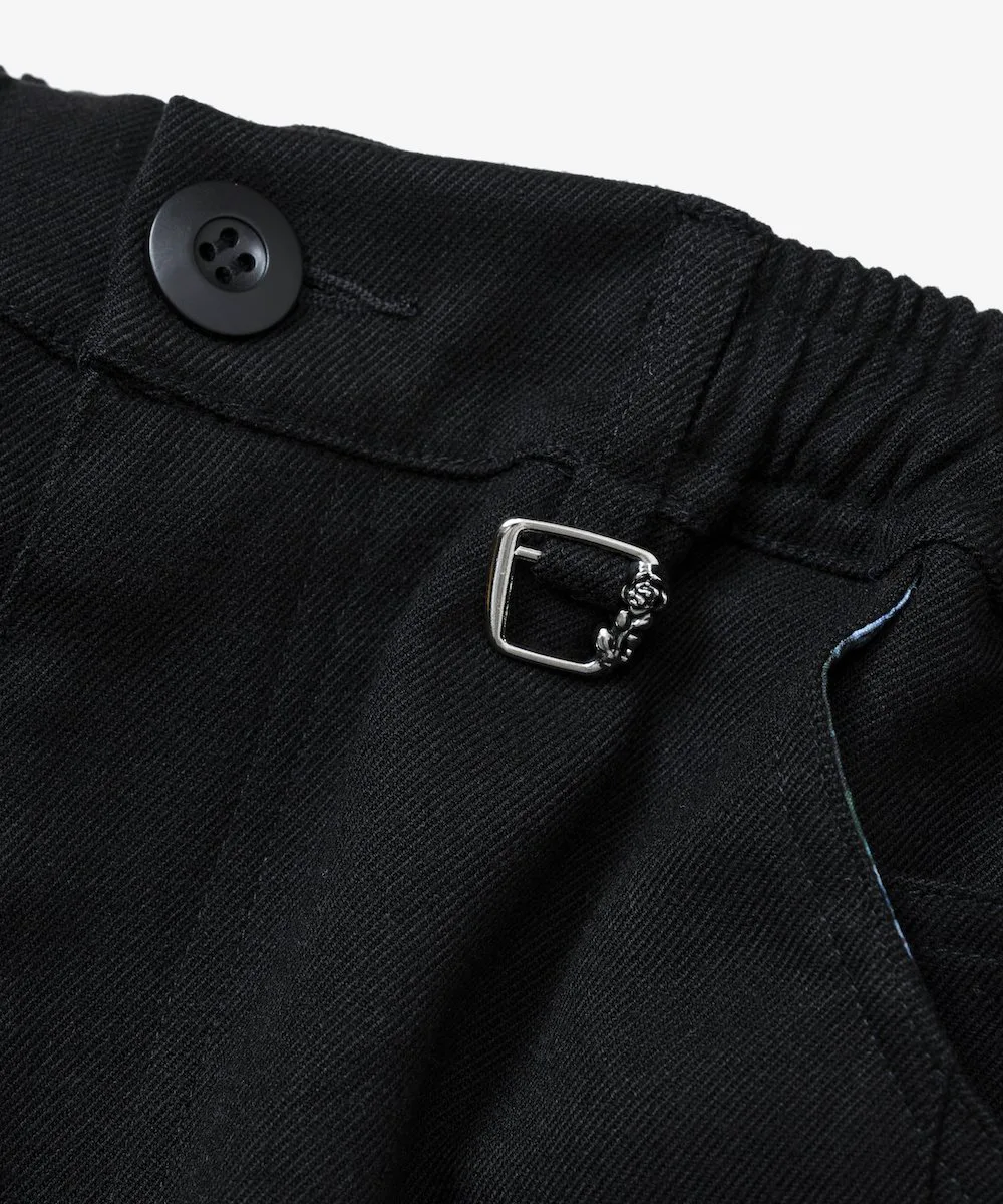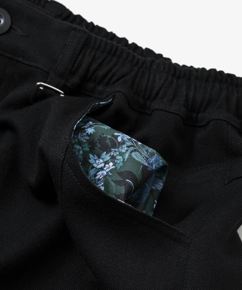 Подкладка передних карманов украшена оригинальным цветочным узором, а петли для ремня выполнены из специально разработанной металлической фурнитуры, что делает дизайн тщательно продуманным до мельчайших деталей. Брюки свободные от талии до бедер, сужающиеся к низу для создания обтекаемого силуэта. Несмотря на узкий крой, они спроектированы таким образом, чтобы быть свободными в разных местах, обеспечивая комфортную посадку.