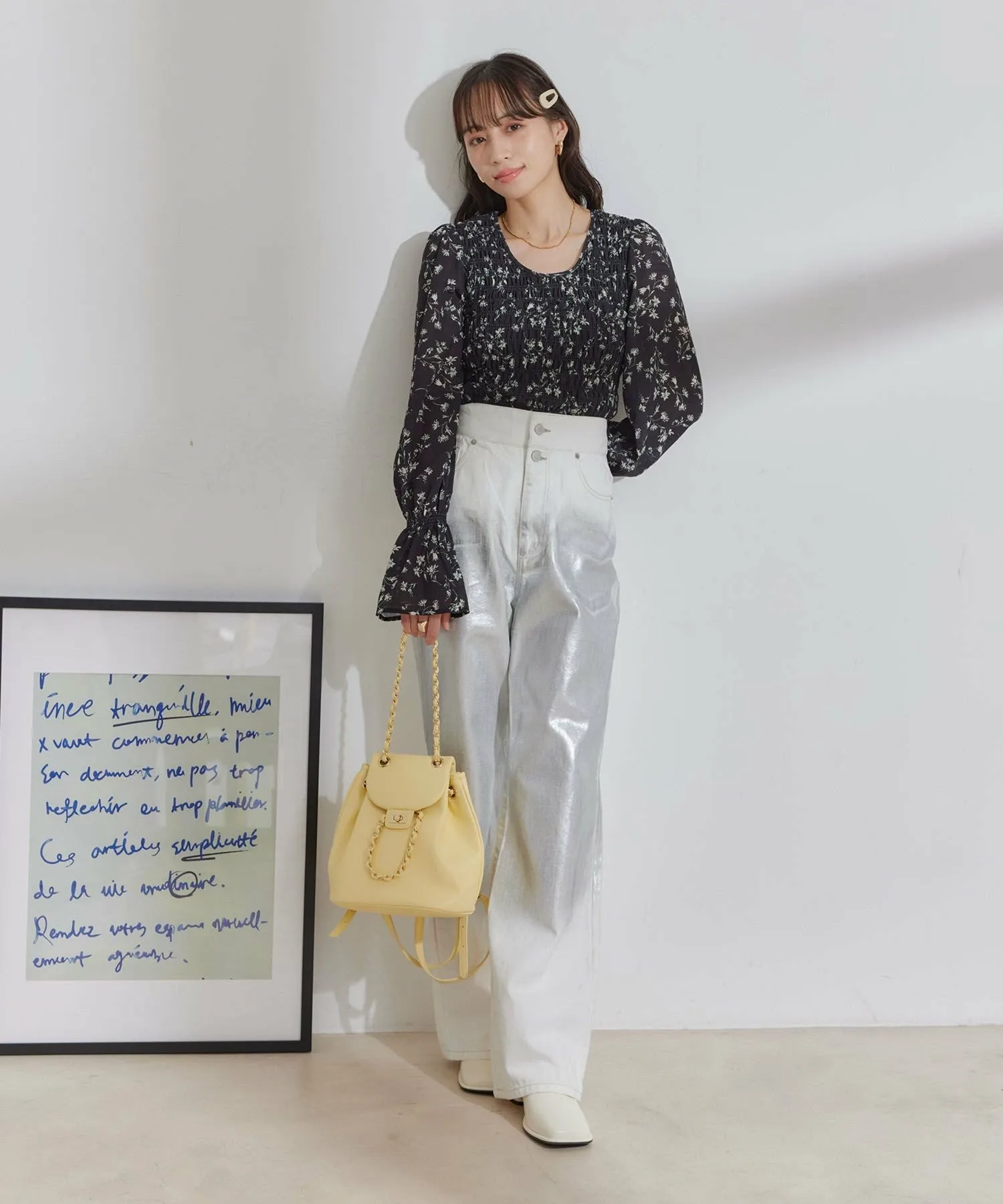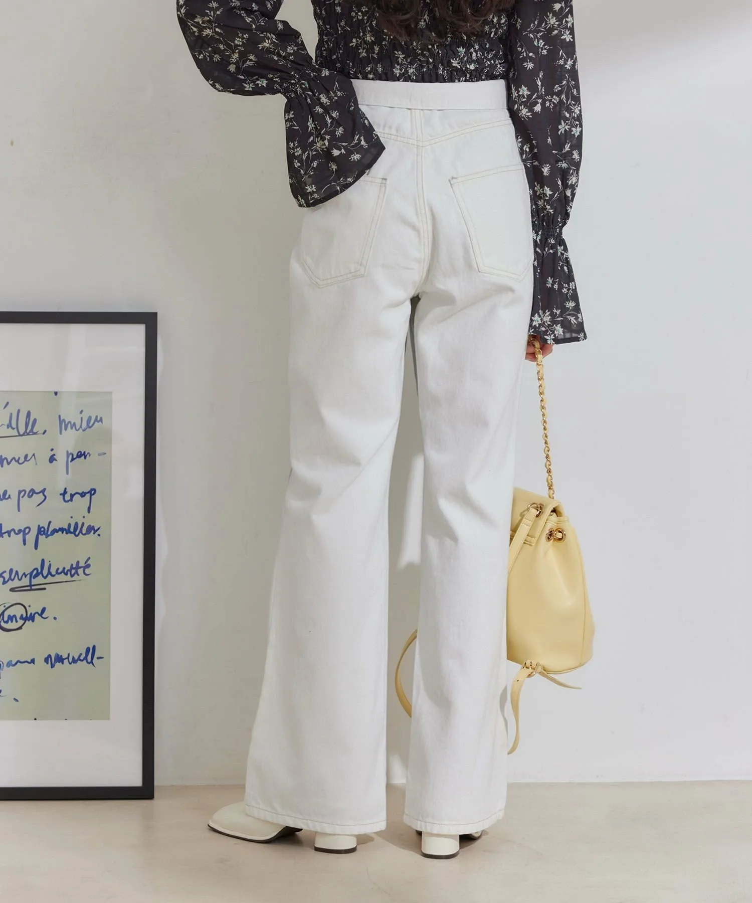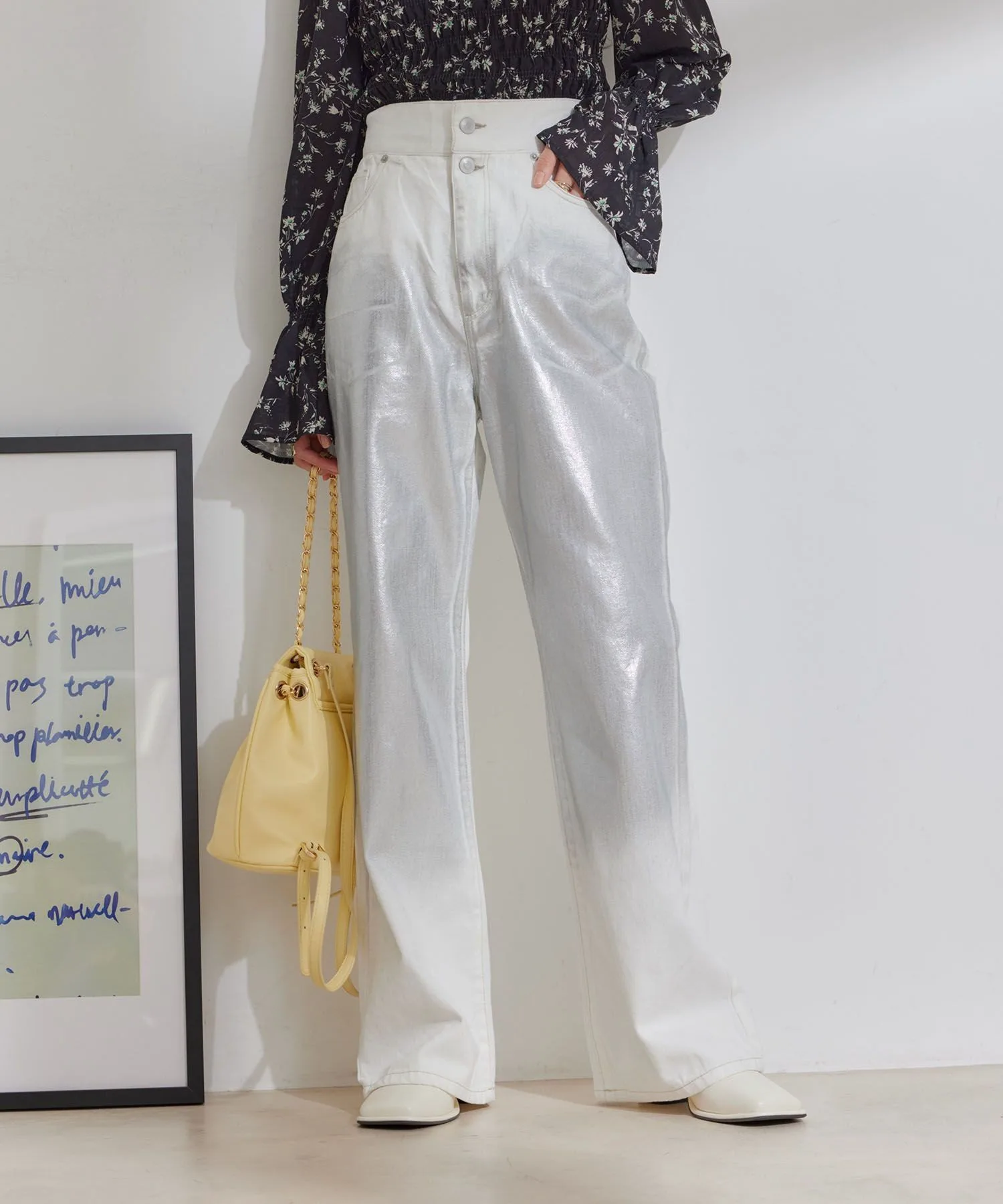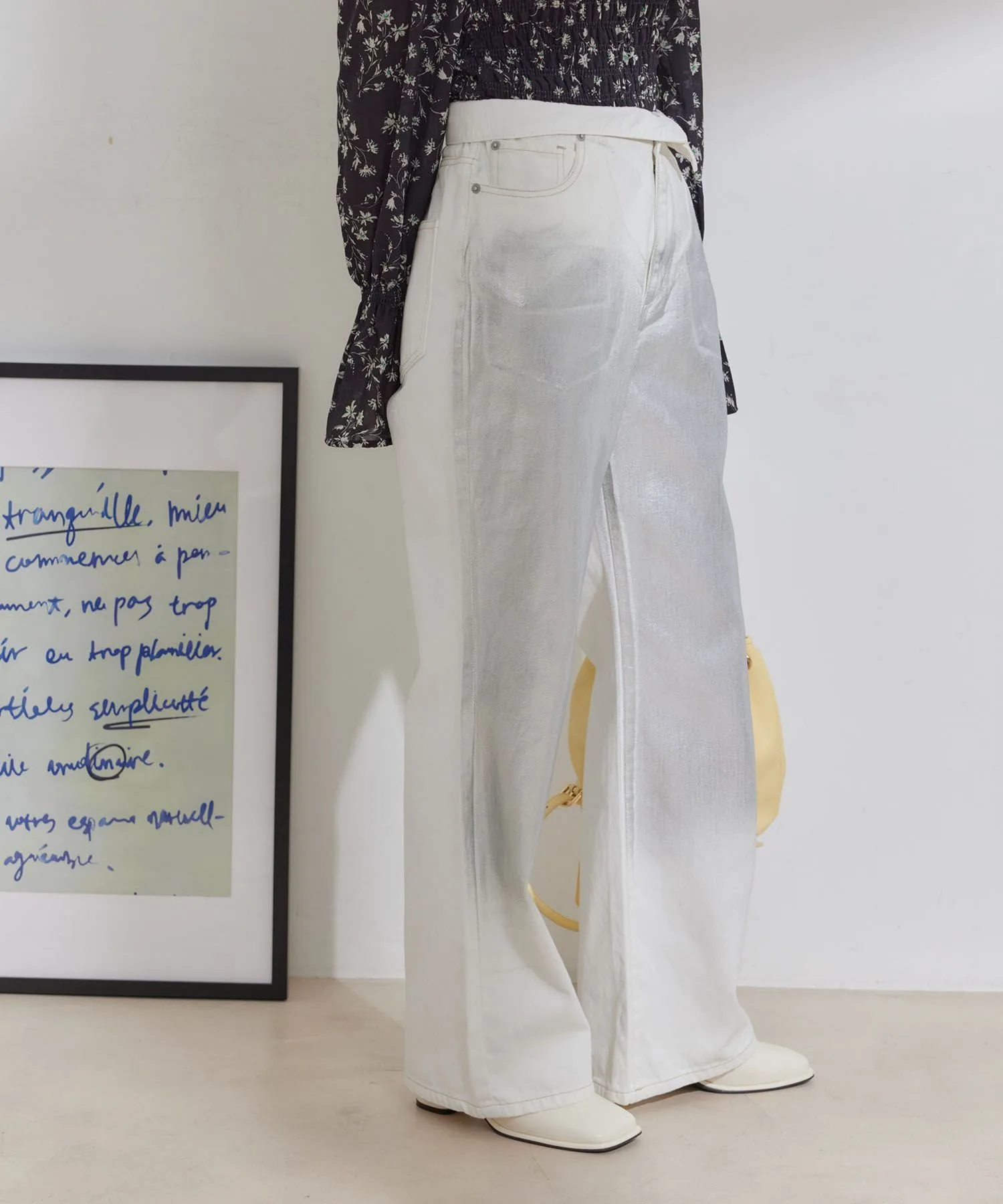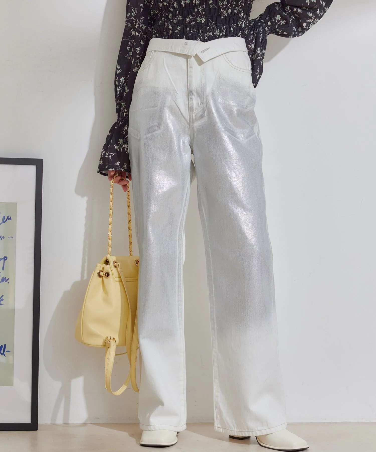Расклешенные джинсы с фольгированным принтом и подвернутой талией.