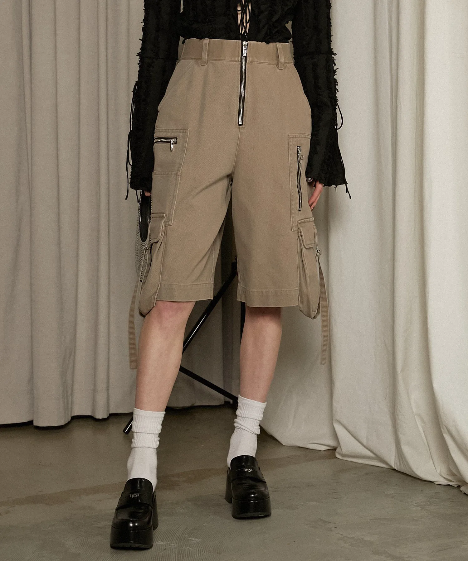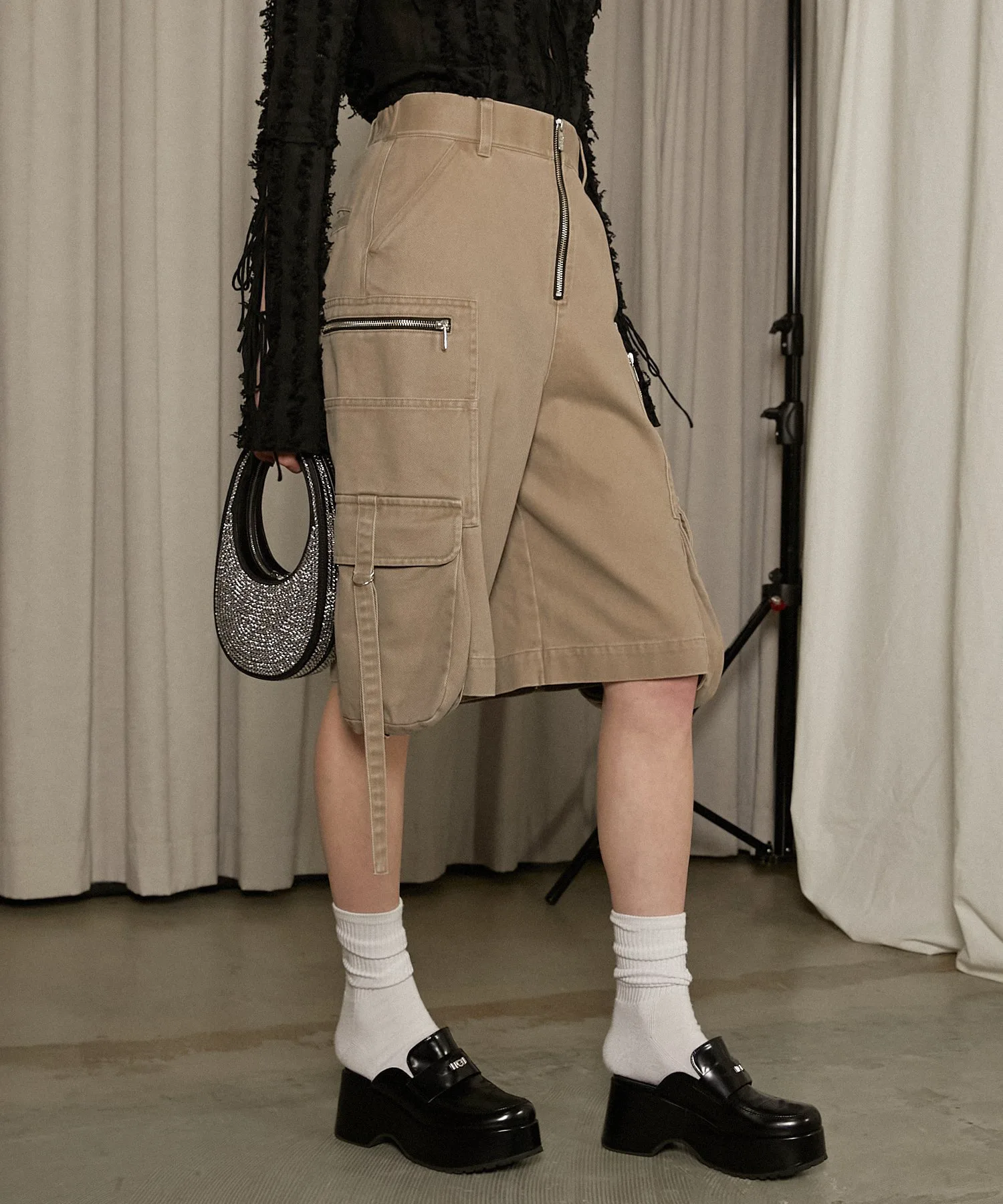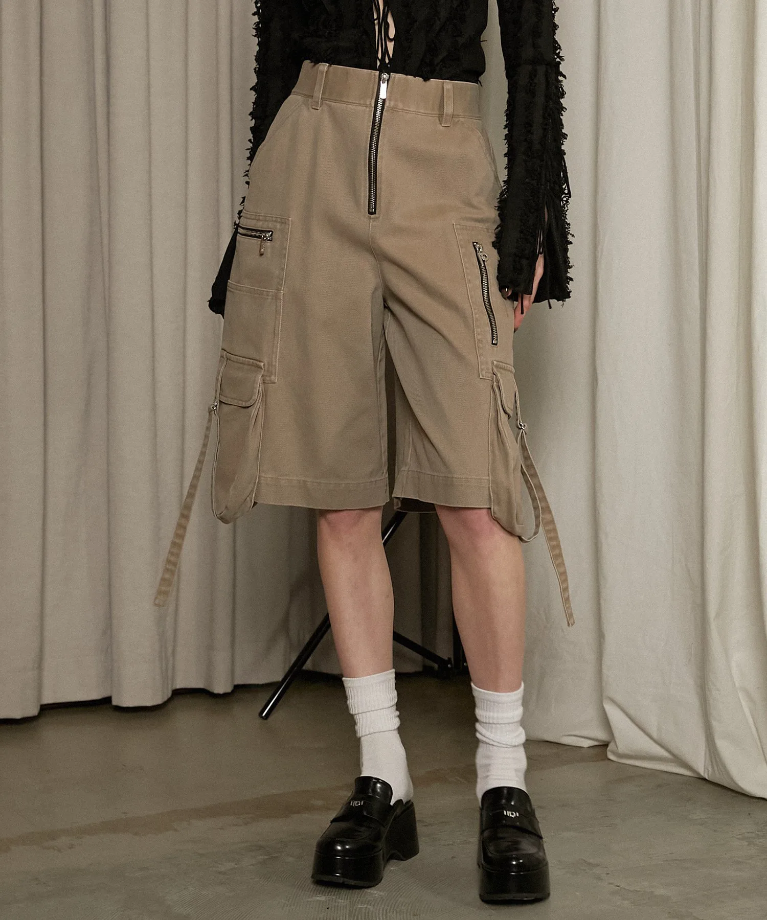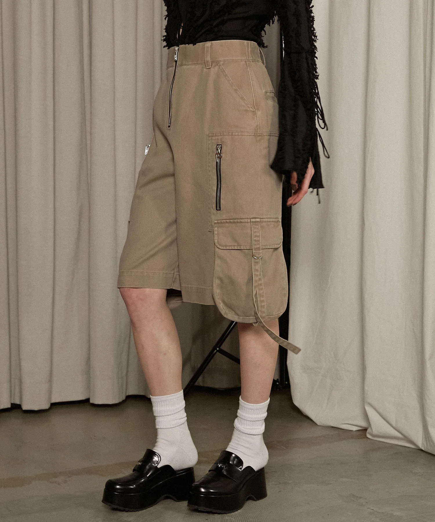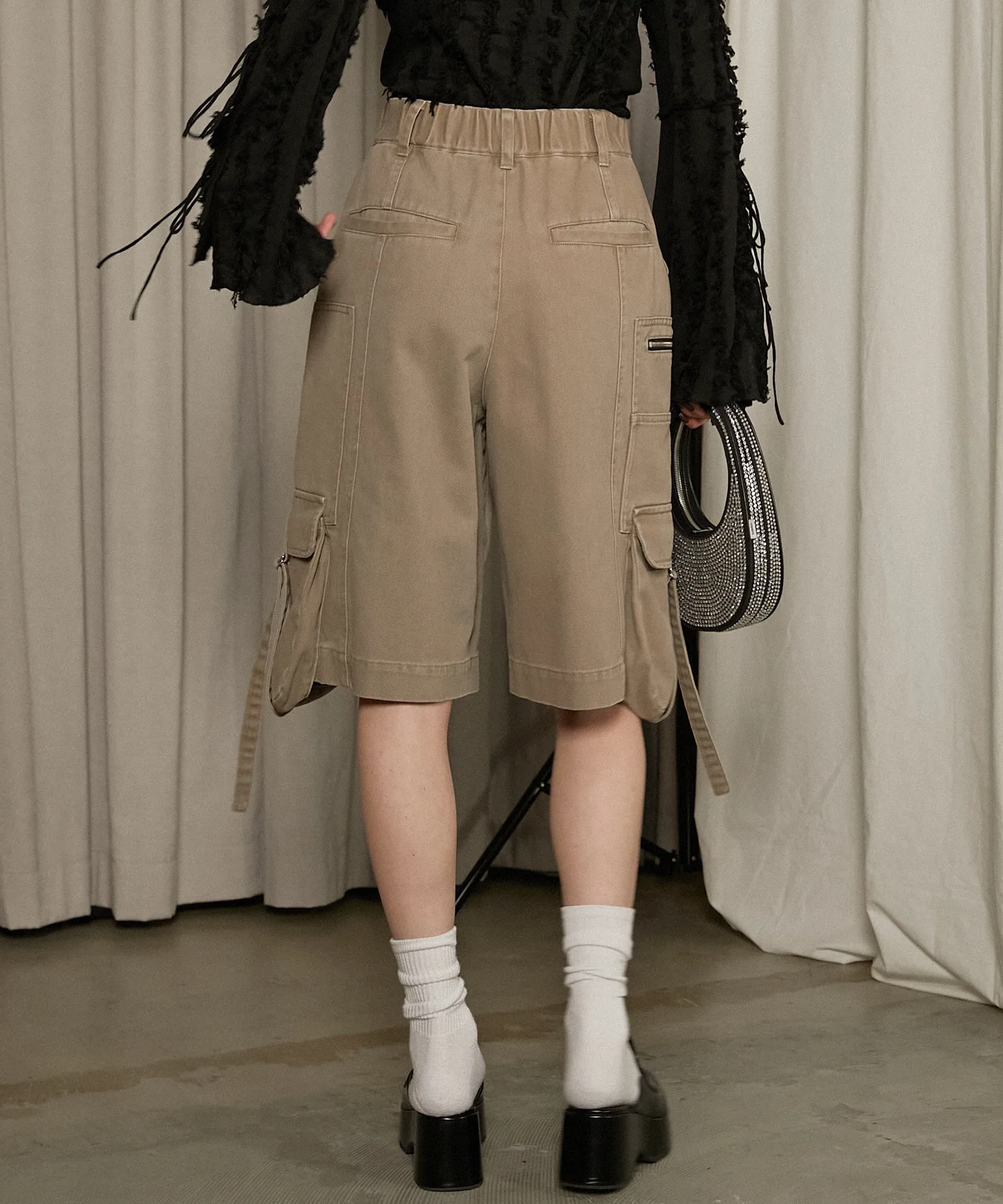 Металлические детали, такие как молнии и D-образные кольца, добавляют дерзости, делая эти шорты-карго подходящими для взрослых.
