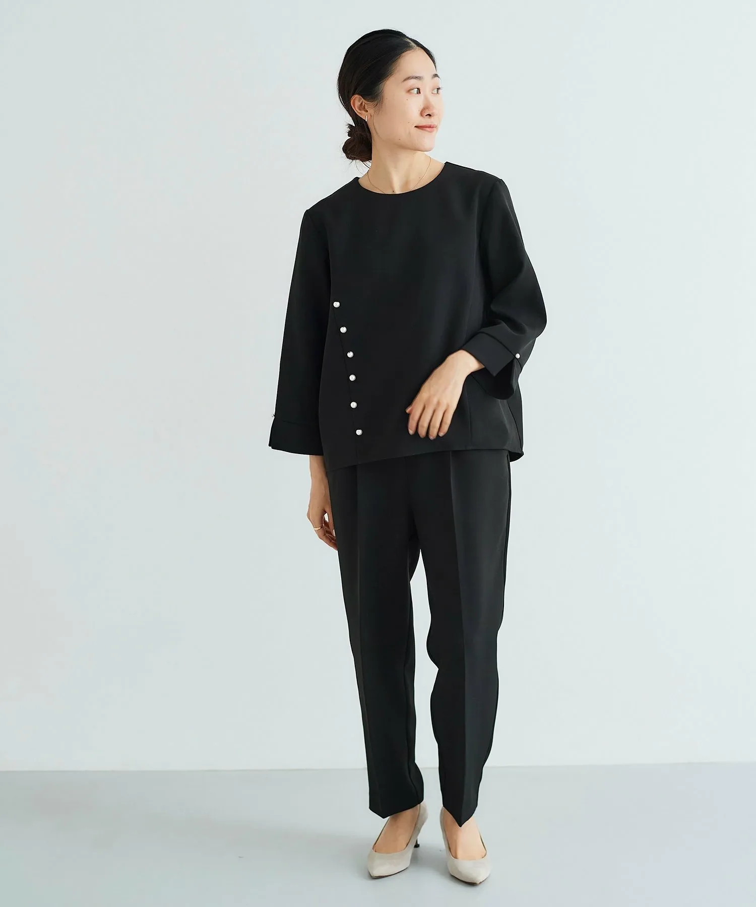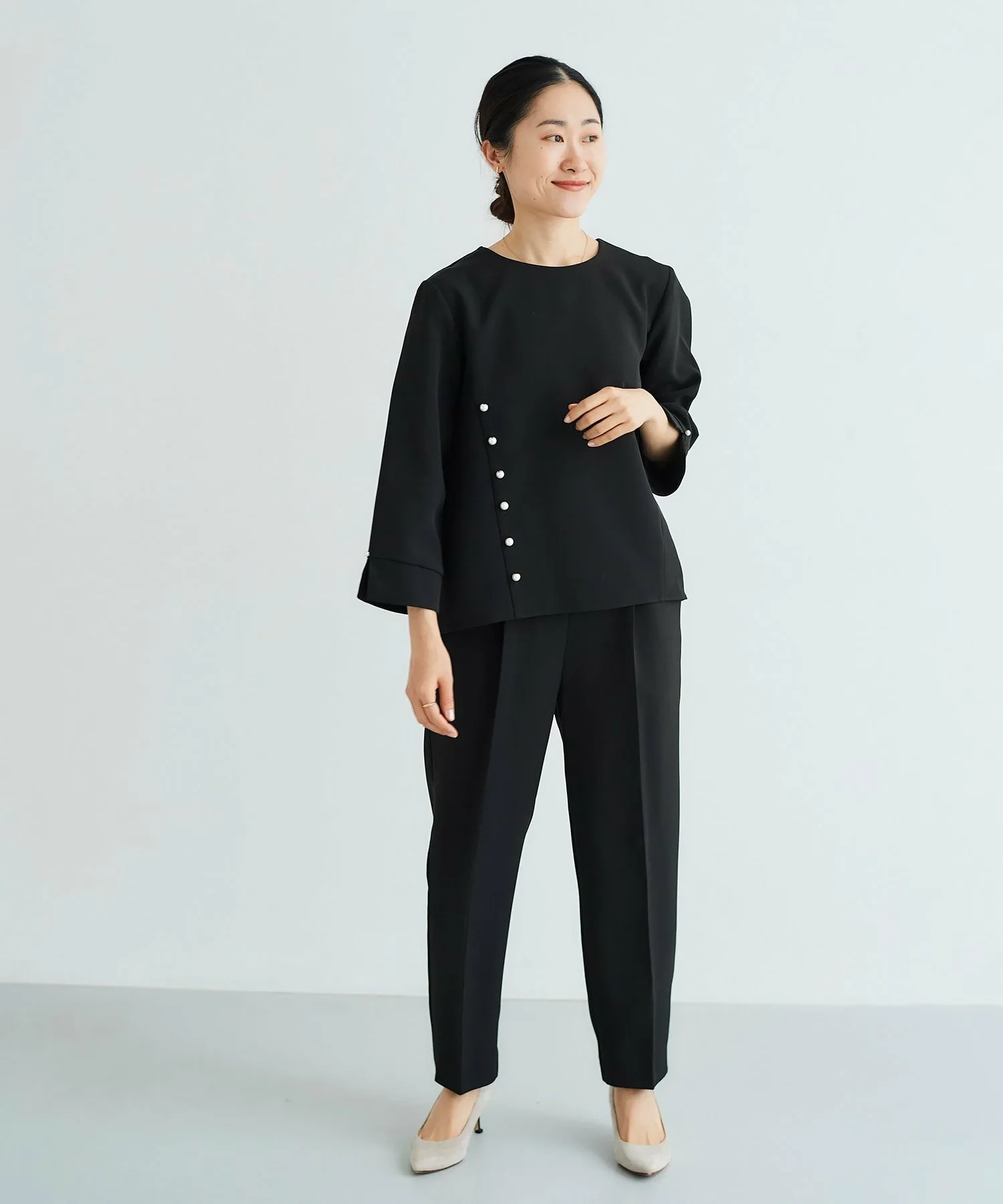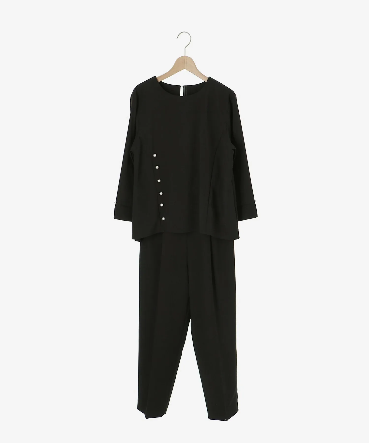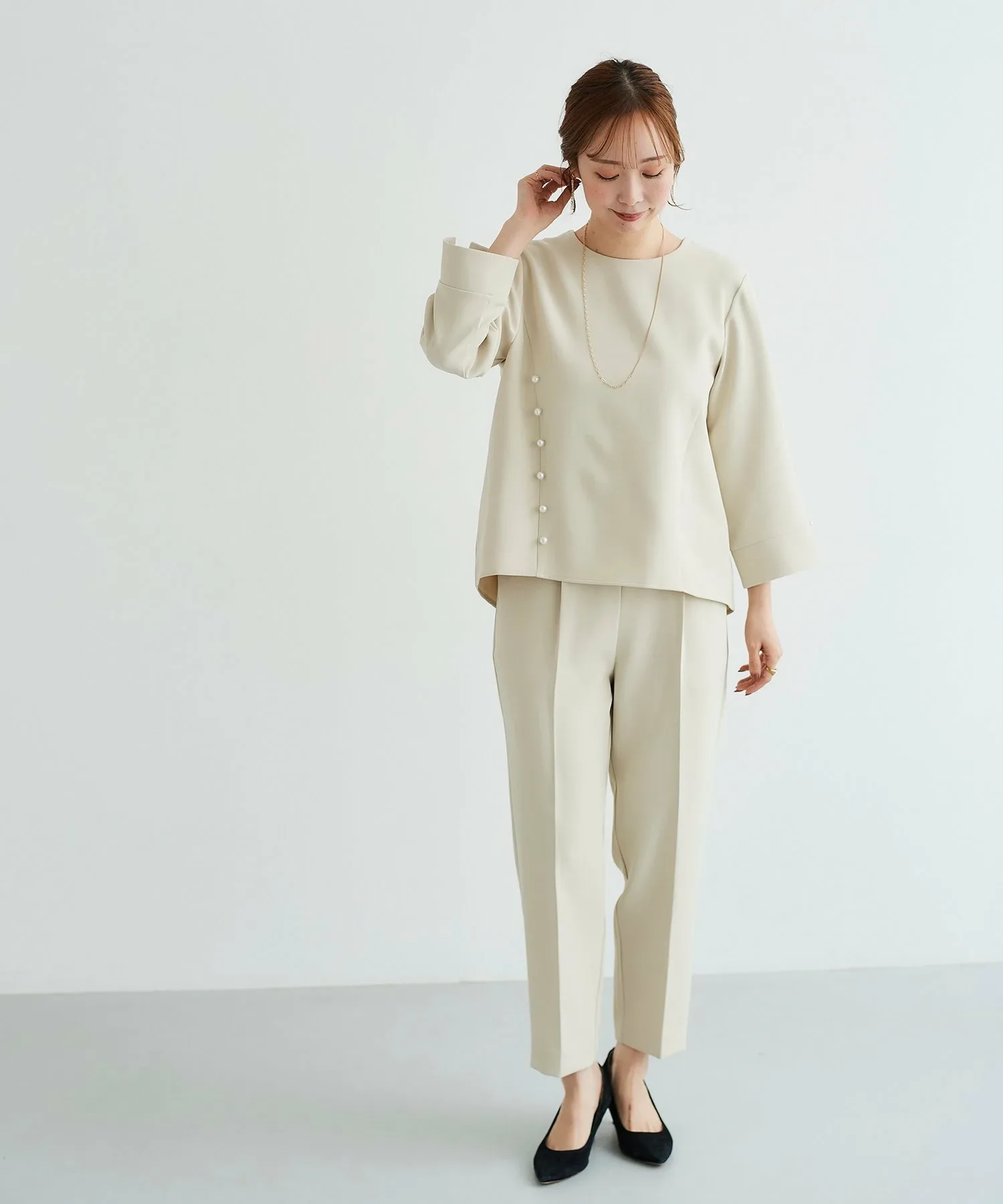 Этот комплект из двух предметов состоит из пуловера, украшенного жемчугом, и зауженных брюк. Топ имеет вырез на корпусе, создающий простой, но стильный дизайн. Крупные жемчужины спереди и более мелкие жемчужины на рукавах и пуговицах сзади создают изысканный и утонченный образ. Элегантные зауженные брюки имеют оптимальную посадку для комфорта.