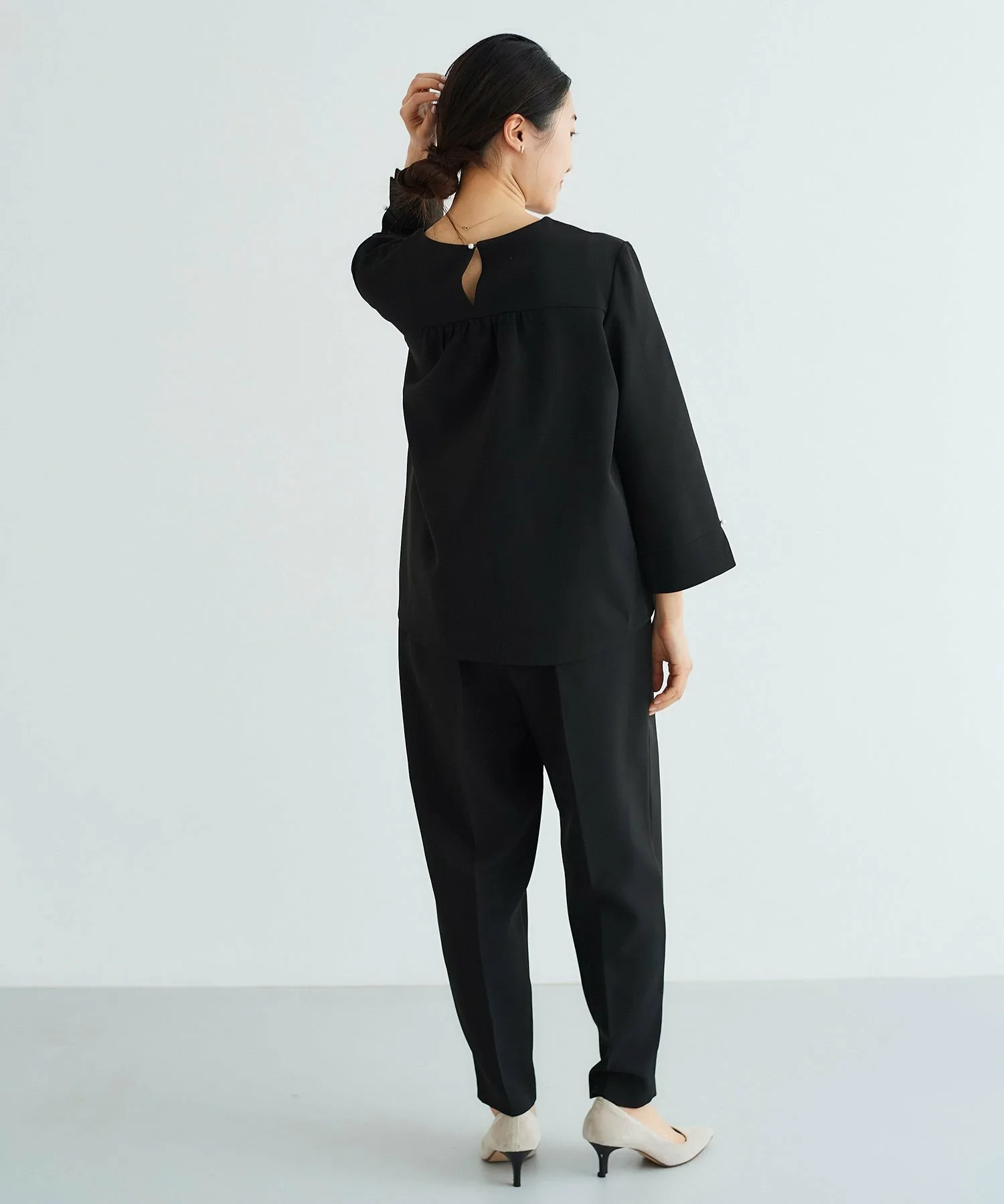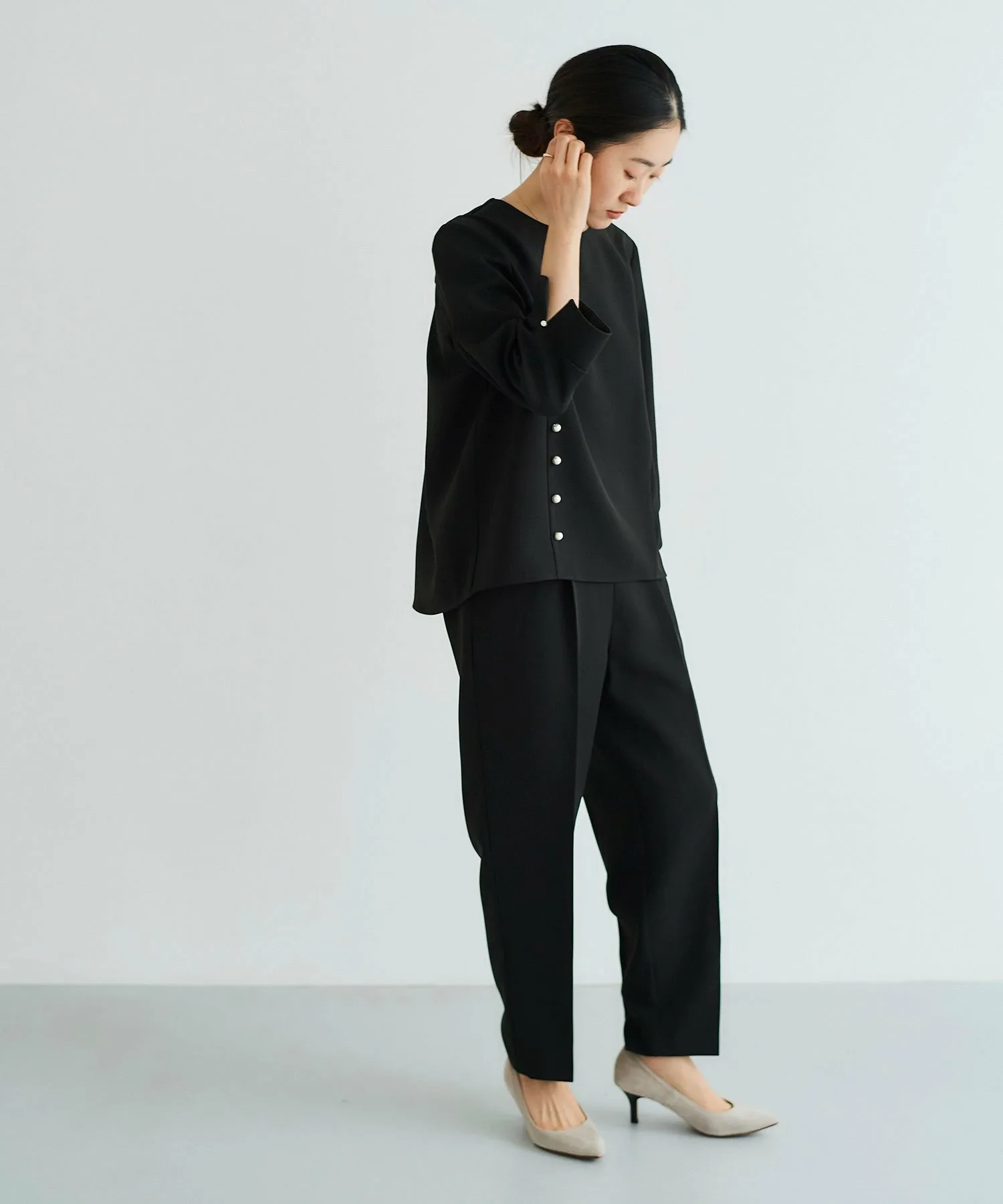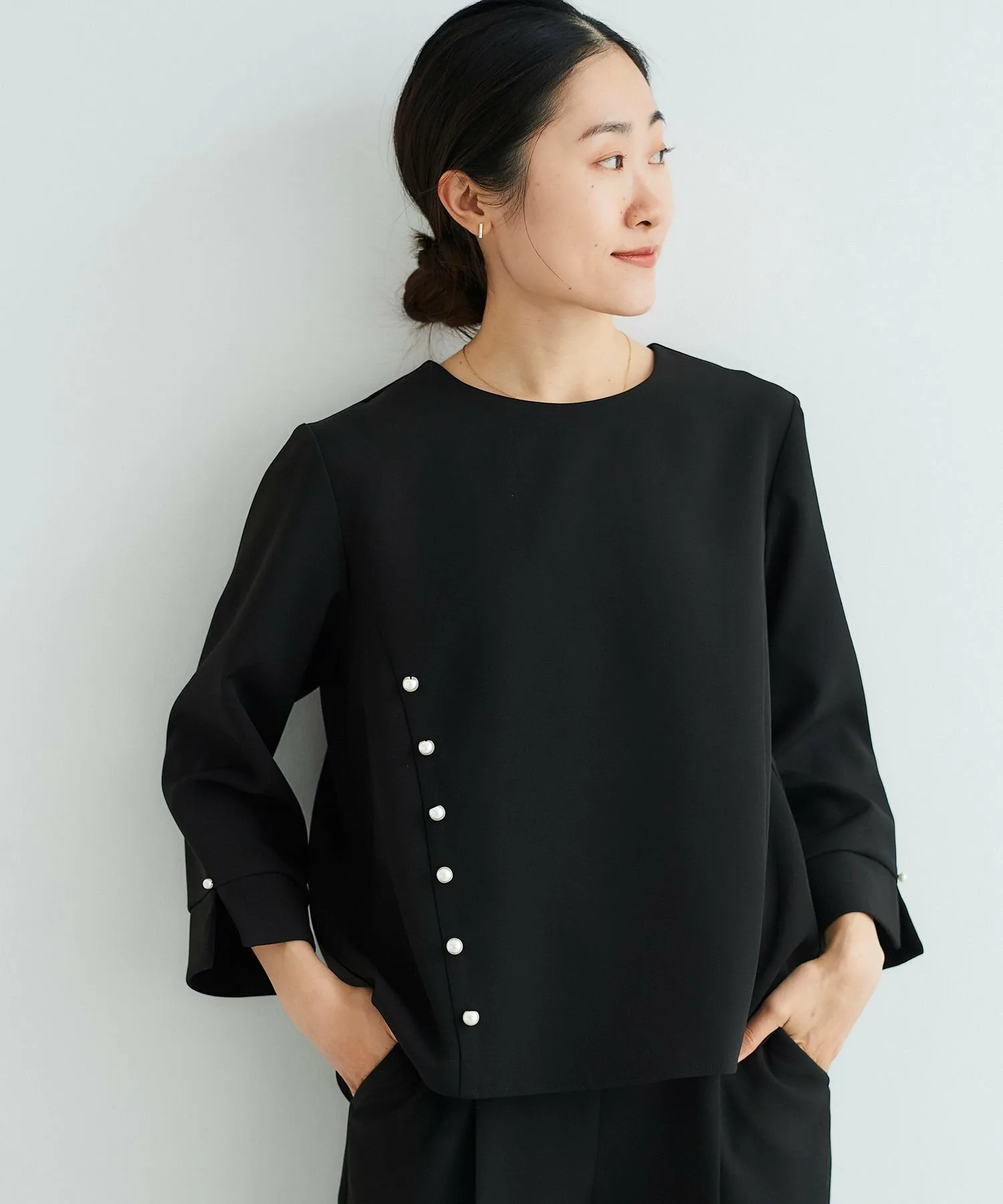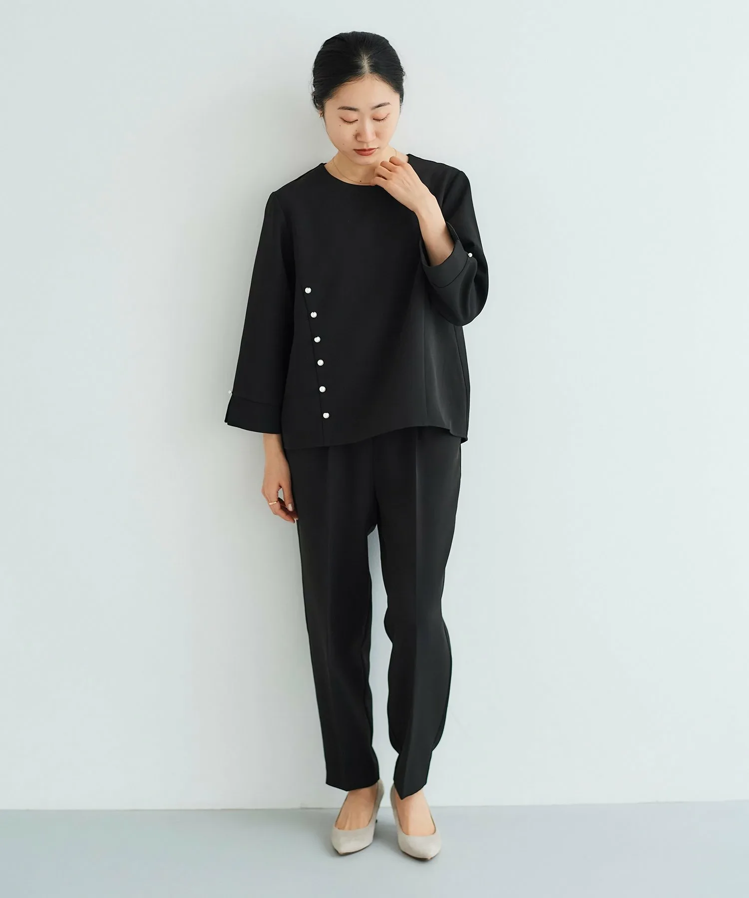 Этот комплект из двух предметов состоит из пуловера, украшенного жемчугом, и зауженных брюк. Топ имеет вырез на корпусе, создающий простой, но стильный дизайн. Крупные жемчужины спереди и более мелкие жемчужины на рукавах и пуговицах сзади создают изысканный и утонченный образ. Элегантные зауженные брюки имеют оптимальную посадку для комфорта.