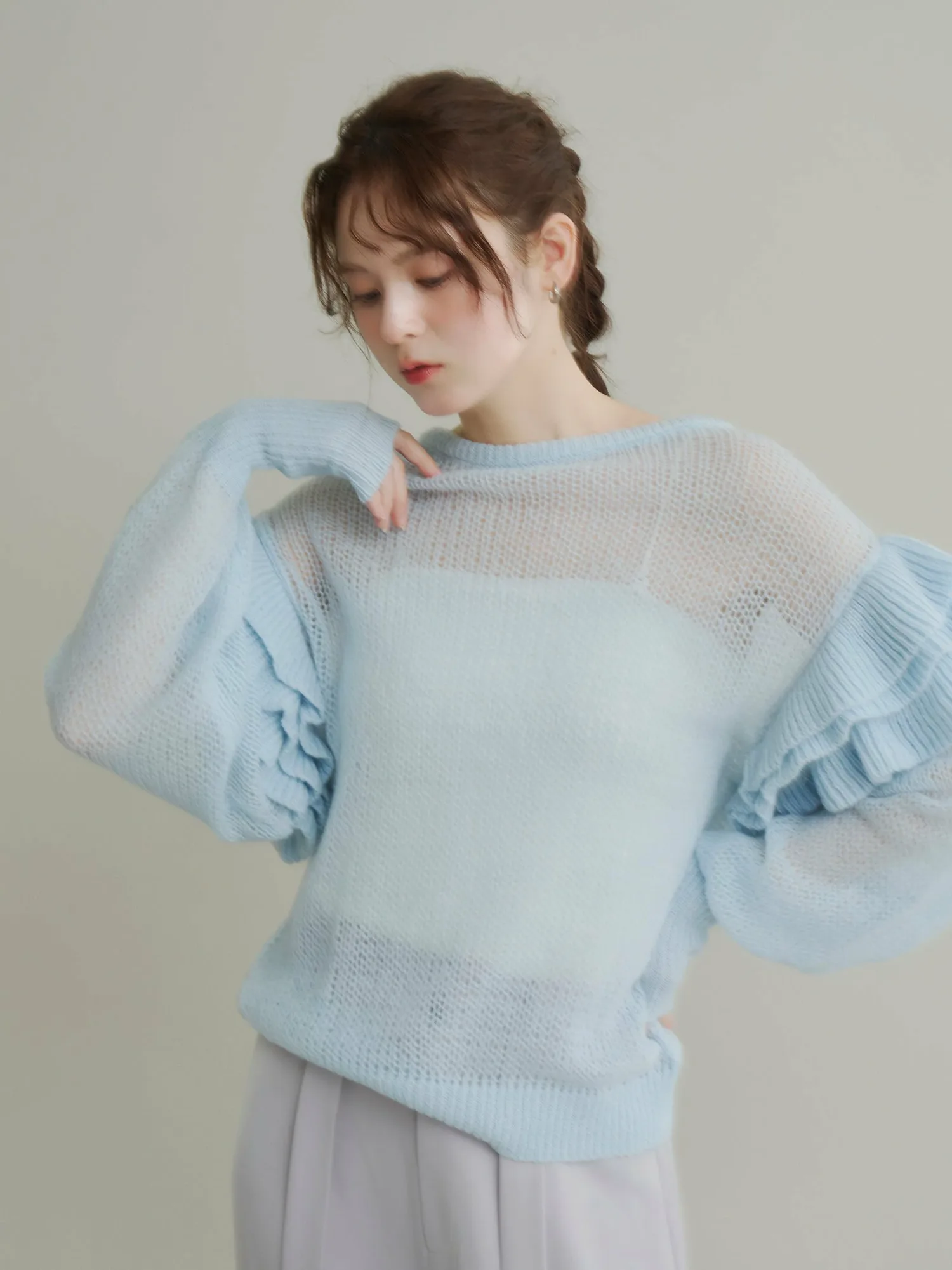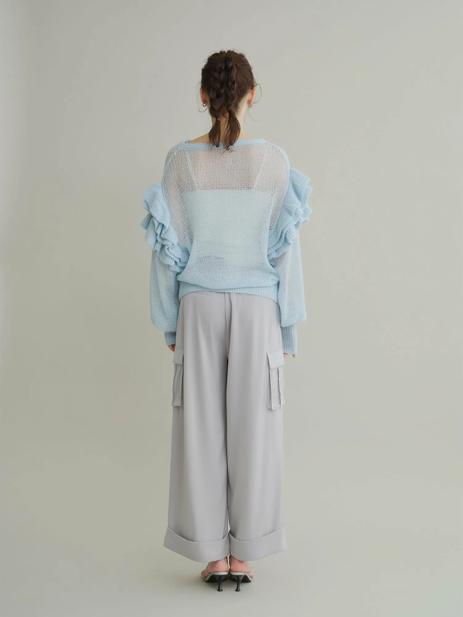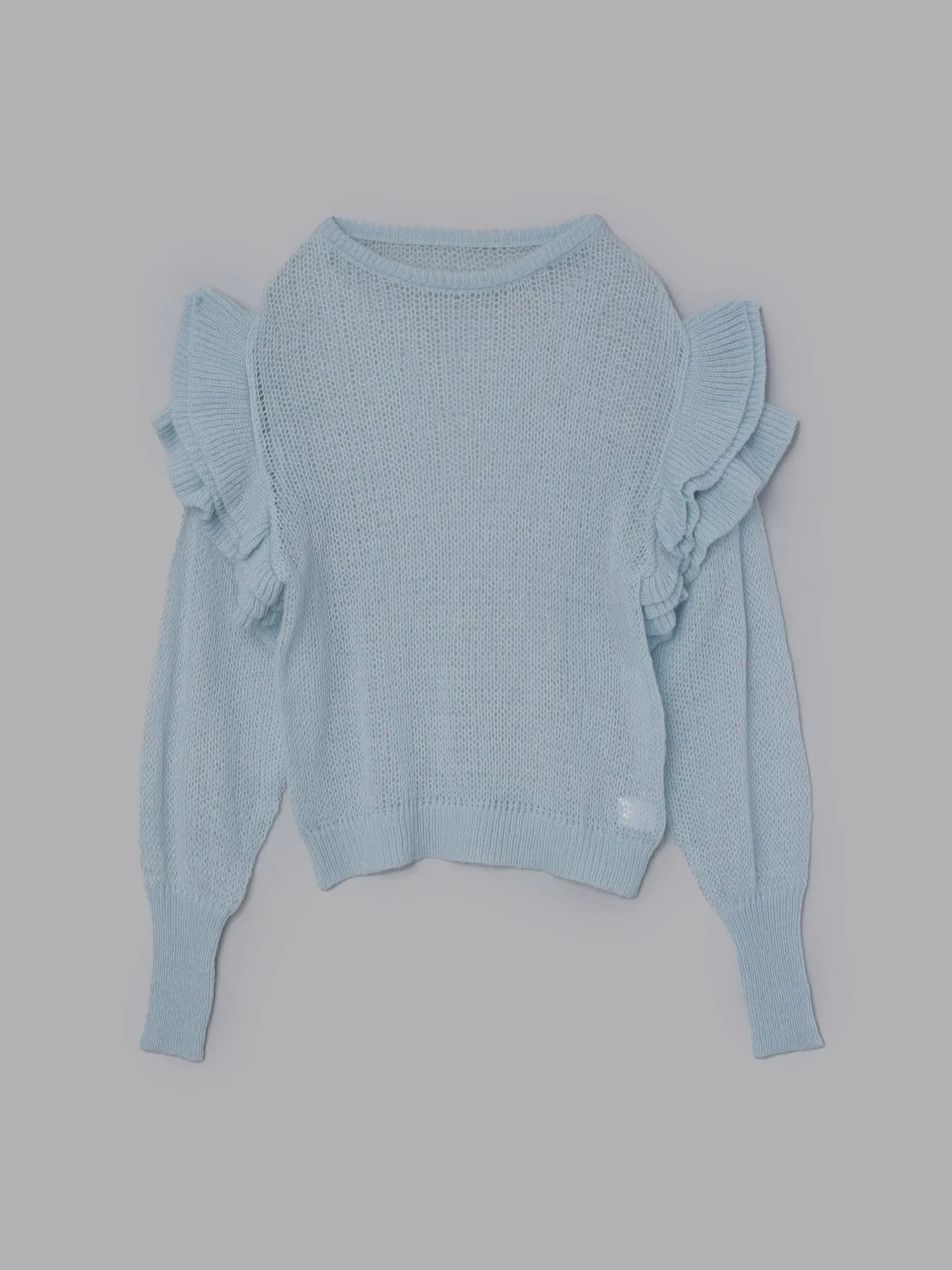 Этот полупрозрачный трикотаж украшен оборками на плечах, которые колышутся при каждом движении.