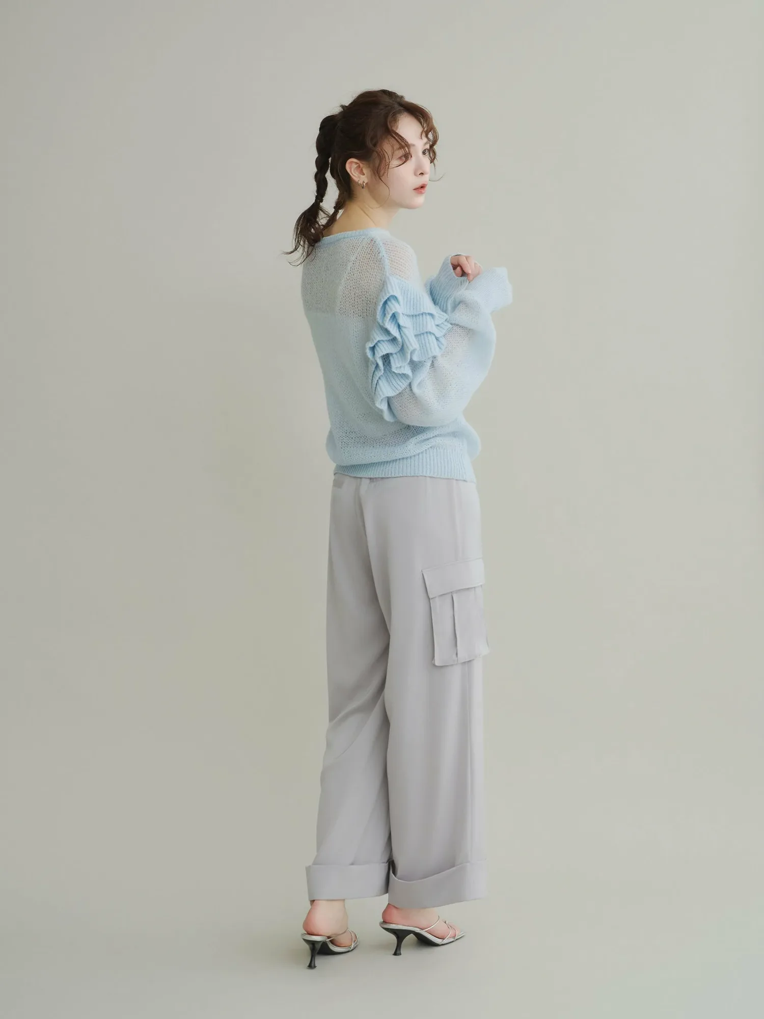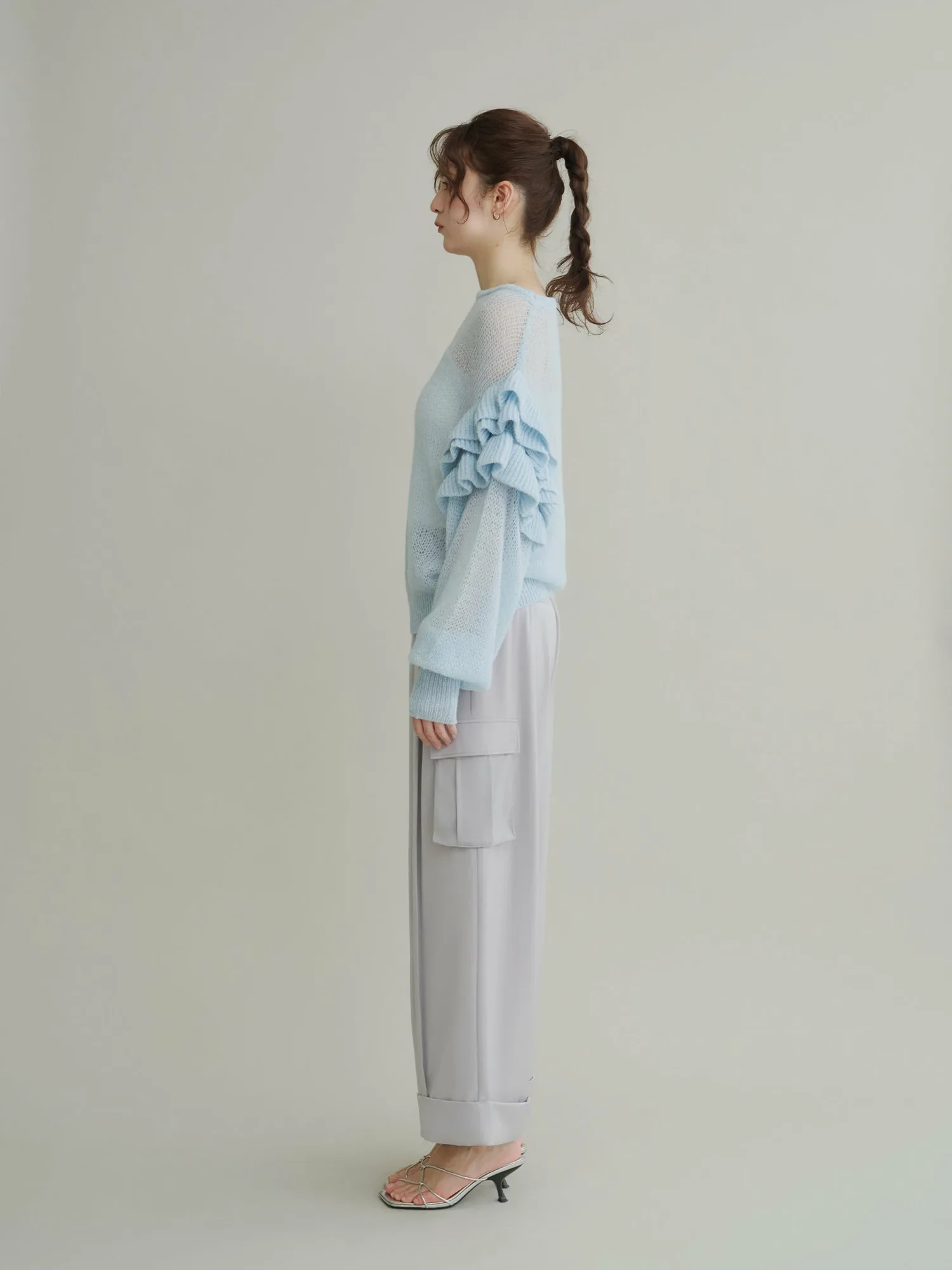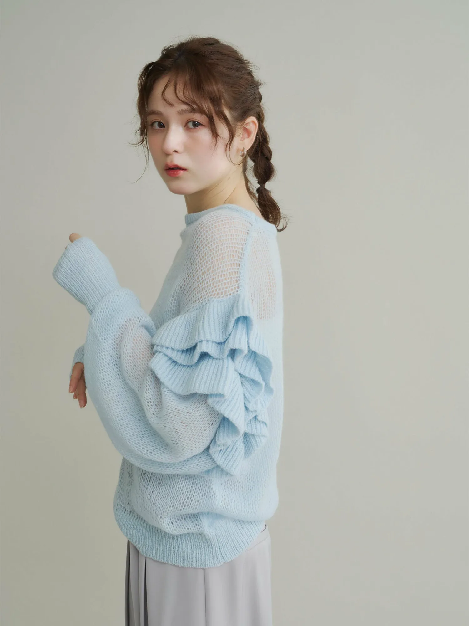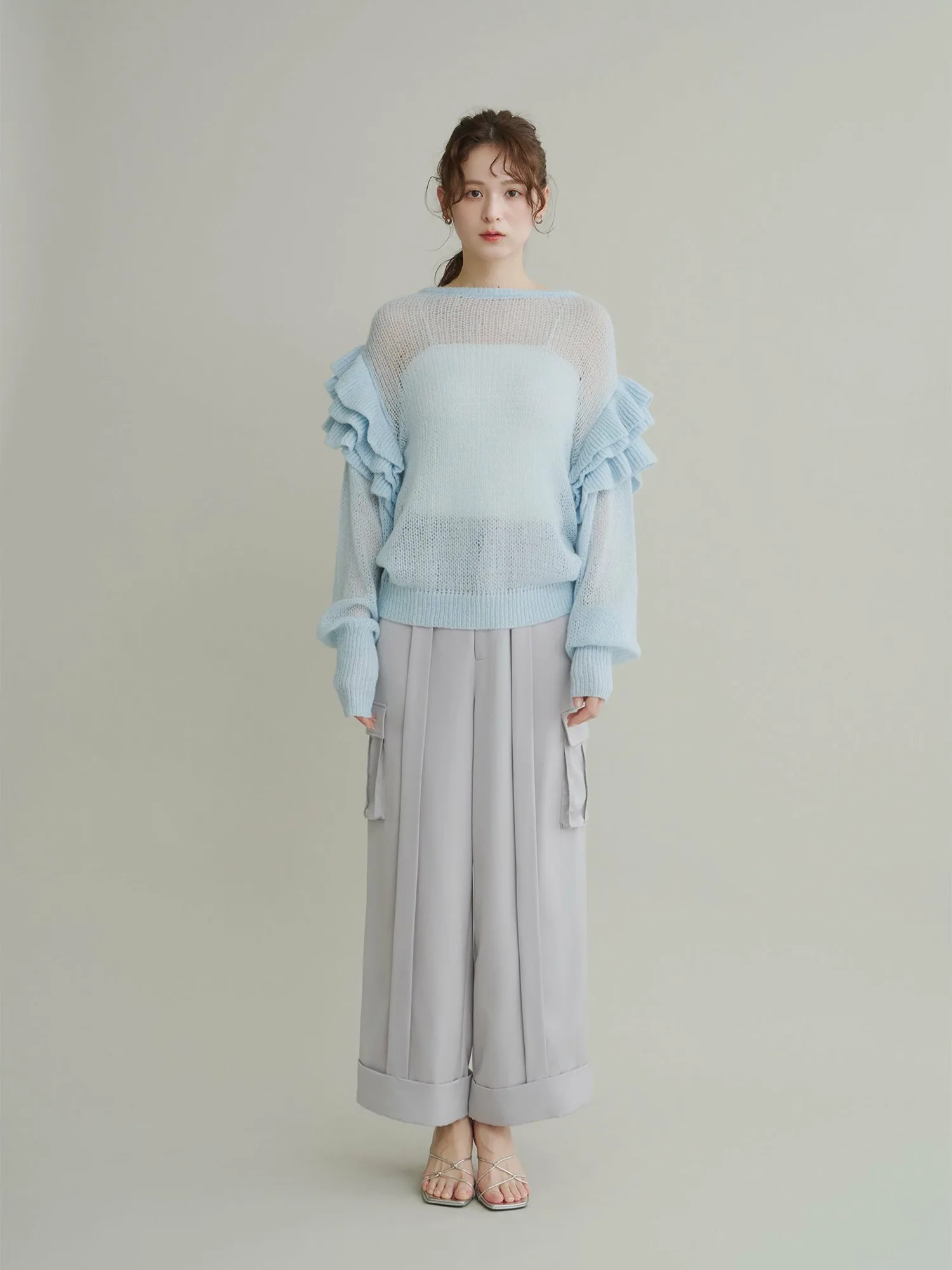 Этот полупрозрачный трикотаж украшен оборками на плечах, которые колышутся при каждом движении.