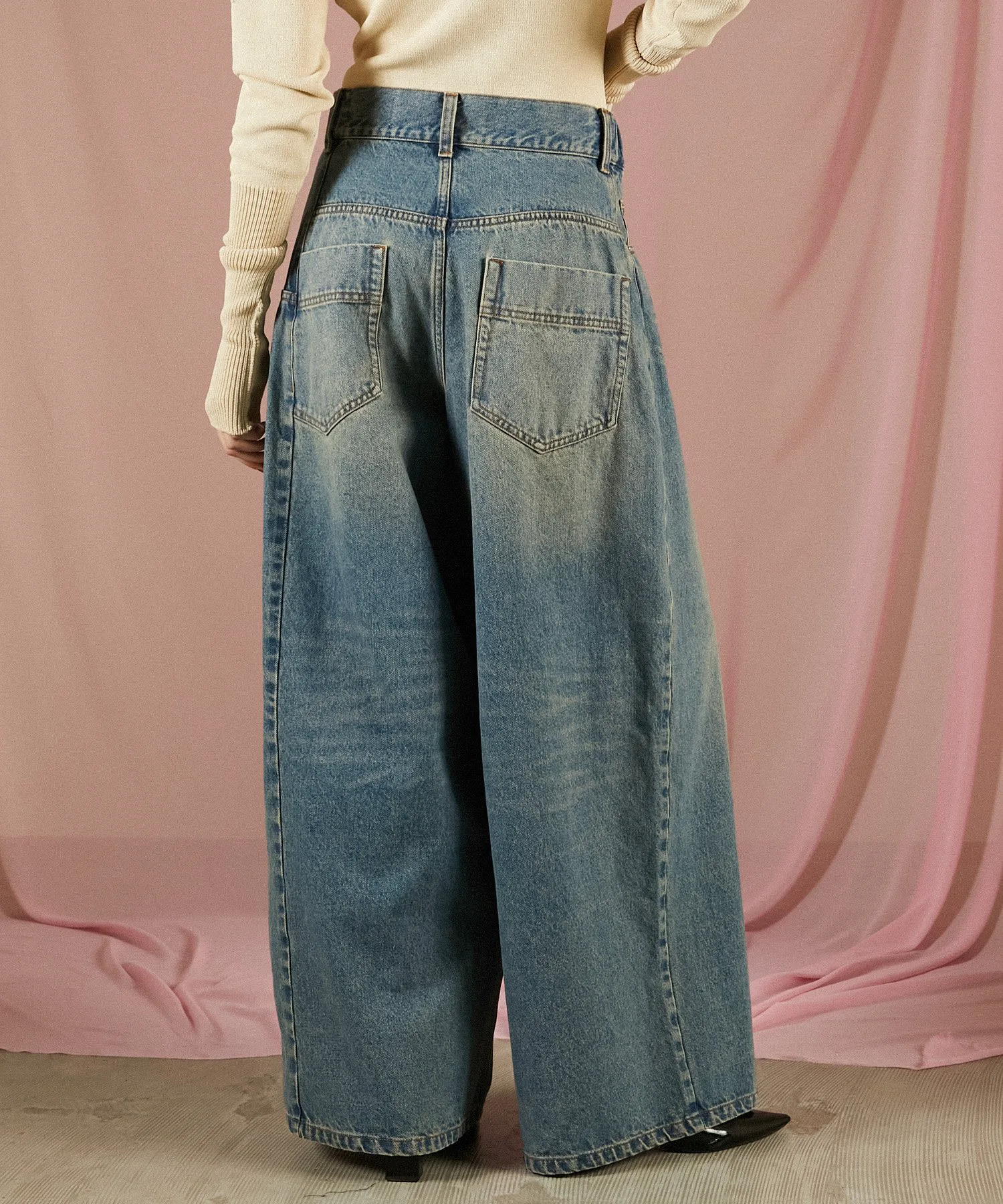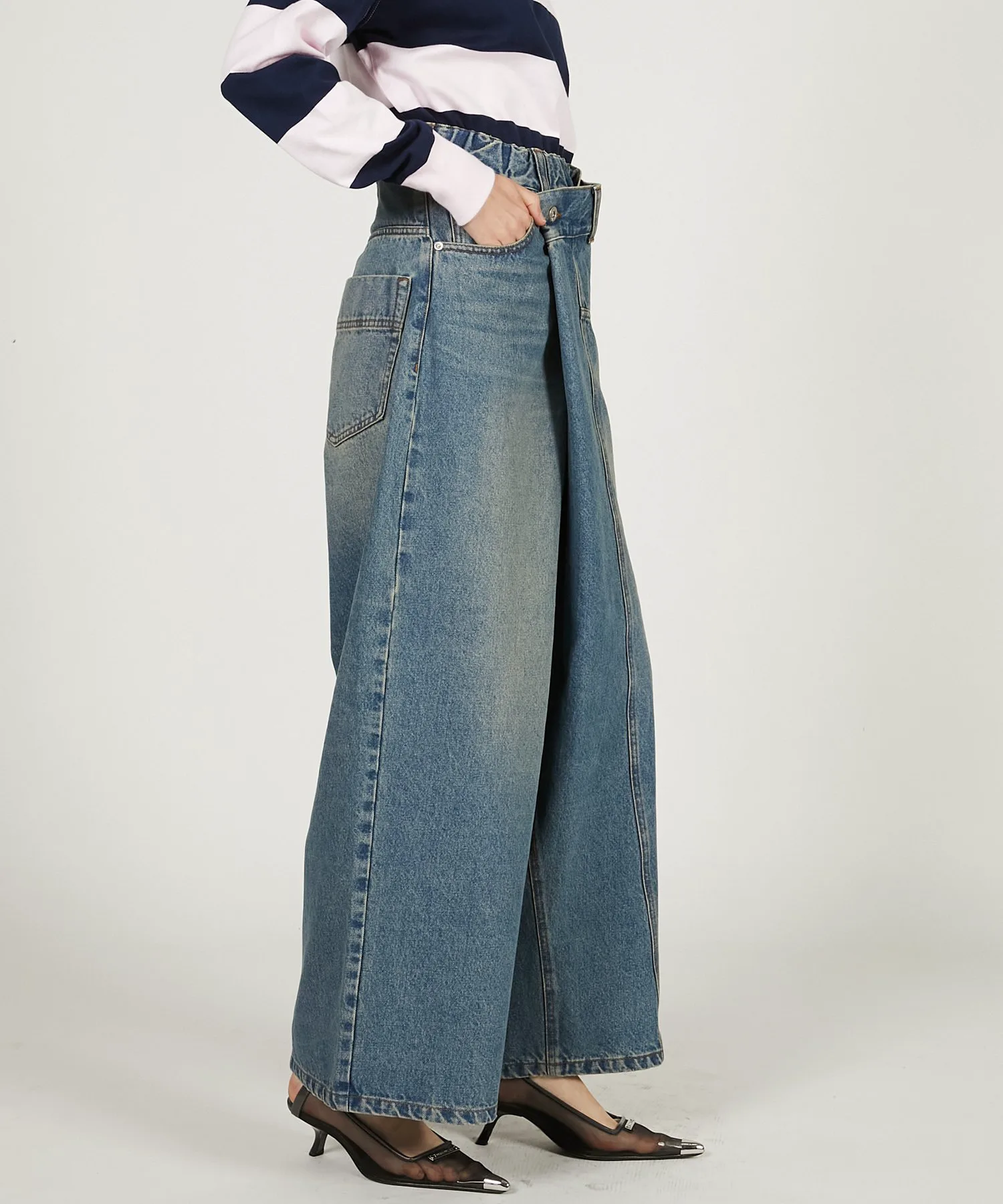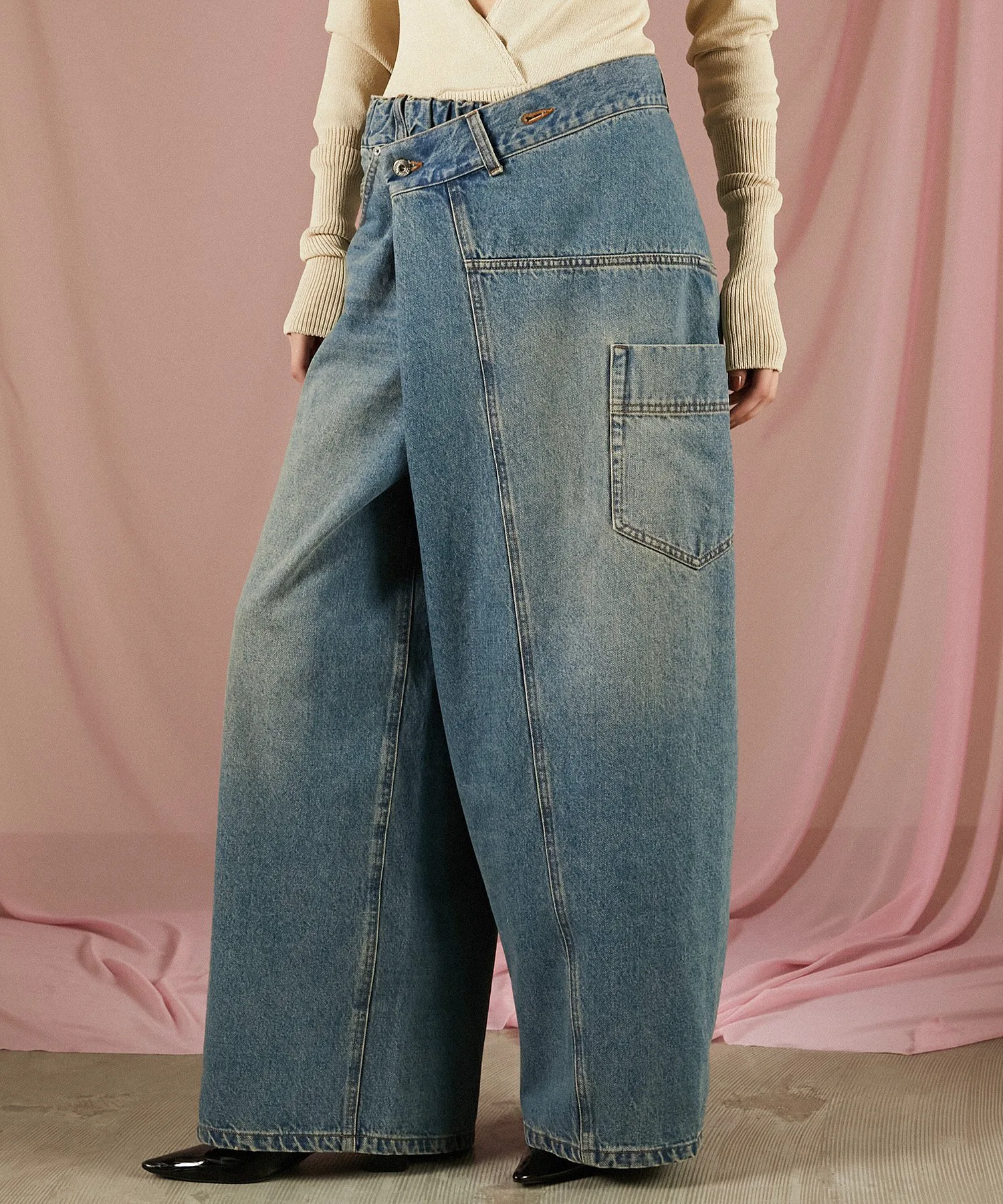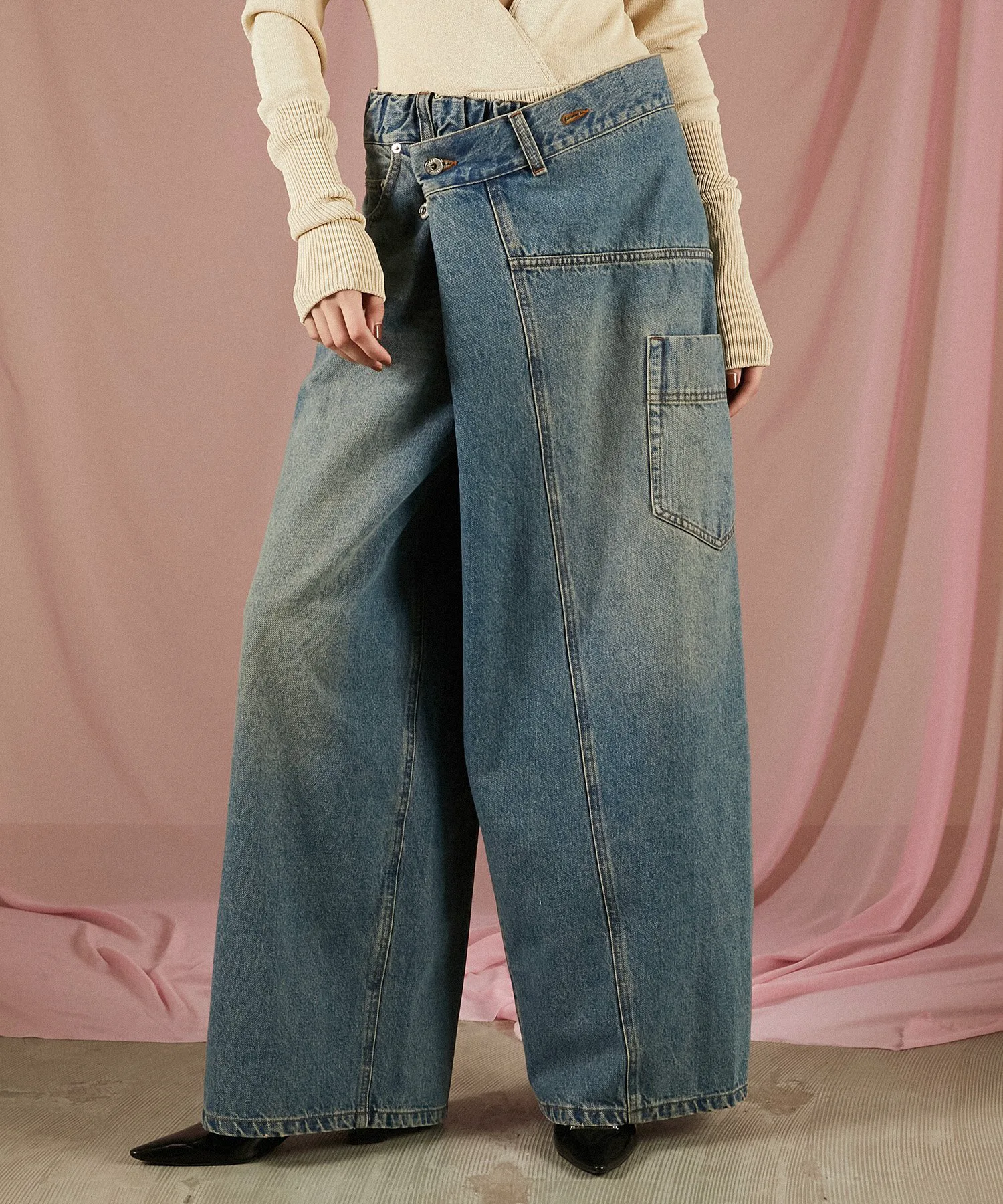 Эта вещь имеет эффектный, модифицированный дизайн, создающий впечатление, будто джинсы оверсайз заправлены в пояс.