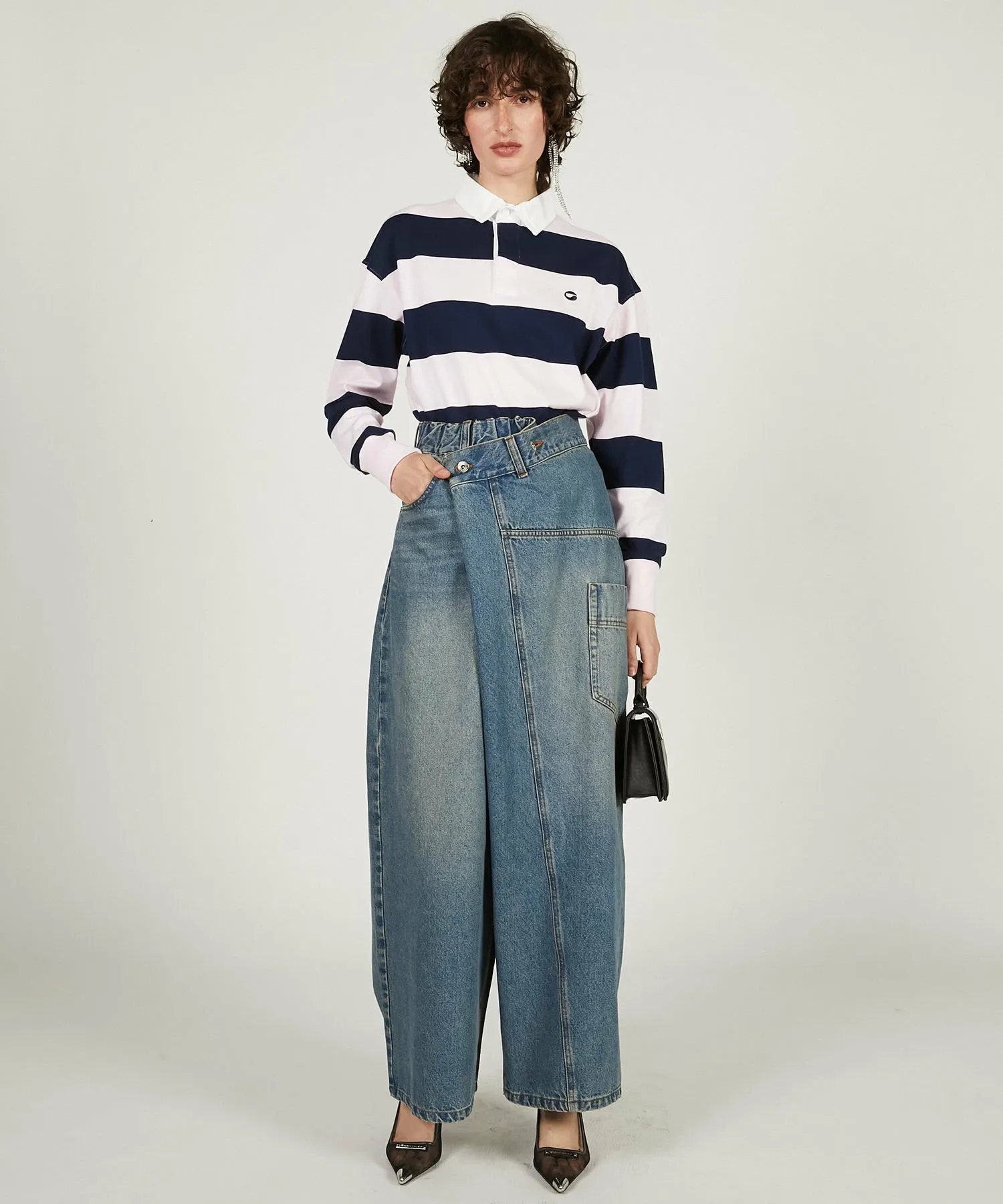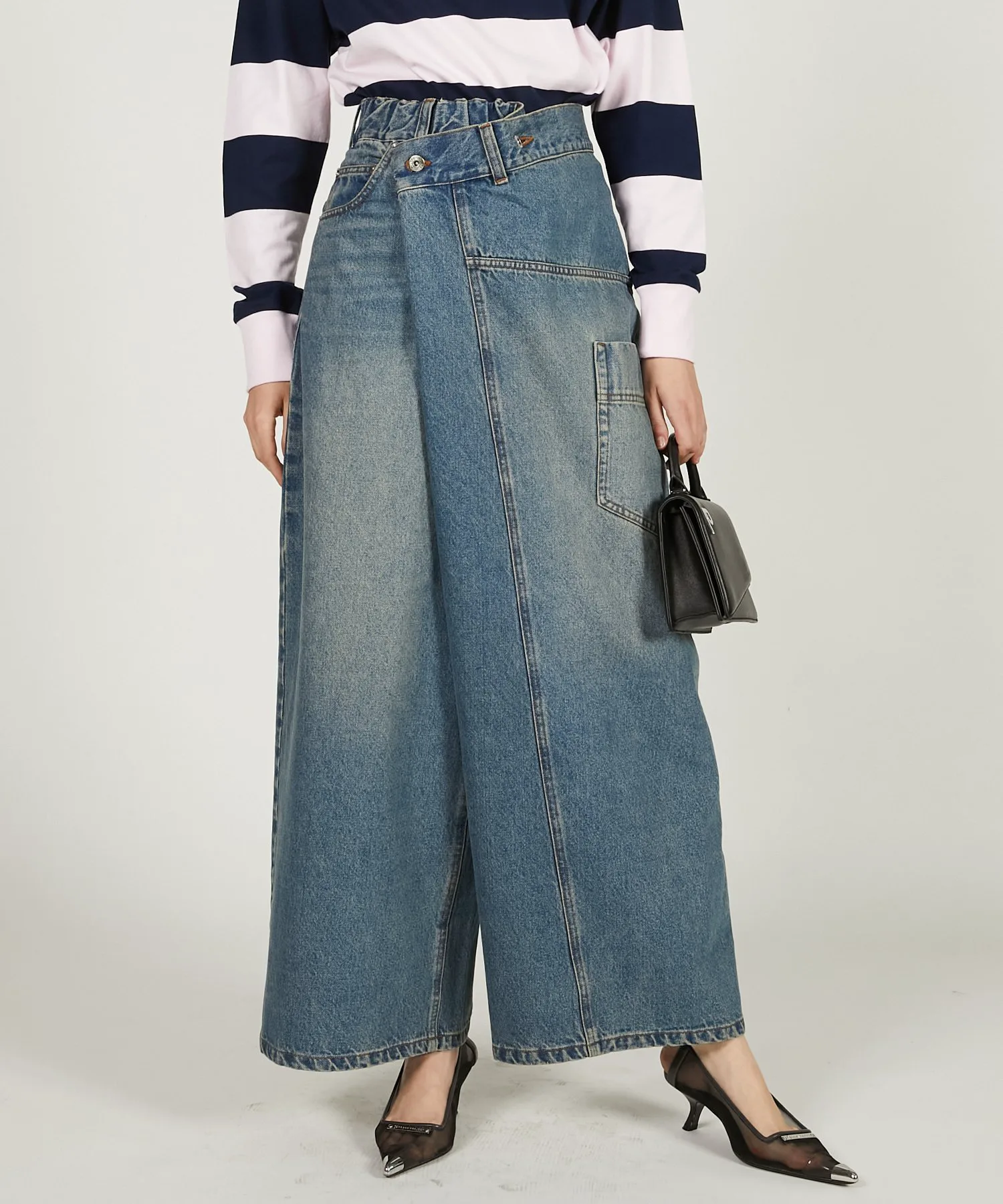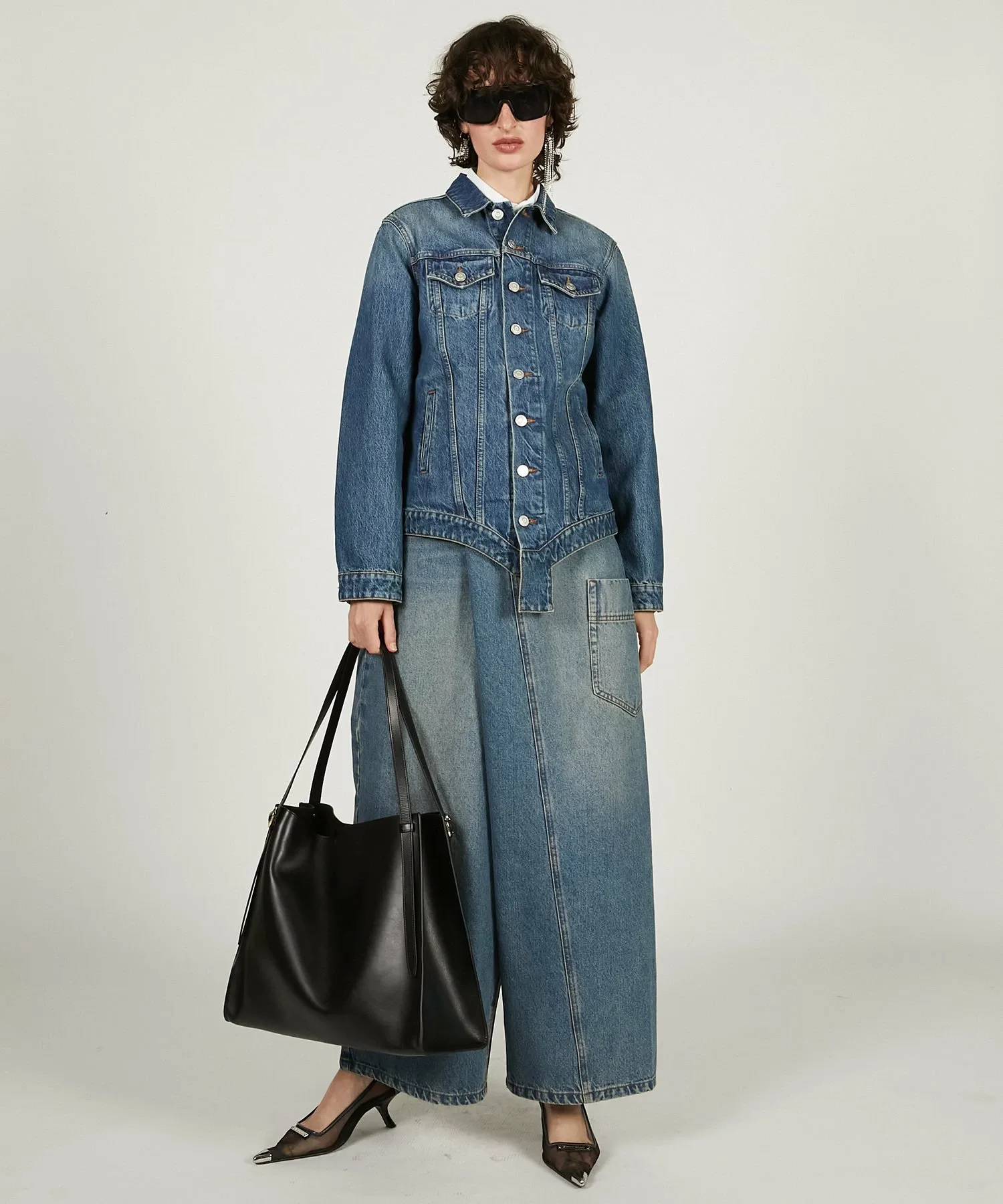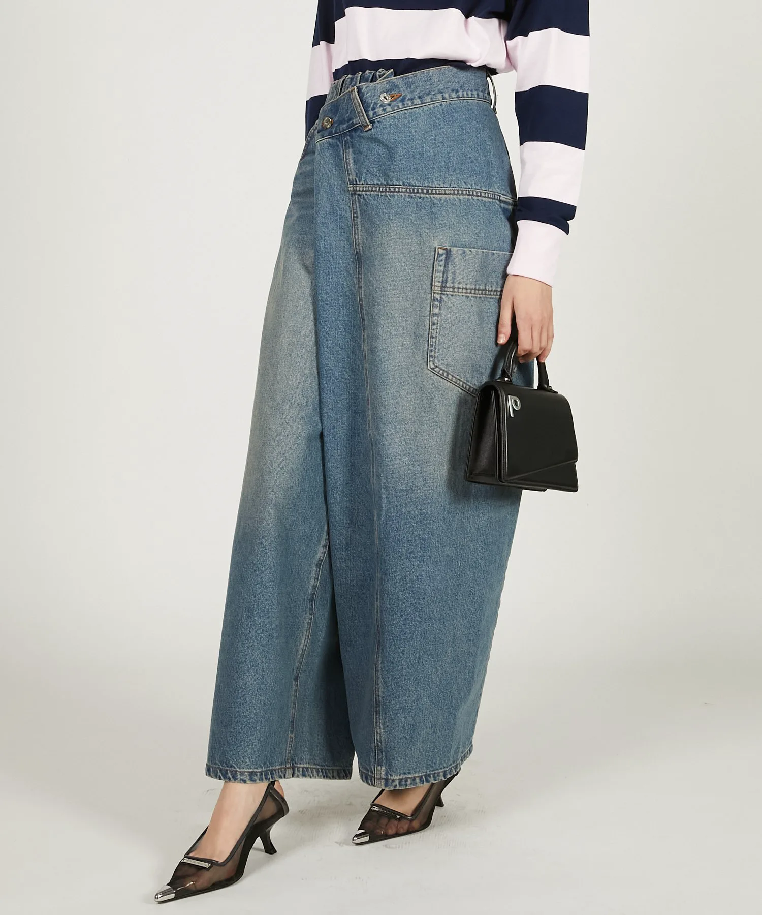 Эта вещь имеет эффектный, модифицированный дизайн, создающий впечатление, будто джинсы оверсайз заправлены в пояс.