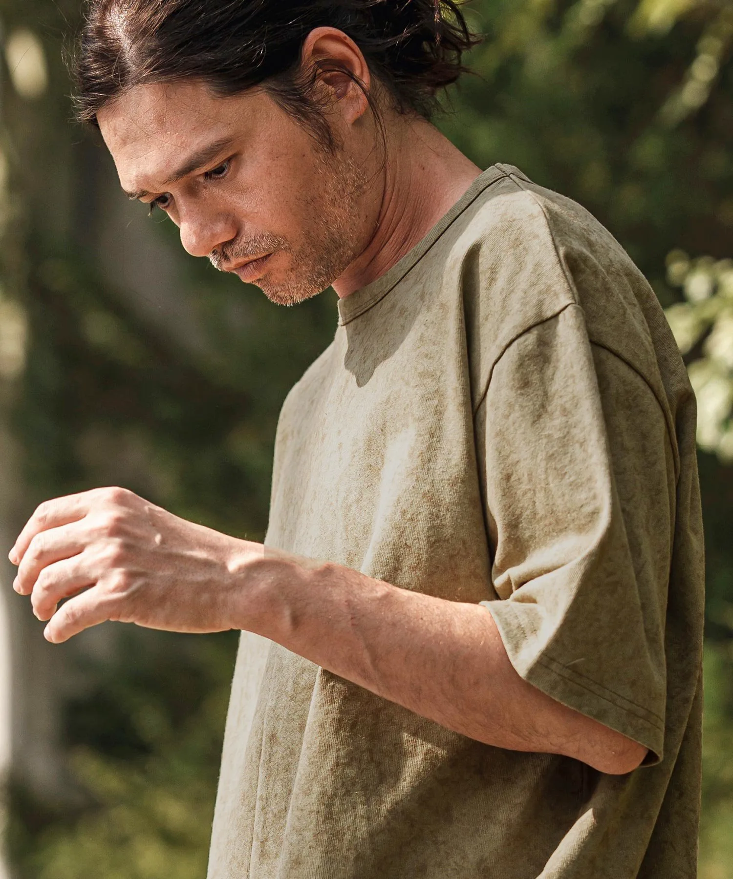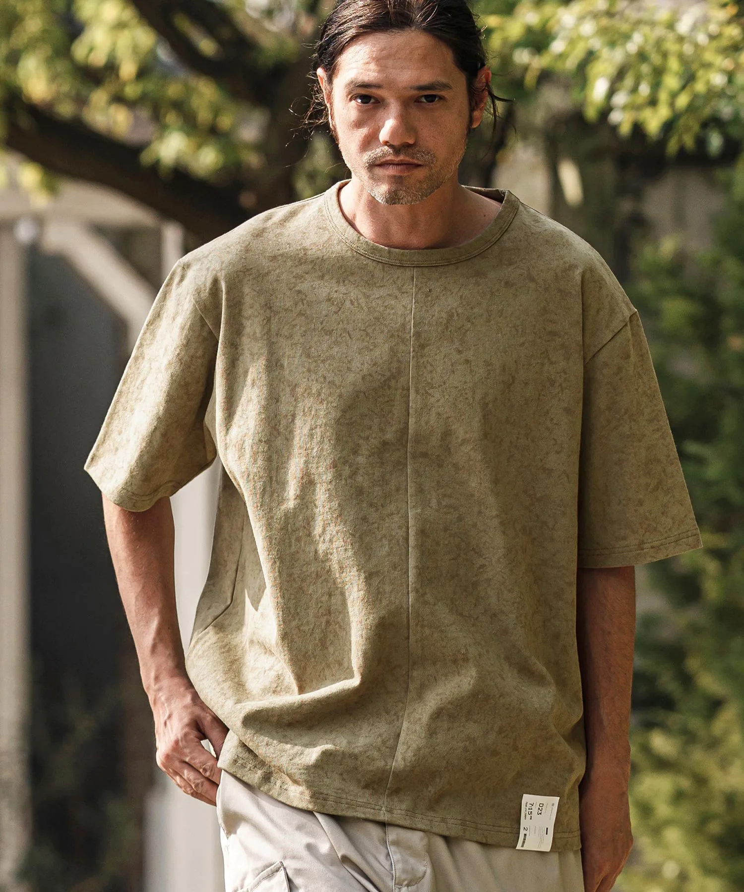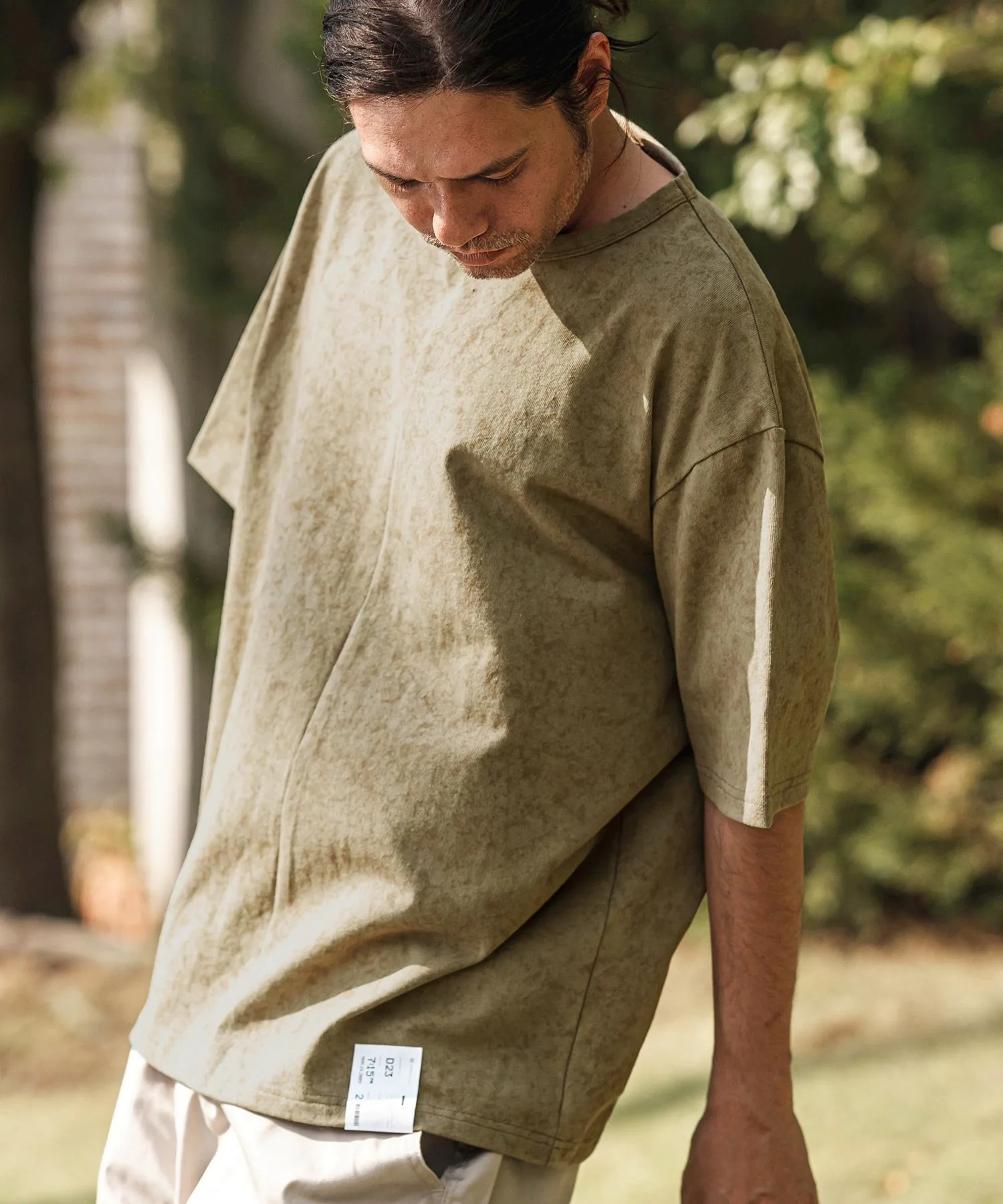 Топ сшитый из ткани с принтом, создающим эффект неравномерной окраски.