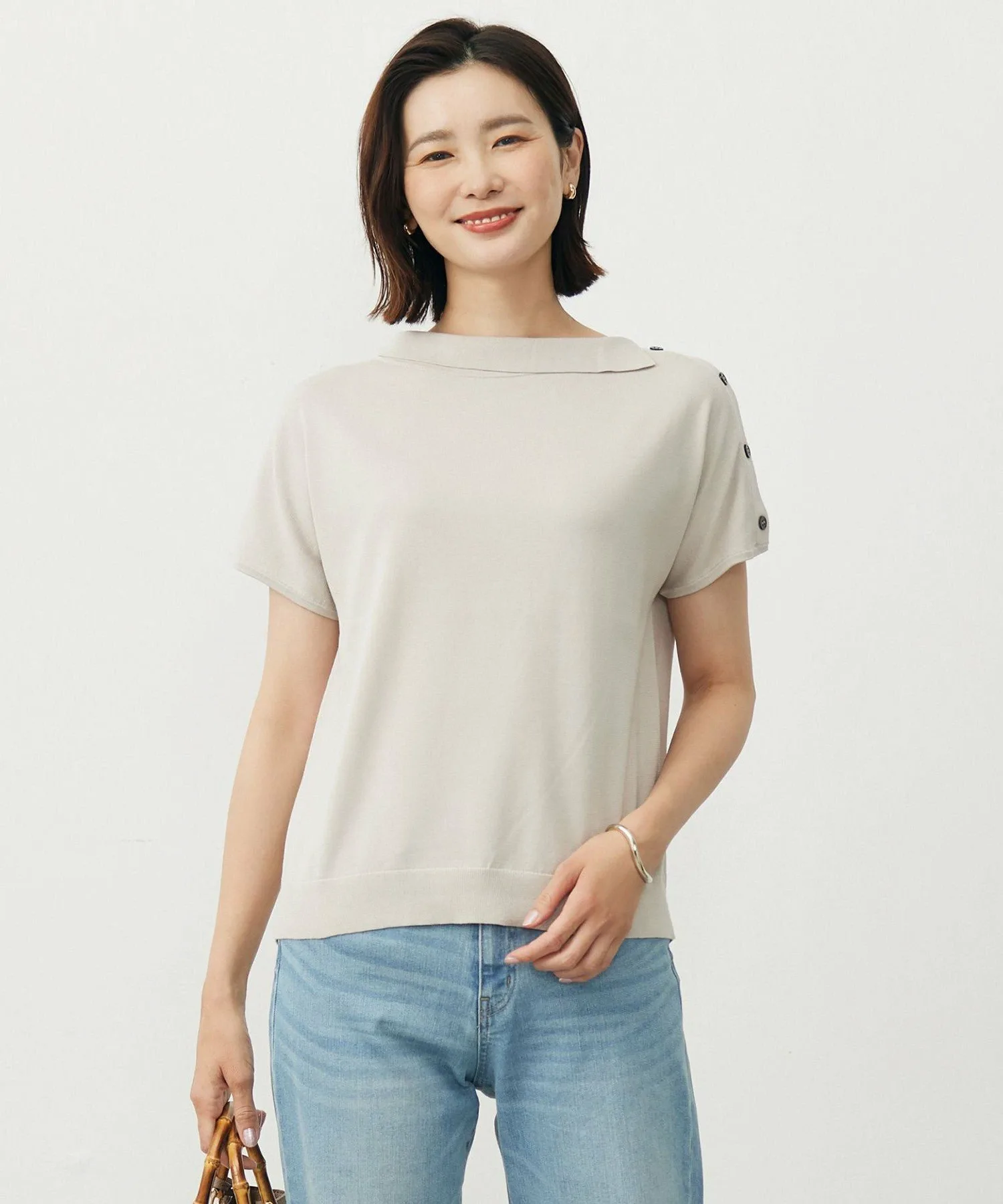 Дизайн: Классический трикотаж с воротником. Пуговицы из ракушек на левом плече добавляют элегантности аккуратному воротнику. Французские рукава немного длиннее, чтобы естественно прикрыть проблемные предплечья. Легко сочетается с брюками или юбками и достаточно универсален для широкого круга случаев, от повседневных до нарядных. Несмотря на простоту, тонкие детали выделяют его, делая его идеальным элементом для изысканных ансамблей. Доступен в четырех цветах: серо-бежевый (#003) для мягкого образа, розовый (#012) для женственного образа, нежно-голубой (#072) для сдержанной свежести и темно-синий (#075) для любого случая.