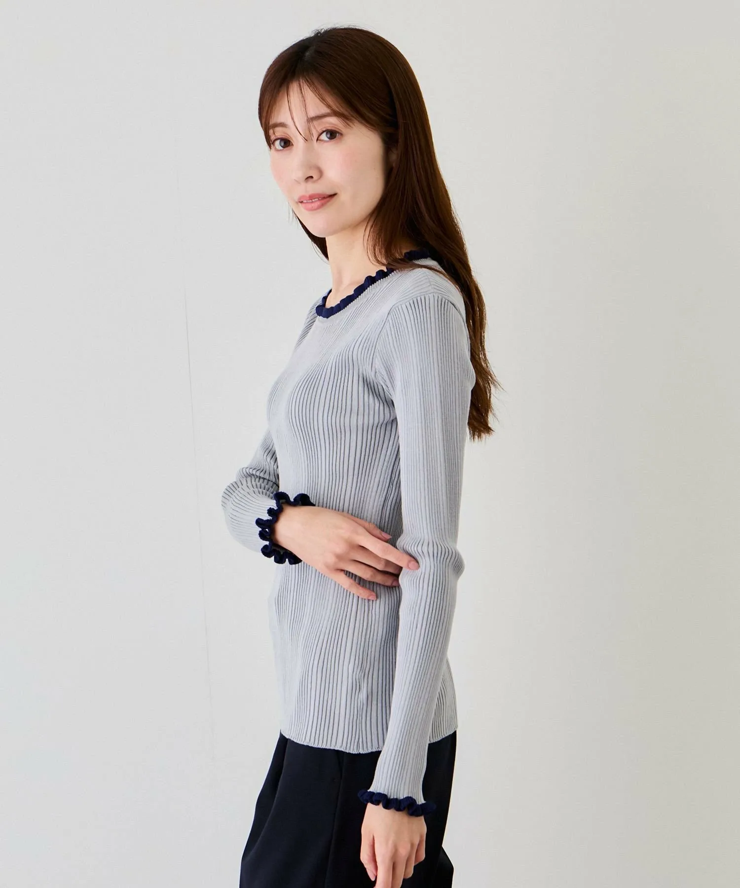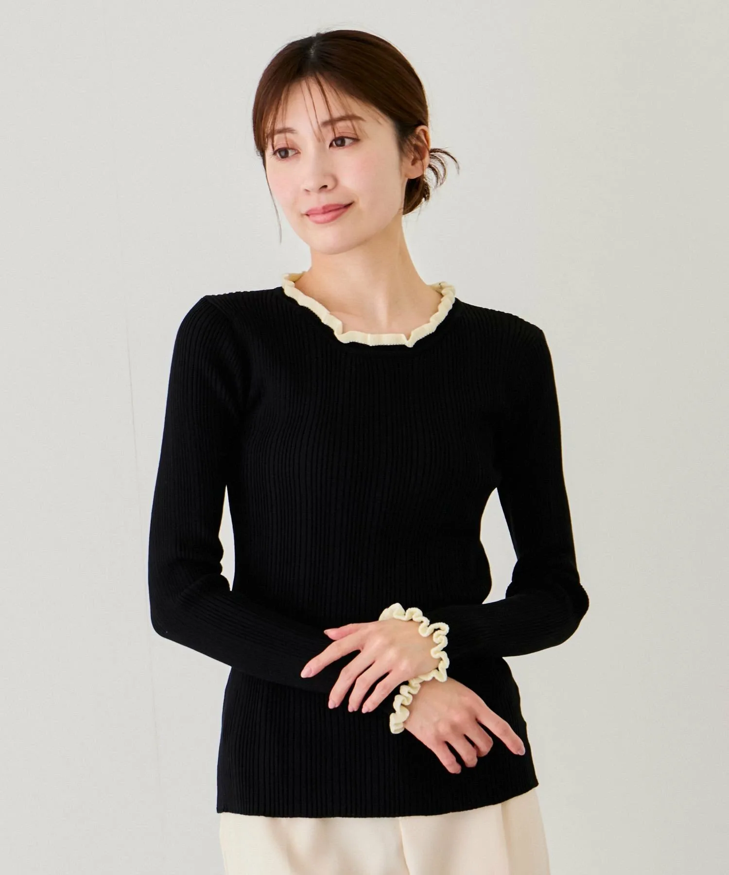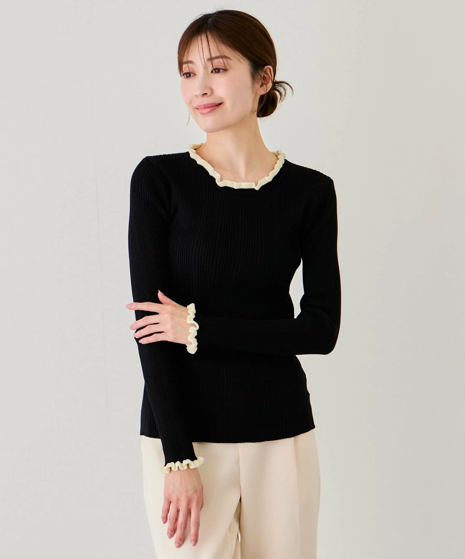 Топ в рубчик с привлекательным двухцветным дизайном, который отлично смотрится как сам по себе, так и в качестве нижнего слоя [Дизайн/Силуэт]