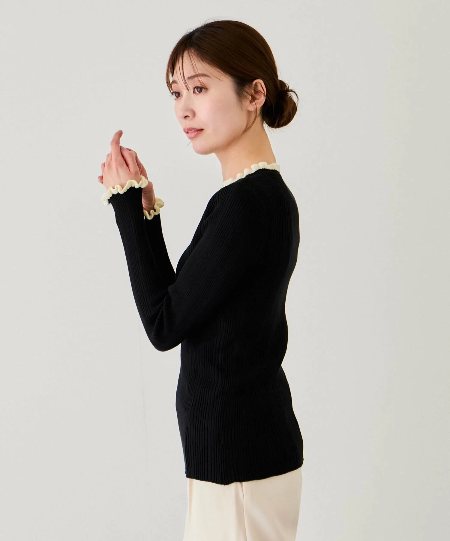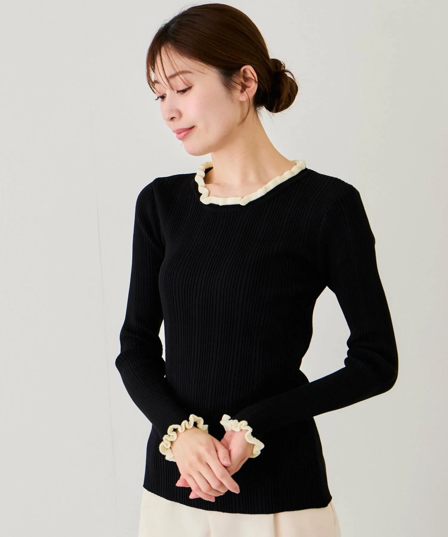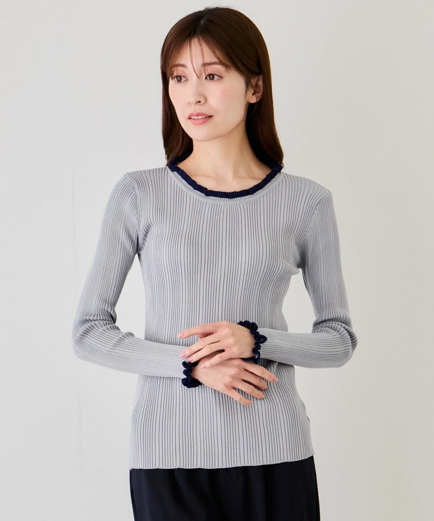 Топ в рубчик с привлекательным двухцветным дизайном, который отлично смотрится как сам по себе, так и в качестве нижнего слоя [Дизайн/Силуэт]