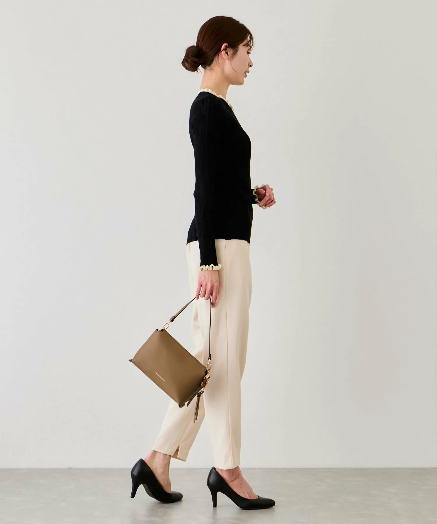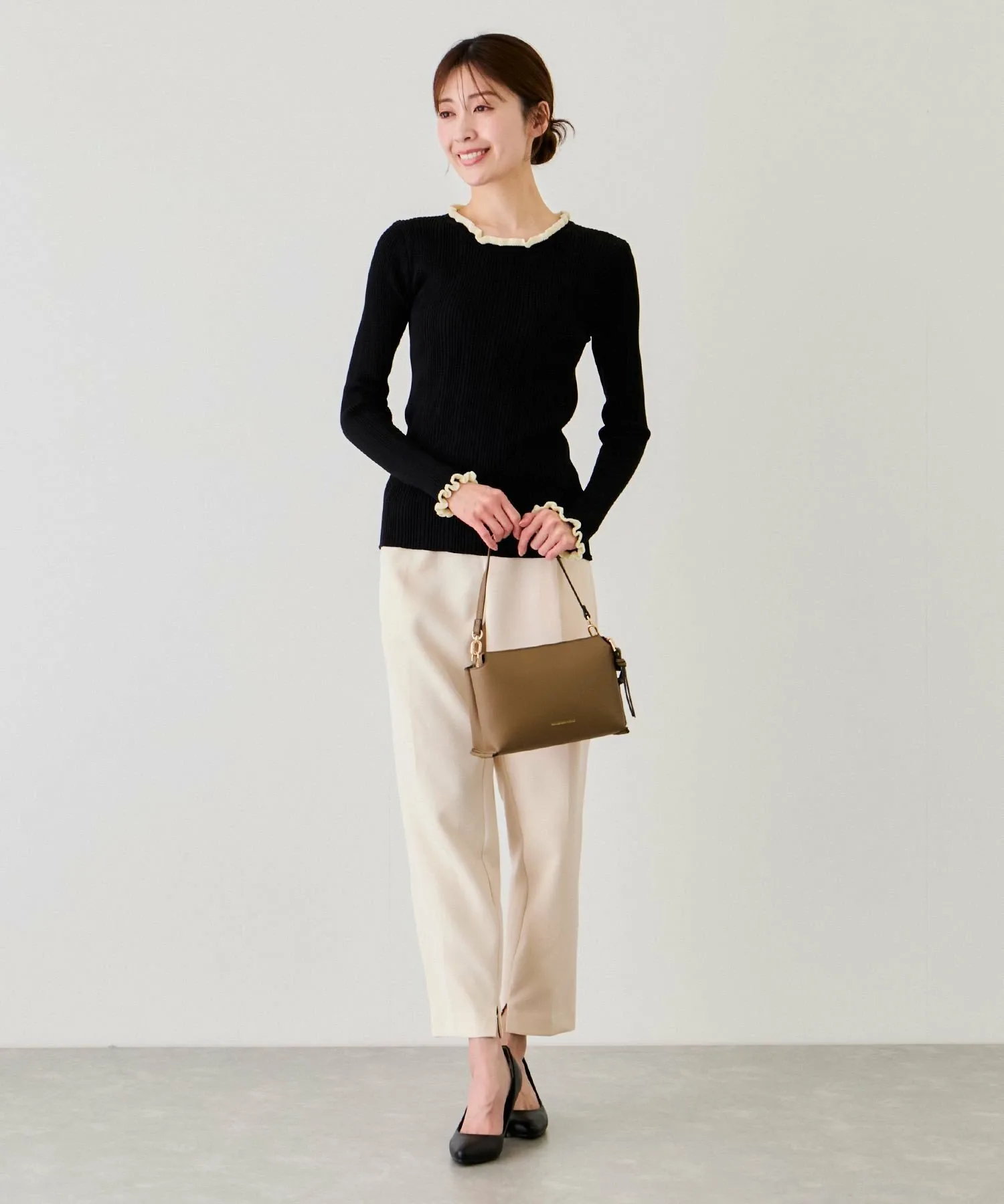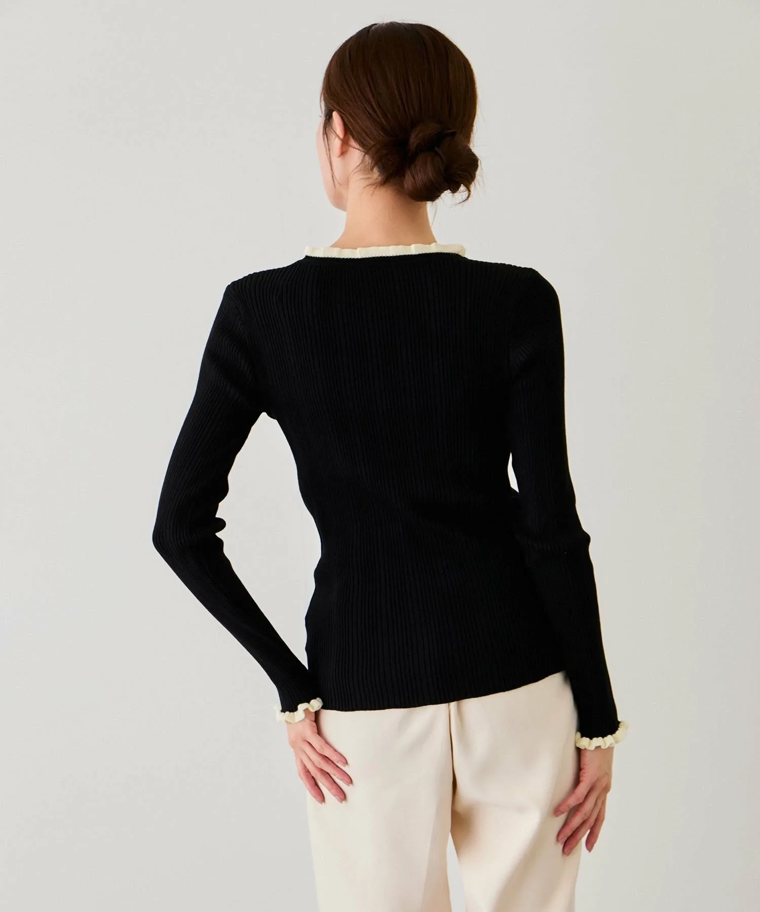 - Контрастные мягкие оборки на воротнике и манжетах добавляют дизайну тонкий женственный акцент.