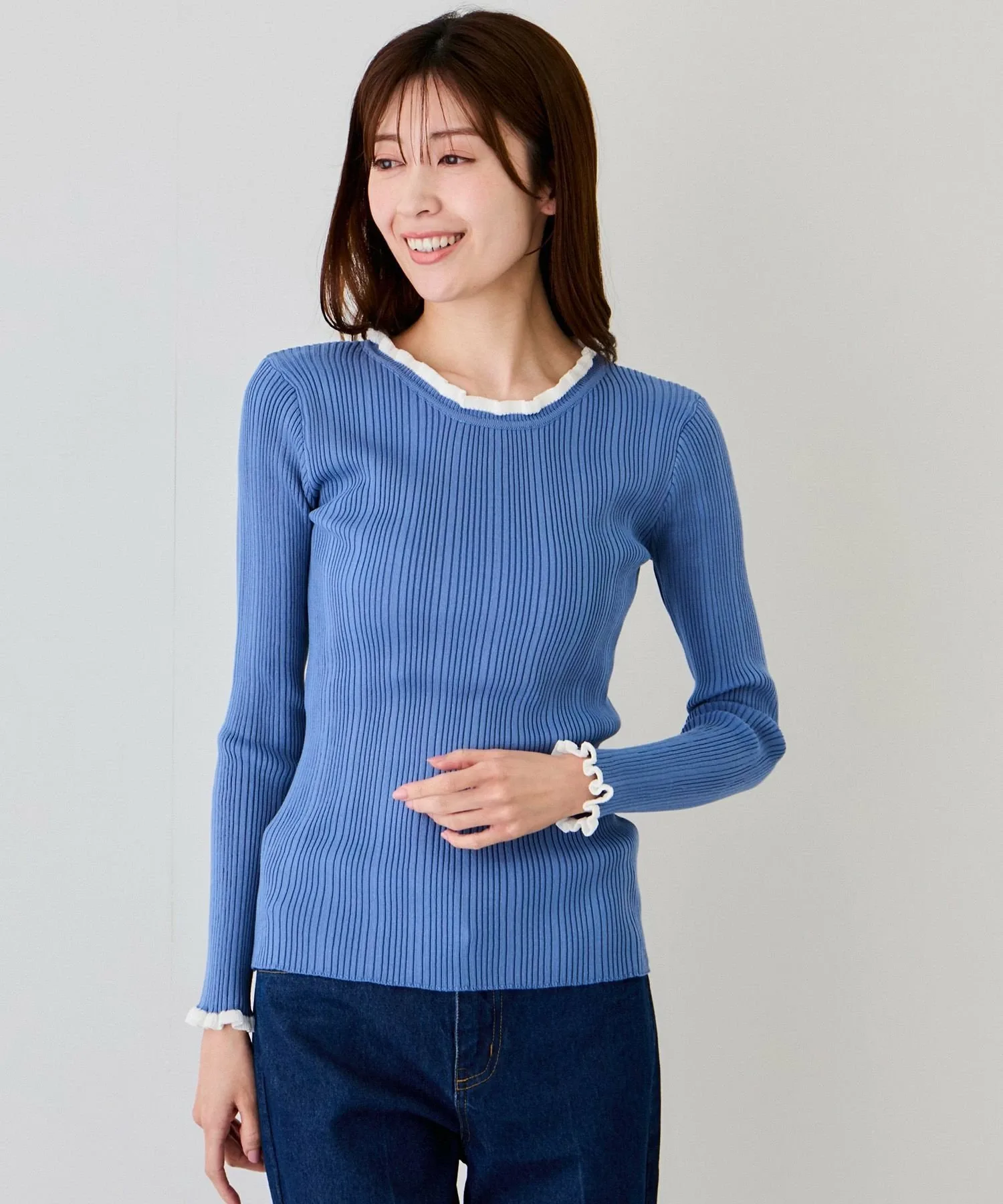 Топ в рубчик с привлекательным двухцветным дизайном, который отлично смотрится как сам по себе, так и в качестве нижнего слоя [Дизайн/Силуэт]