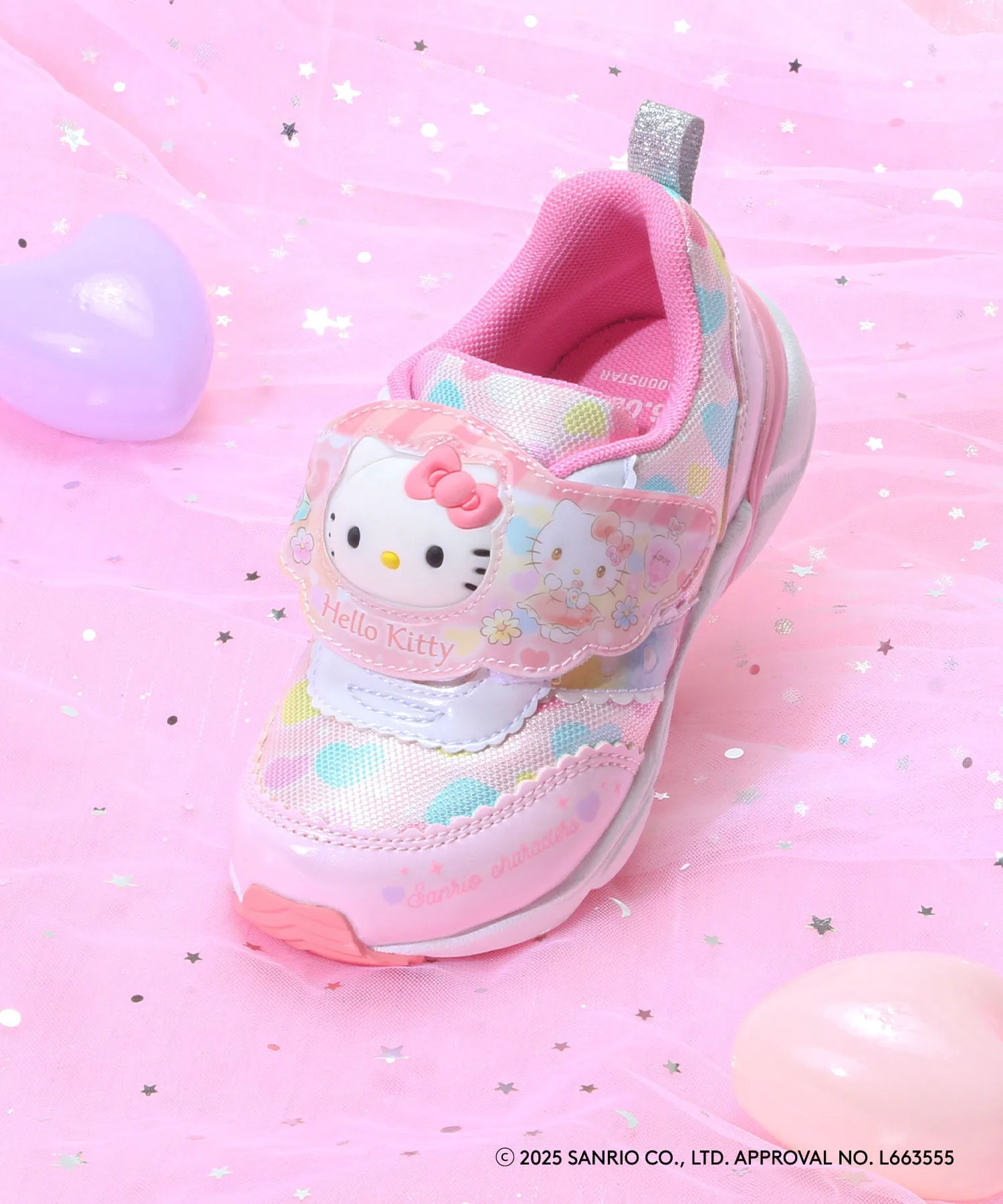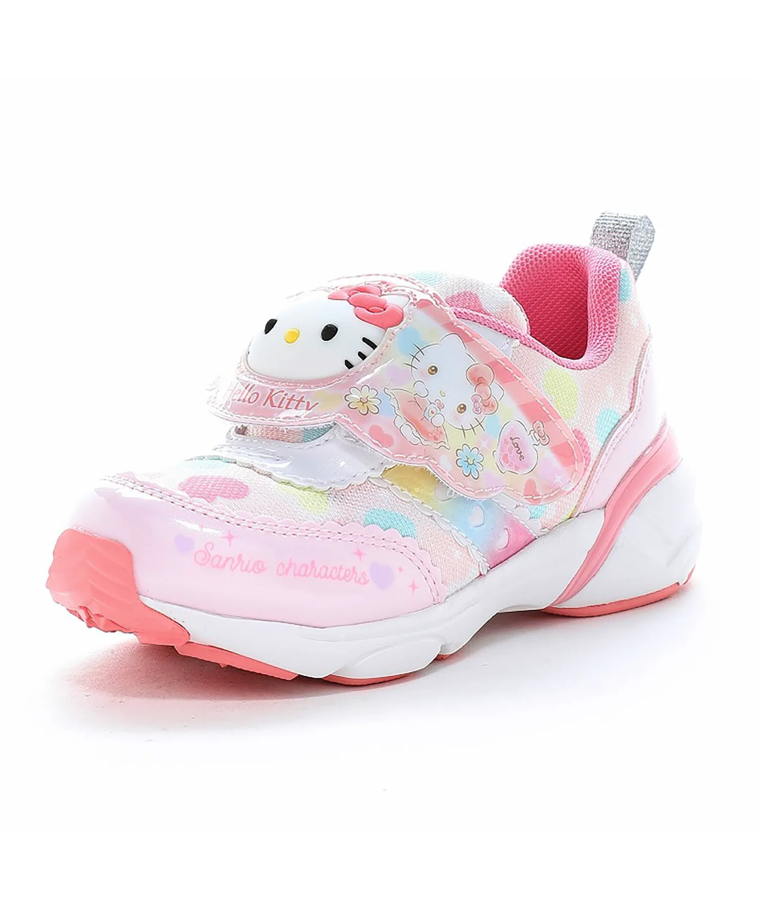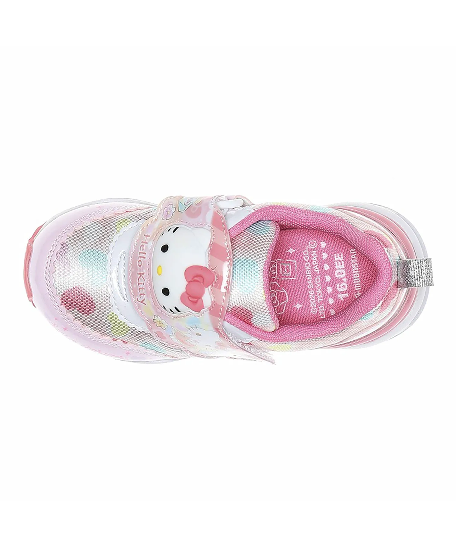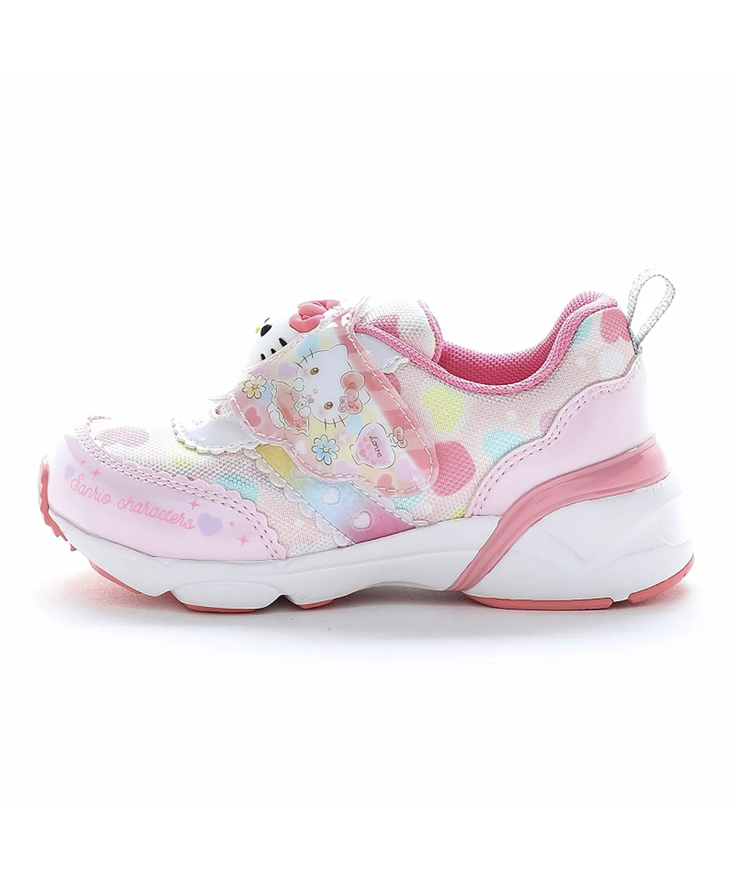 Розовые — это «Hello Kitty». Милый и оригинальный дизайн изображает персонажа в роли продавца. Трехмерное лицо на ремешке на подъеме стопы светится при вибрации. Предполагается, что оно загорится примерно 300 000 раз и прослужит около двух месяцев. Эти кроссовки с одним ремешком можно надевать и снимать одним касанием. Они универсальны, подходят для школы, игр на улице, тренировок и прогулок. Вес каждой кроссовки составляет примерно 130 г для размера 16,0 см. Стелька оснащена антибактериальным и дезодорирующим покрытием Ag+.