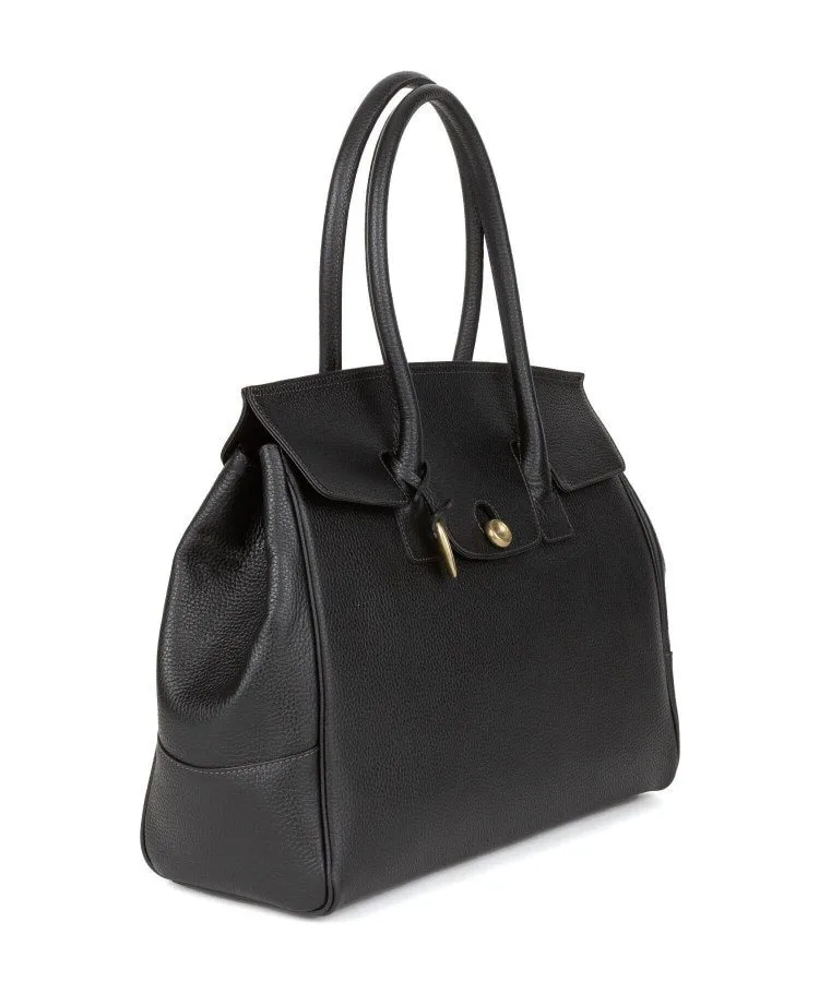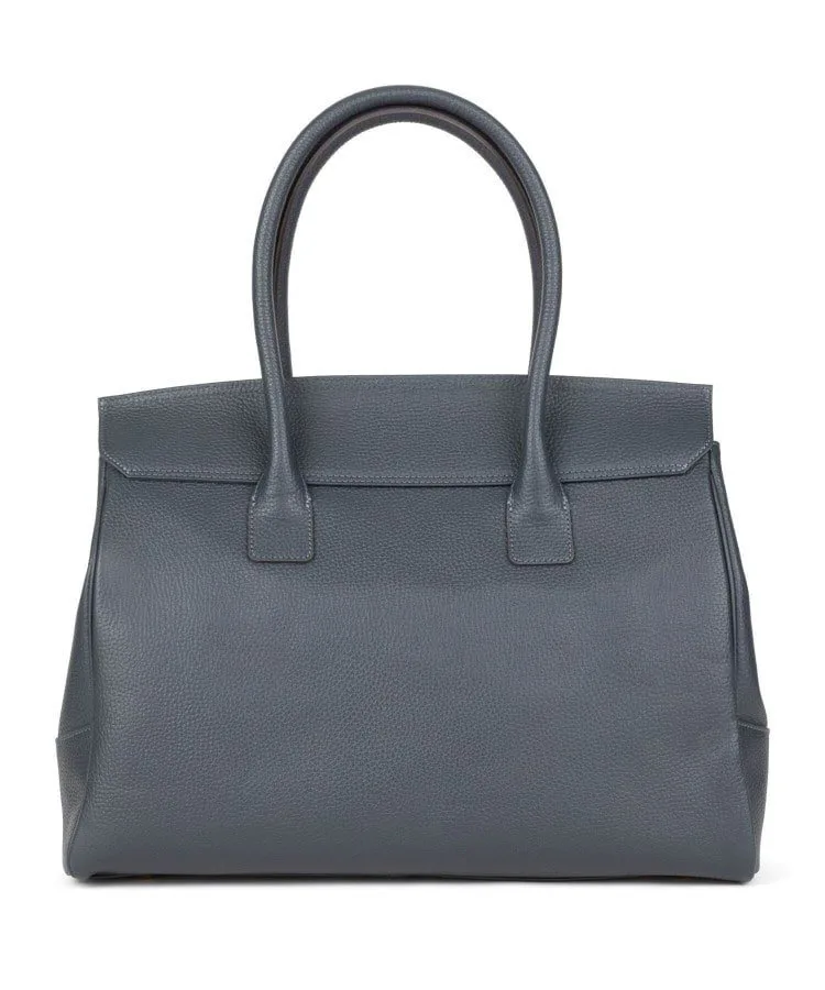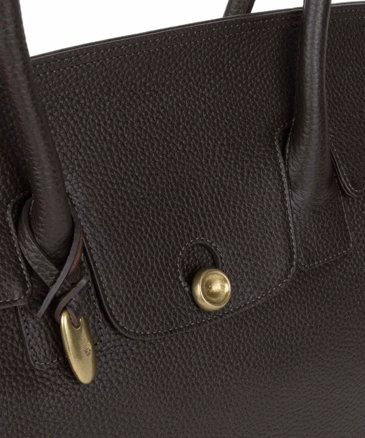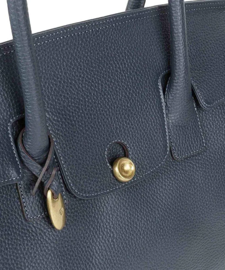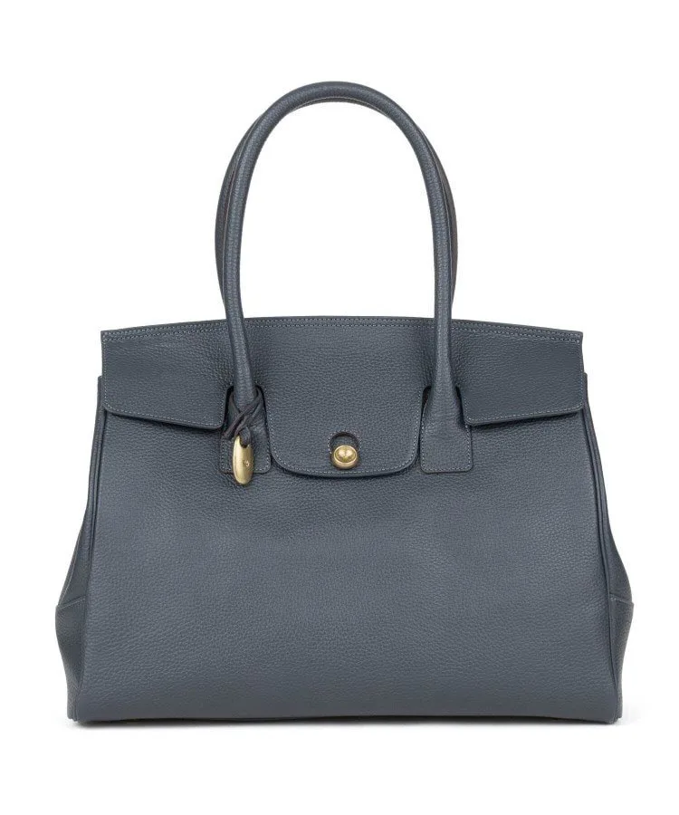 Большая, похожая на крышу крышка застегивается на оригинальную латунную отливку с пуговицей.