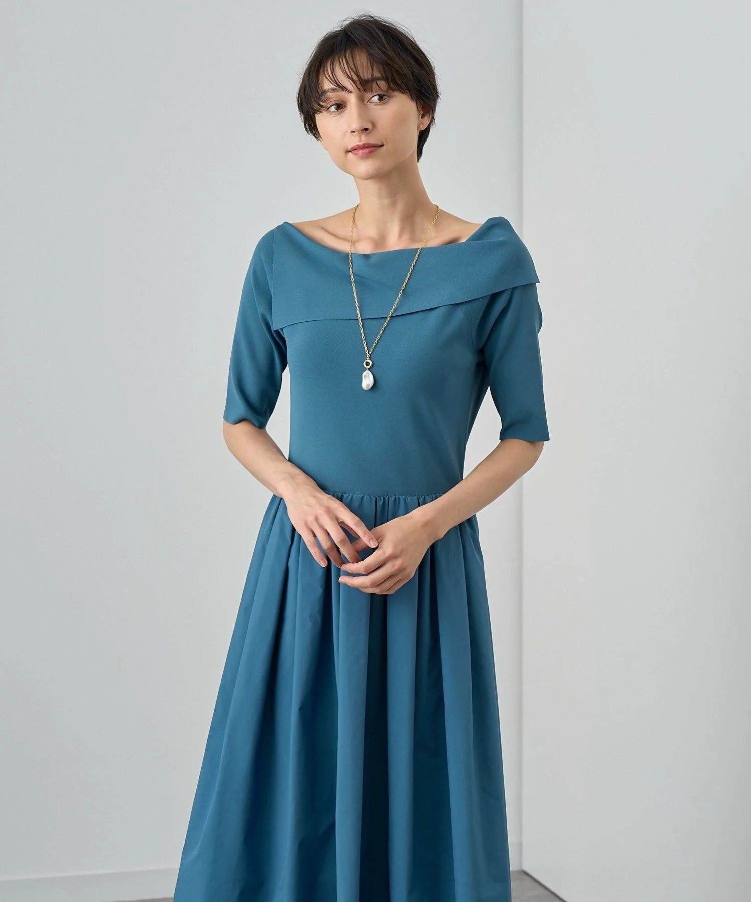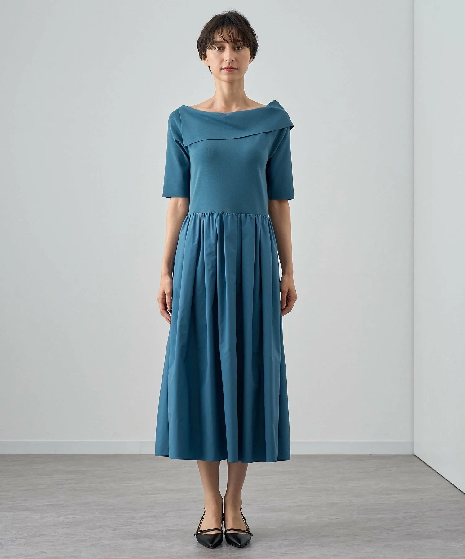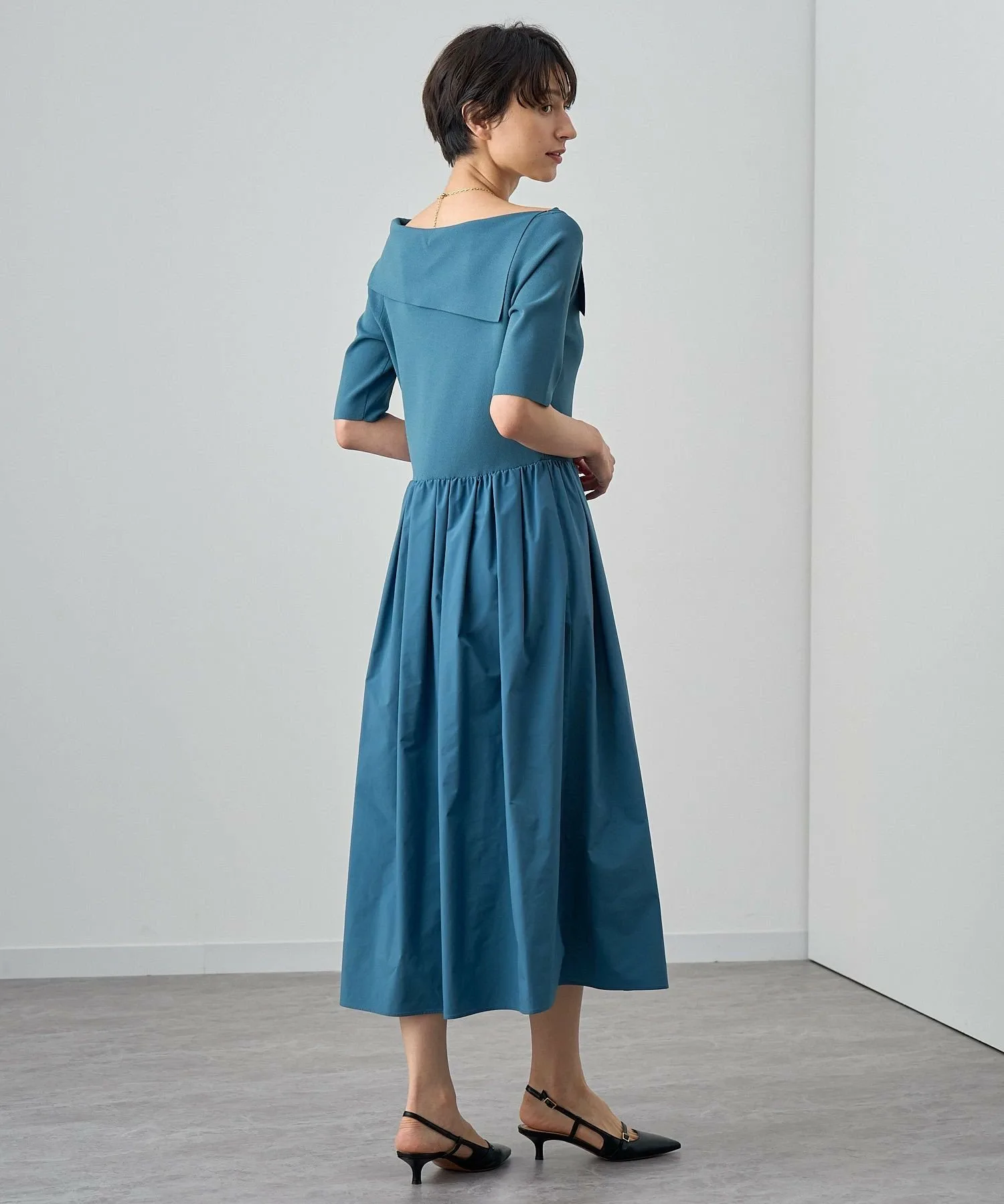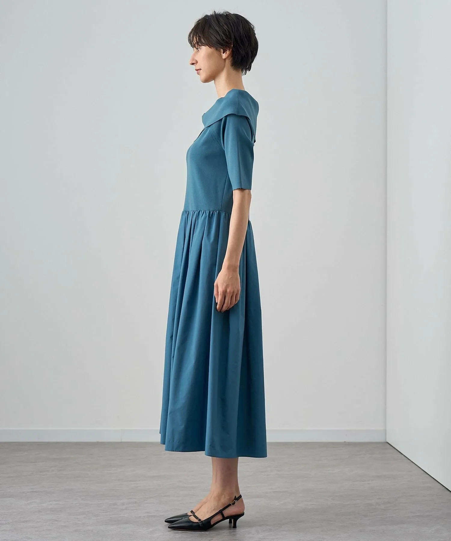 Юбка имеет сборки, придающие ей изысканный вид, но не слишком объемный.