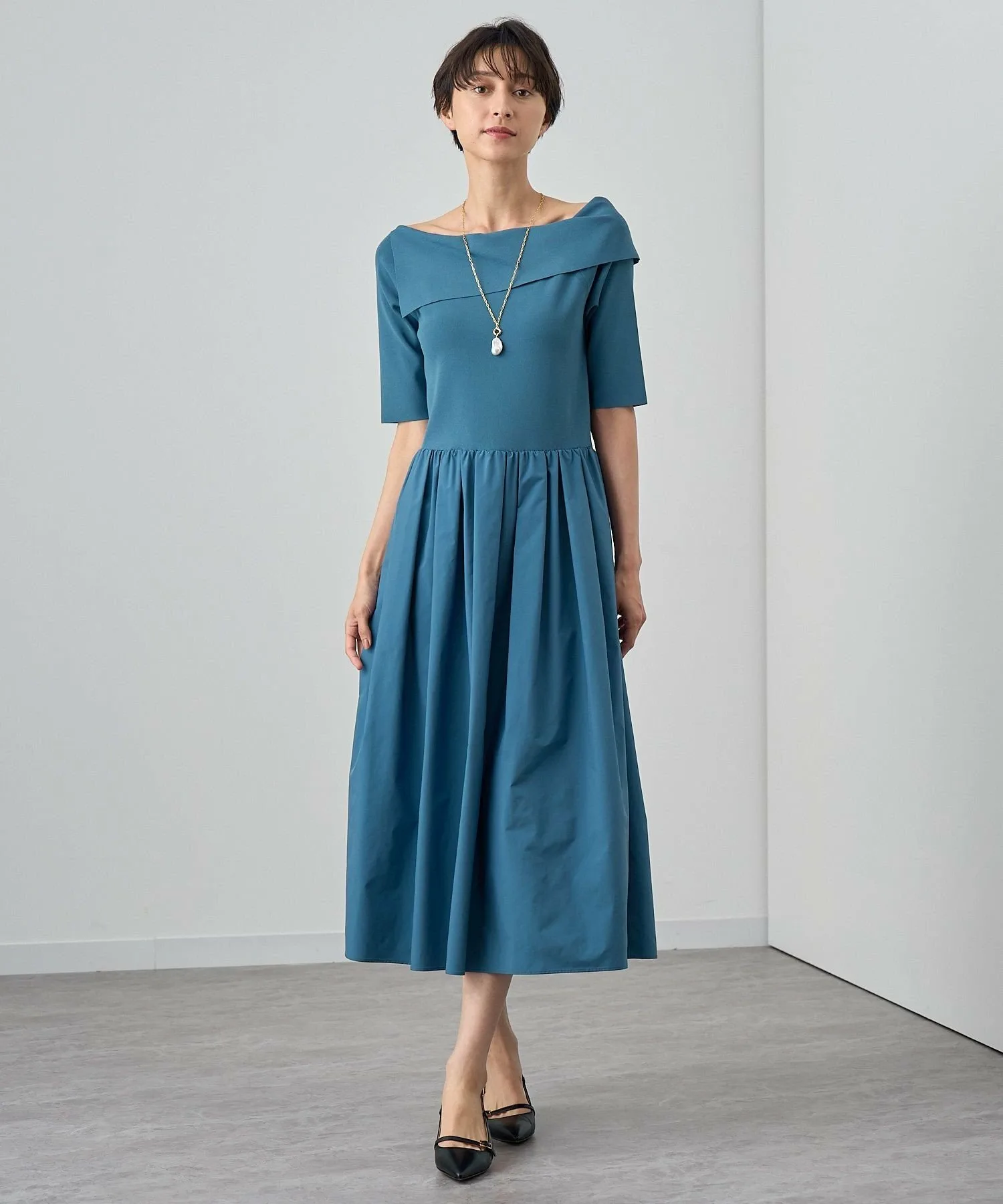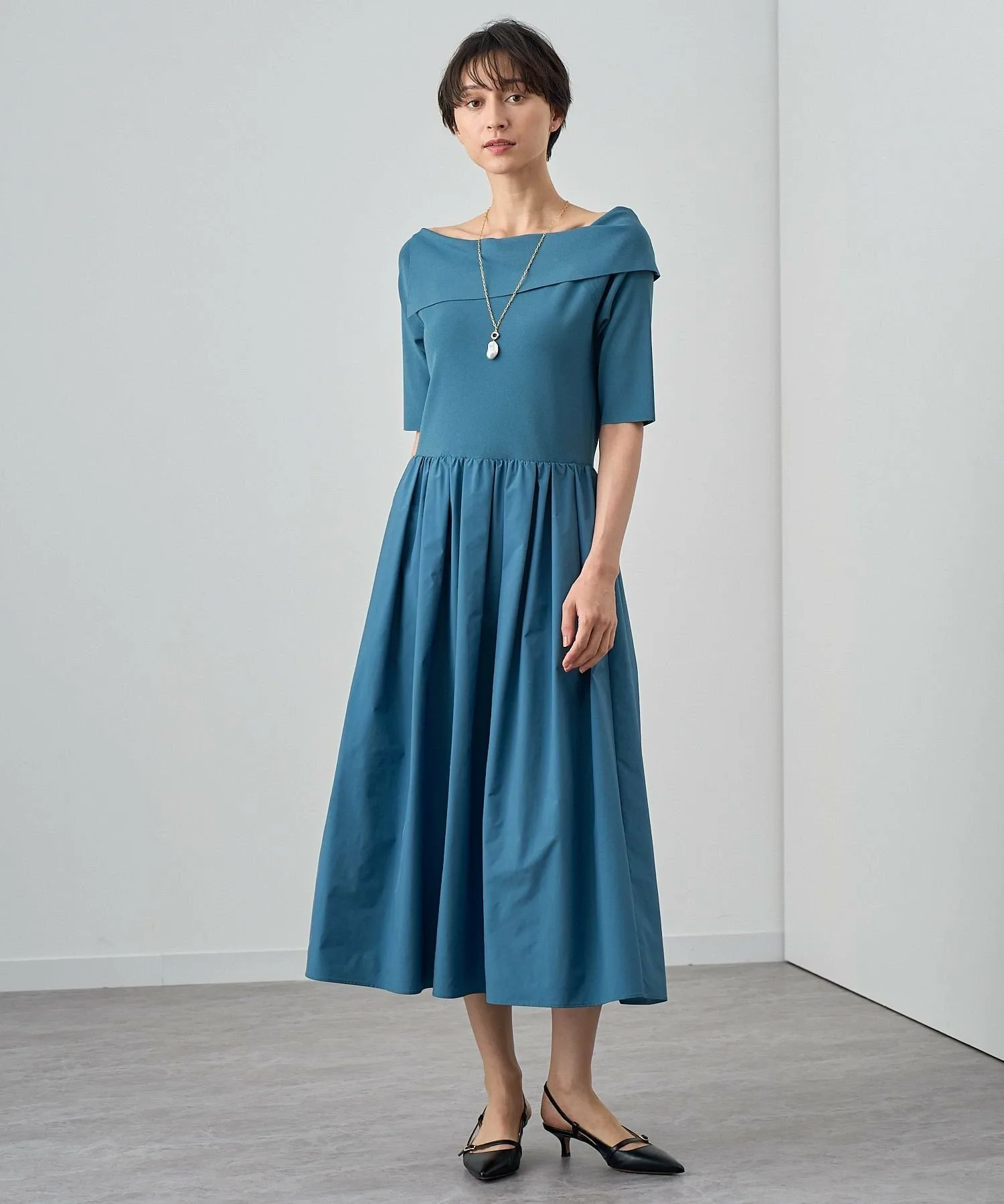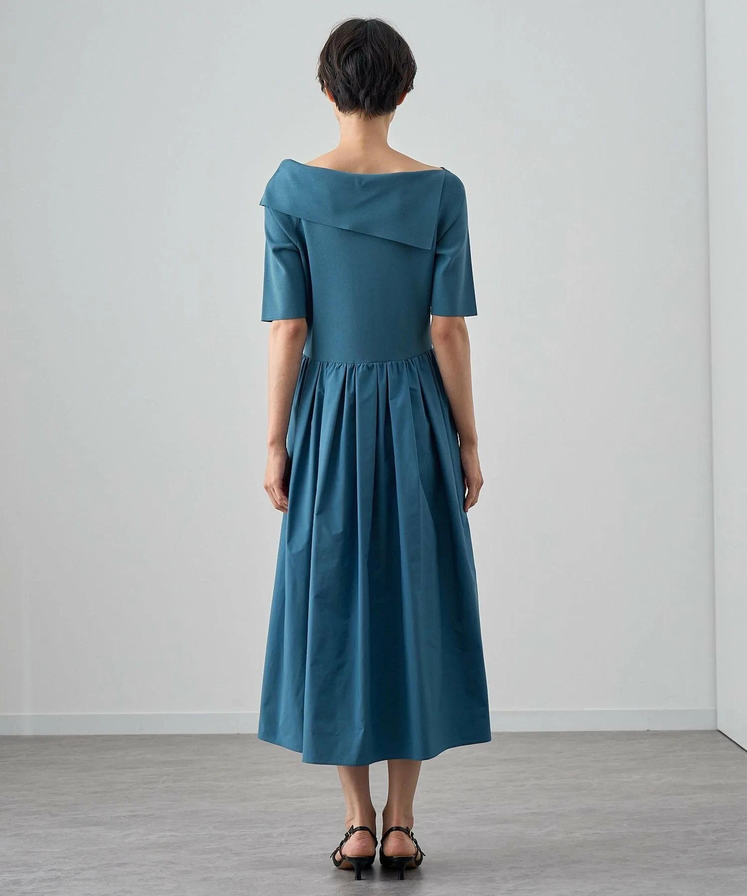 Трикотажное платье-сарафан из тафты. Асимметричный дизайн с открытыми плечами и разрезом с одной стороны создает роскошный образ.
