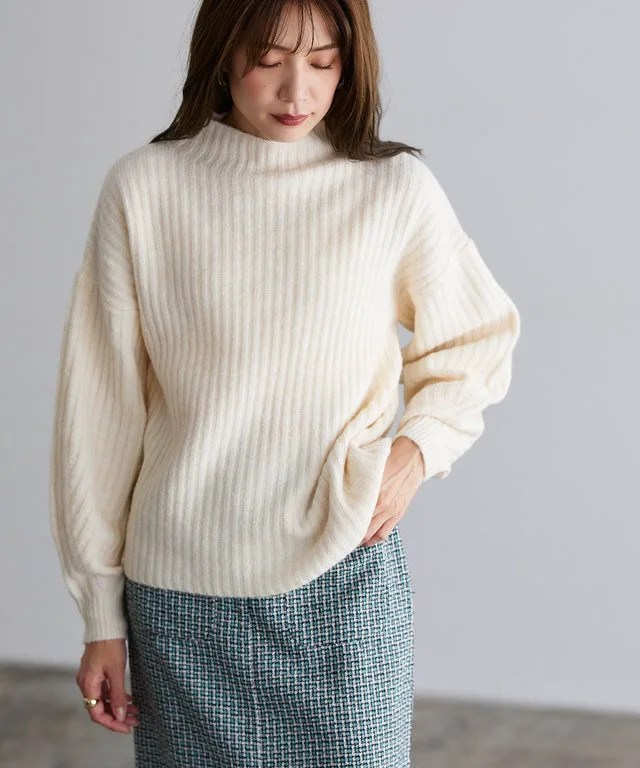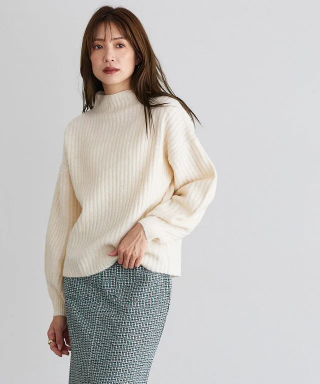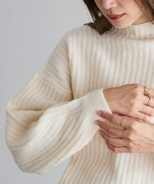 Мягкий, моющийся трикотаж с высоким воротником и объемными рукавами для создания женственного, округлого силуэта.