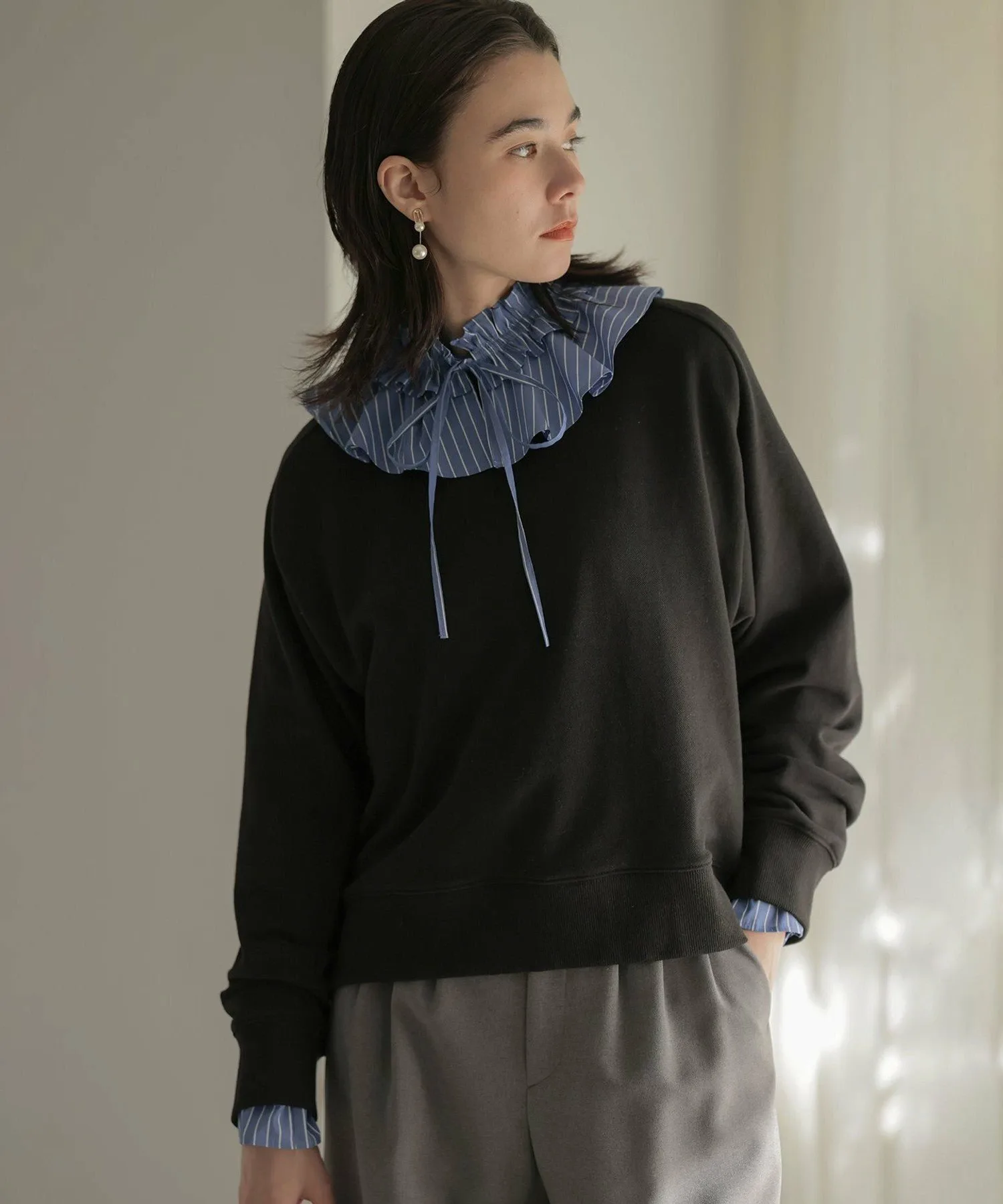 Дизайн: Стильная ребристая отделка и низкий воротник-стойка создают лаконичный вырез, придавая изделию неповторимый и оригинальный вид. Рукава реглан с акцентированной линией плеч создают образ, который не выглядит слишком повседневным. Умеренный размер и слегка свободные рукава хорошо сочетаются с модными брюками-карандашами и струящимися юбками.