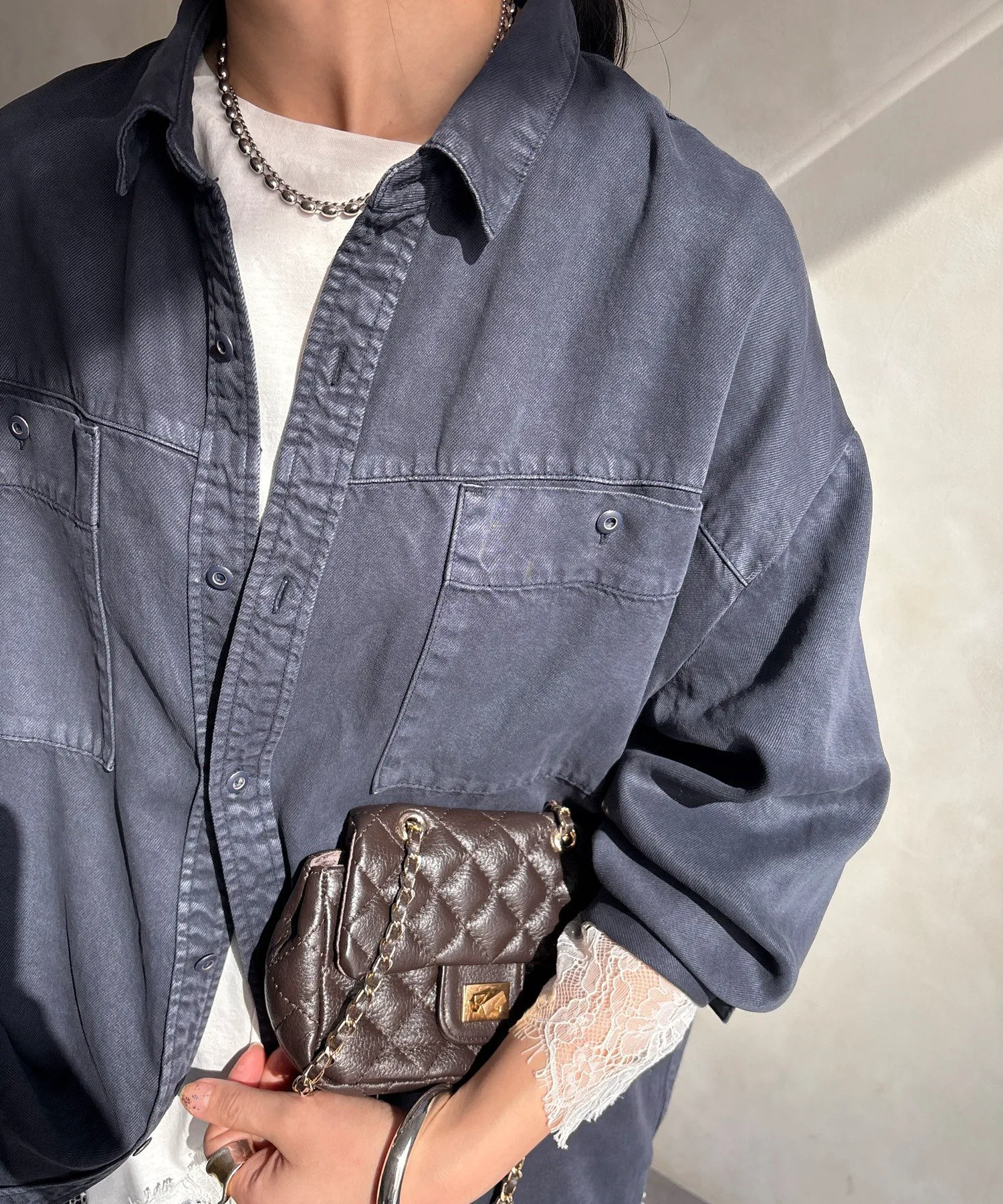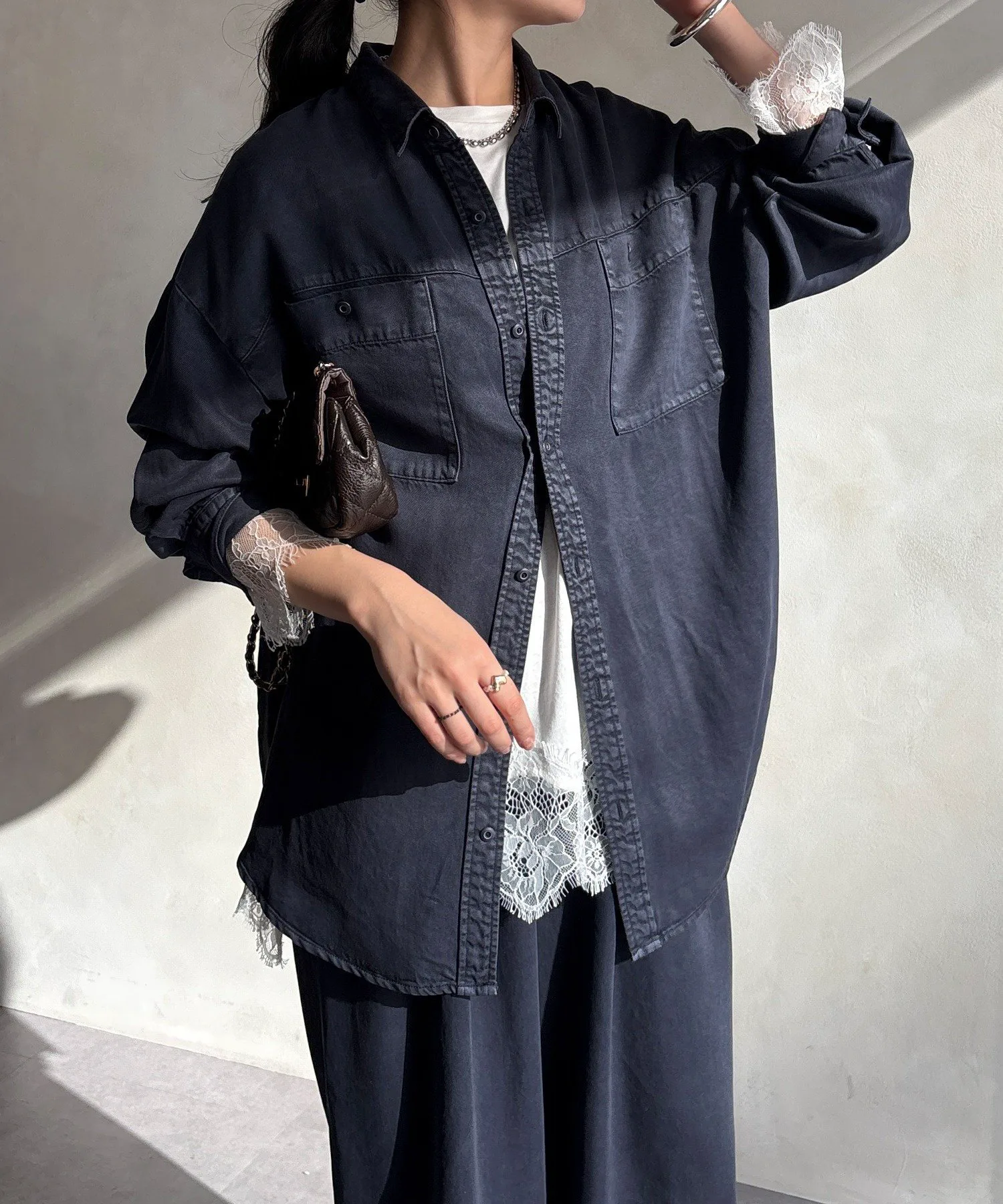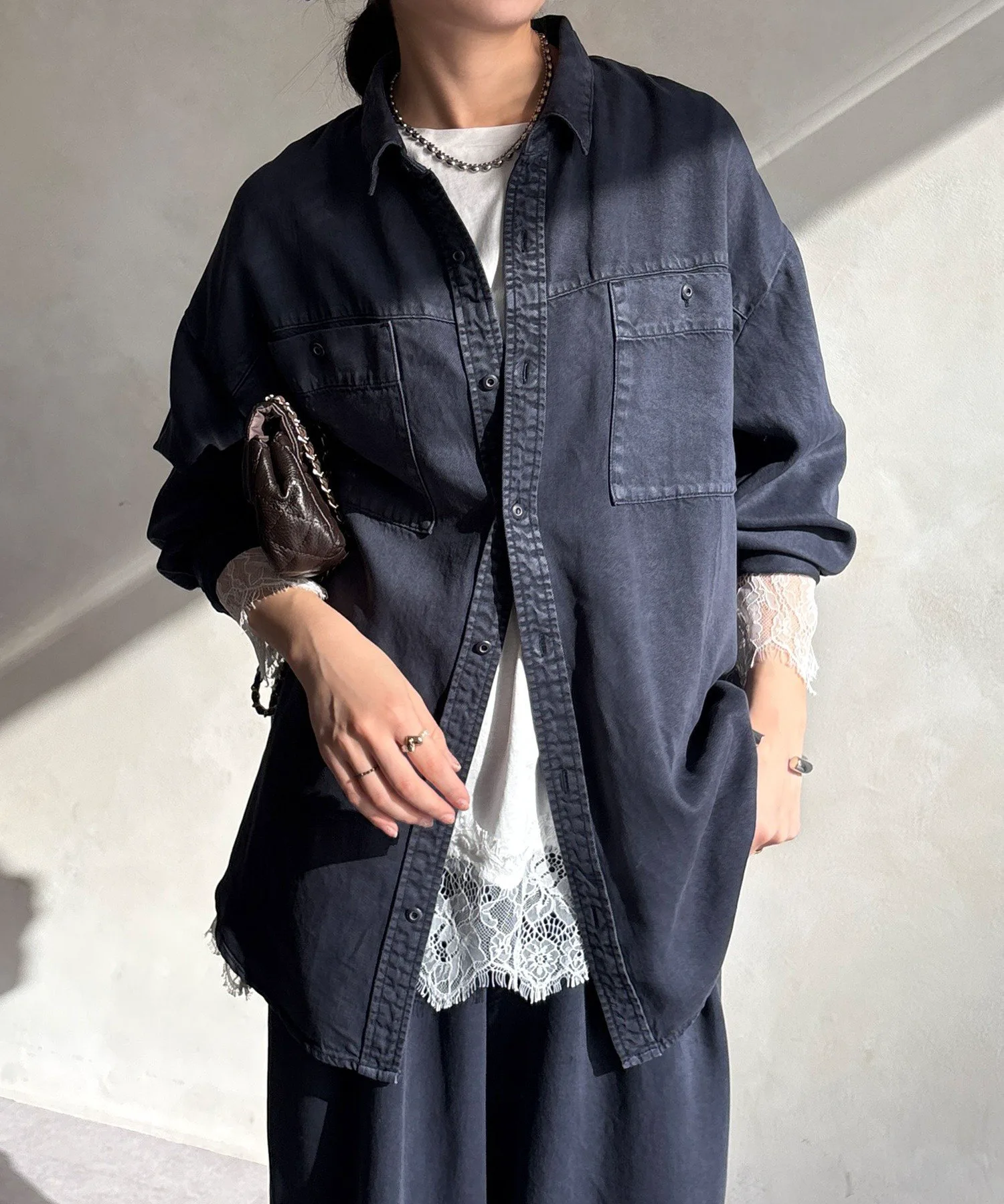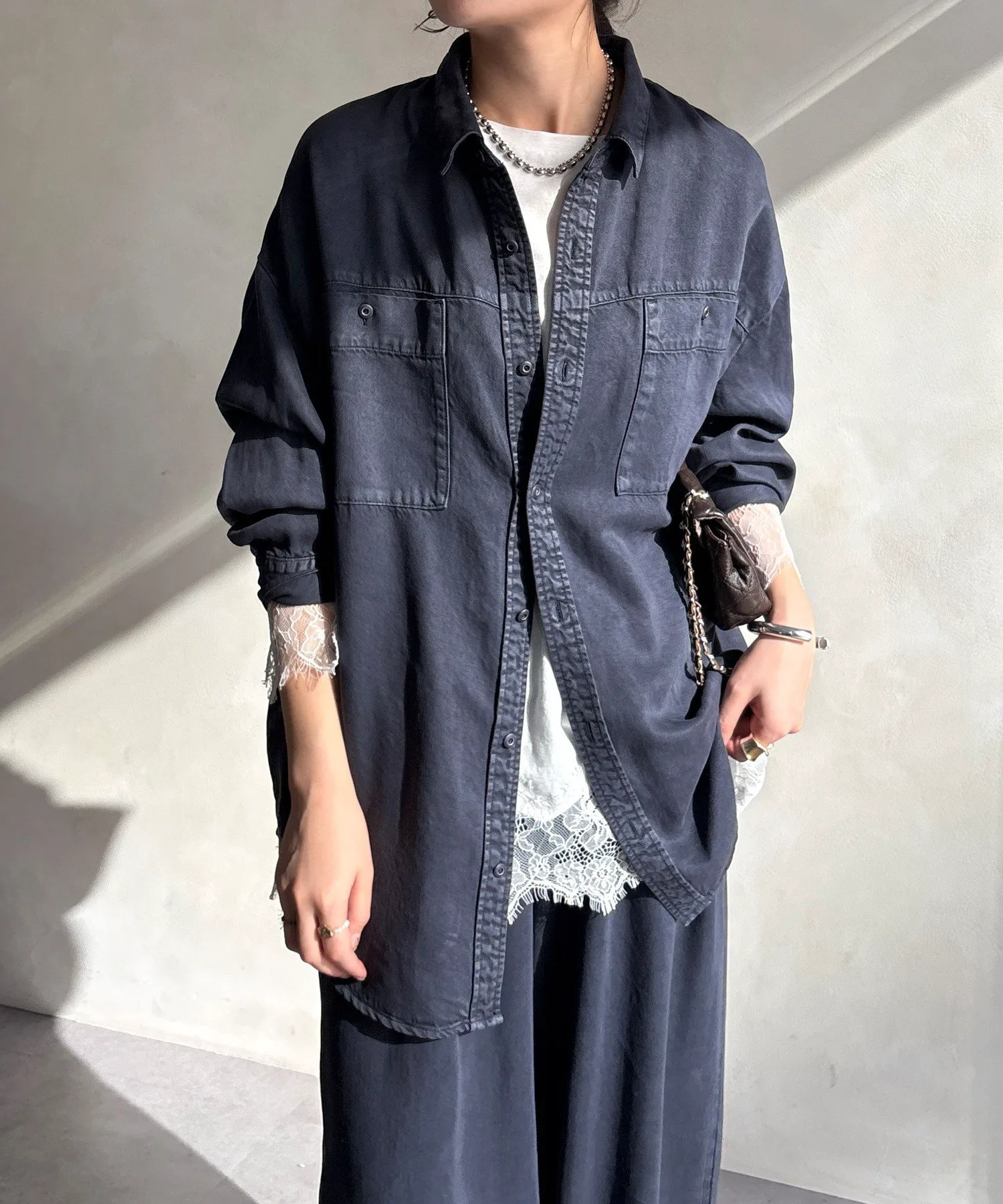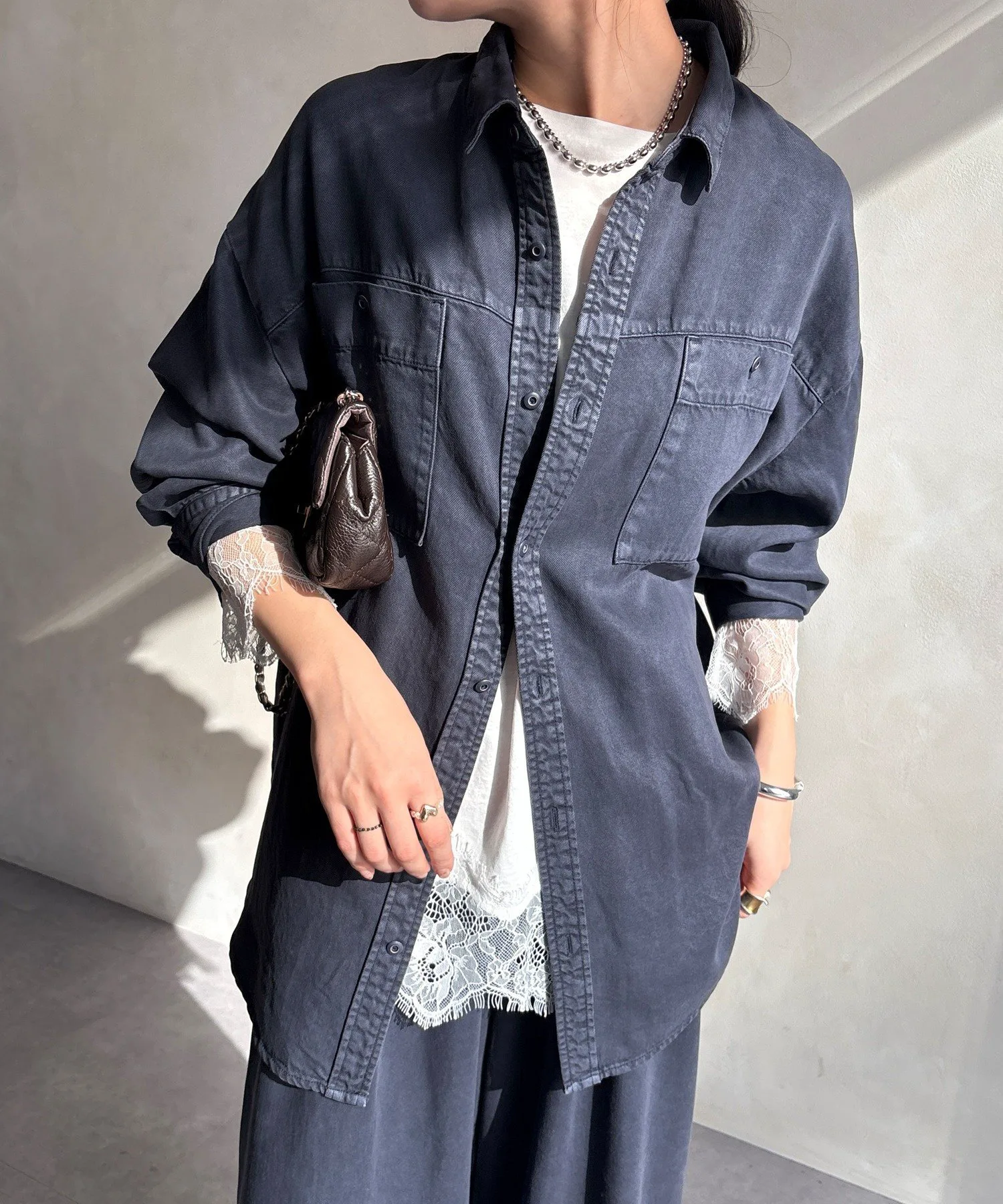 Рубашка-куртка, которая привлекает внимание своей мягкой драпировкой, характерной для материала лиоцелл, и винтажной текстурой.