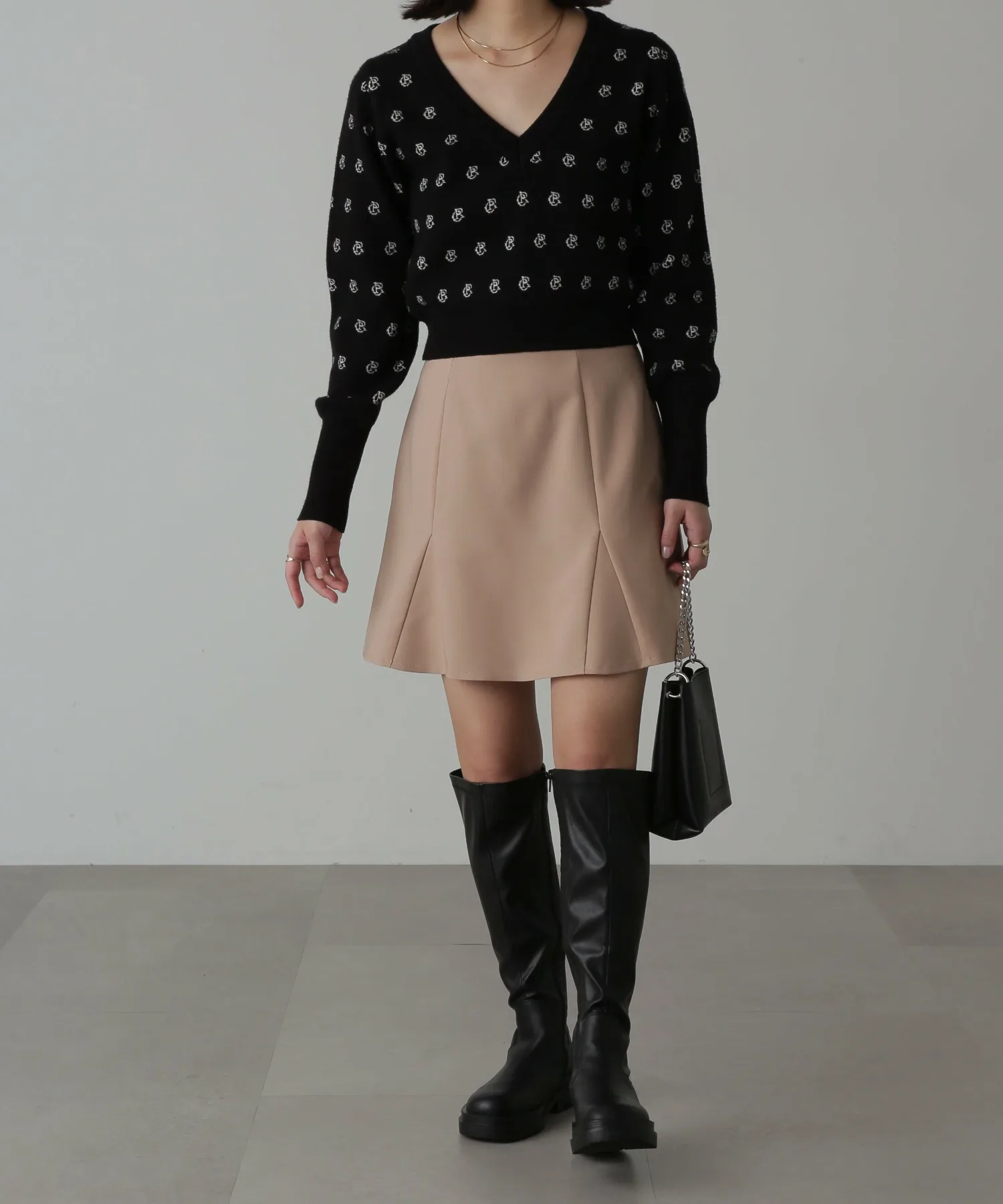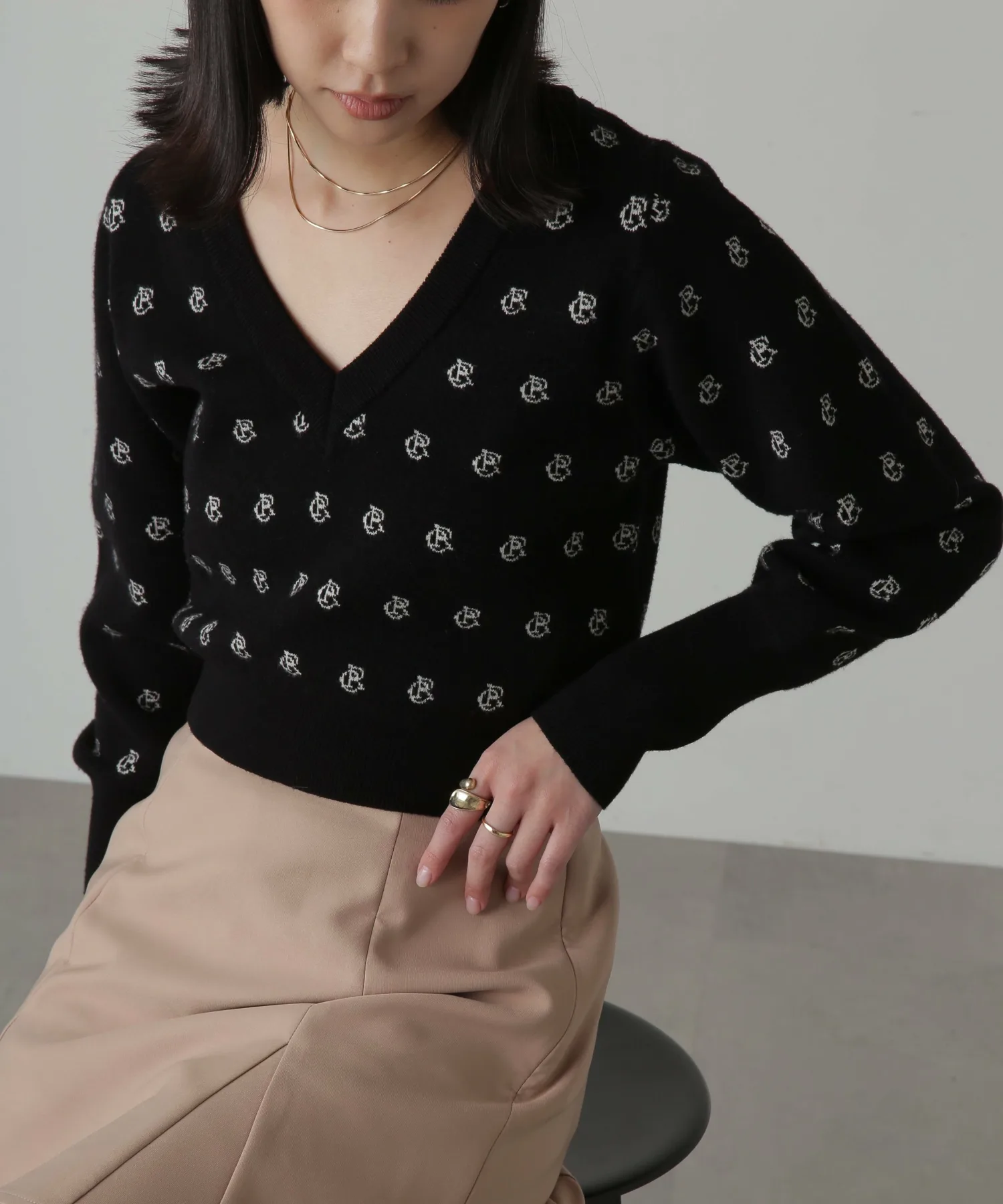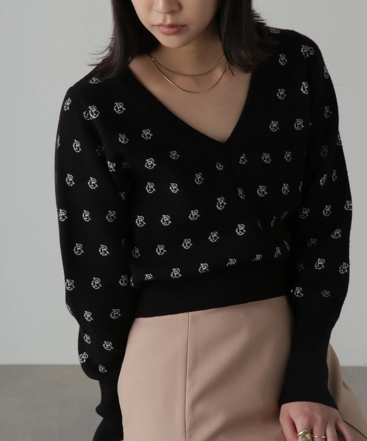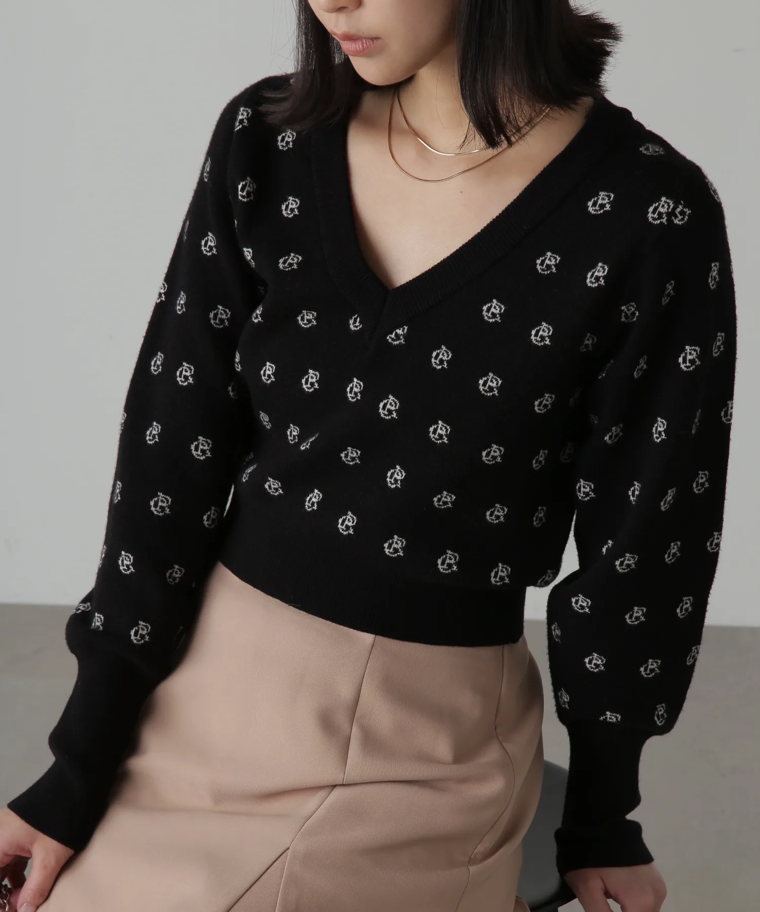 Трикотаж из смеси вискозы с логотипом, мягкий на ощупь и удобный в носке. V-образный вырез прекрасно подчеркивает декольте, а ширина изделия компактная. Рукава намеренно длинные, а объемная текстура на них также является изюминкой. Узор с инициалами выполнен в мягких тонах, что придает изделию женственный и милый вид. Узор выделяется, поэтому вы можете дополнить свой образ, просто сочетая его с джинсами или простыми брюками. Мы также рекомендуем сочетать его с мини-юбкой и высокими сапогами для создания женственного образа. *Значение логотипа с инициалами: CR = Повседневный и расслабленный