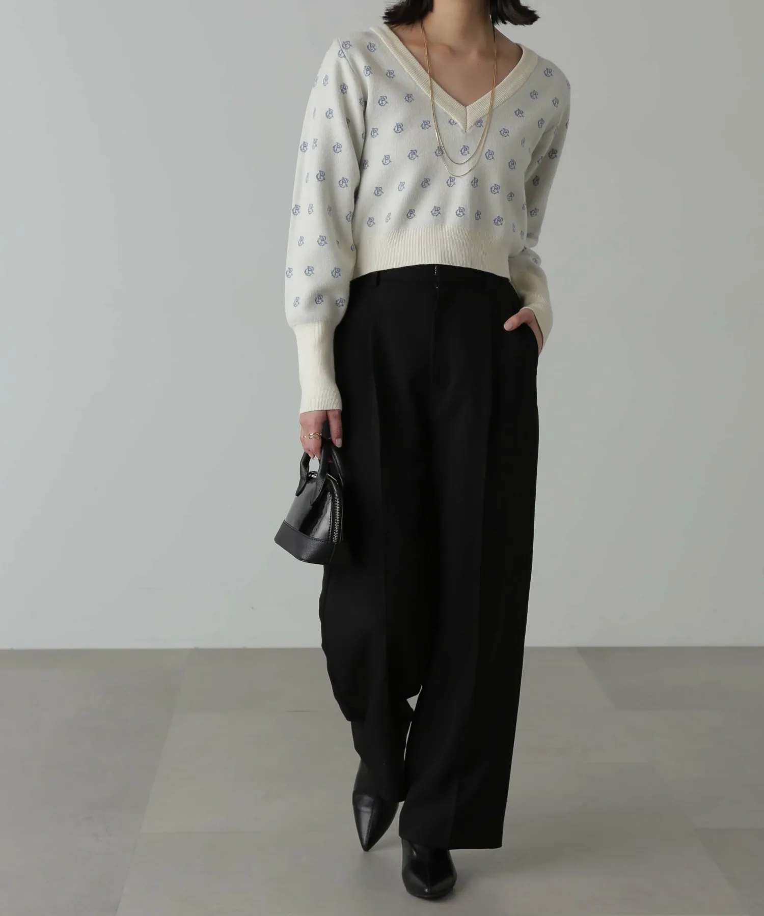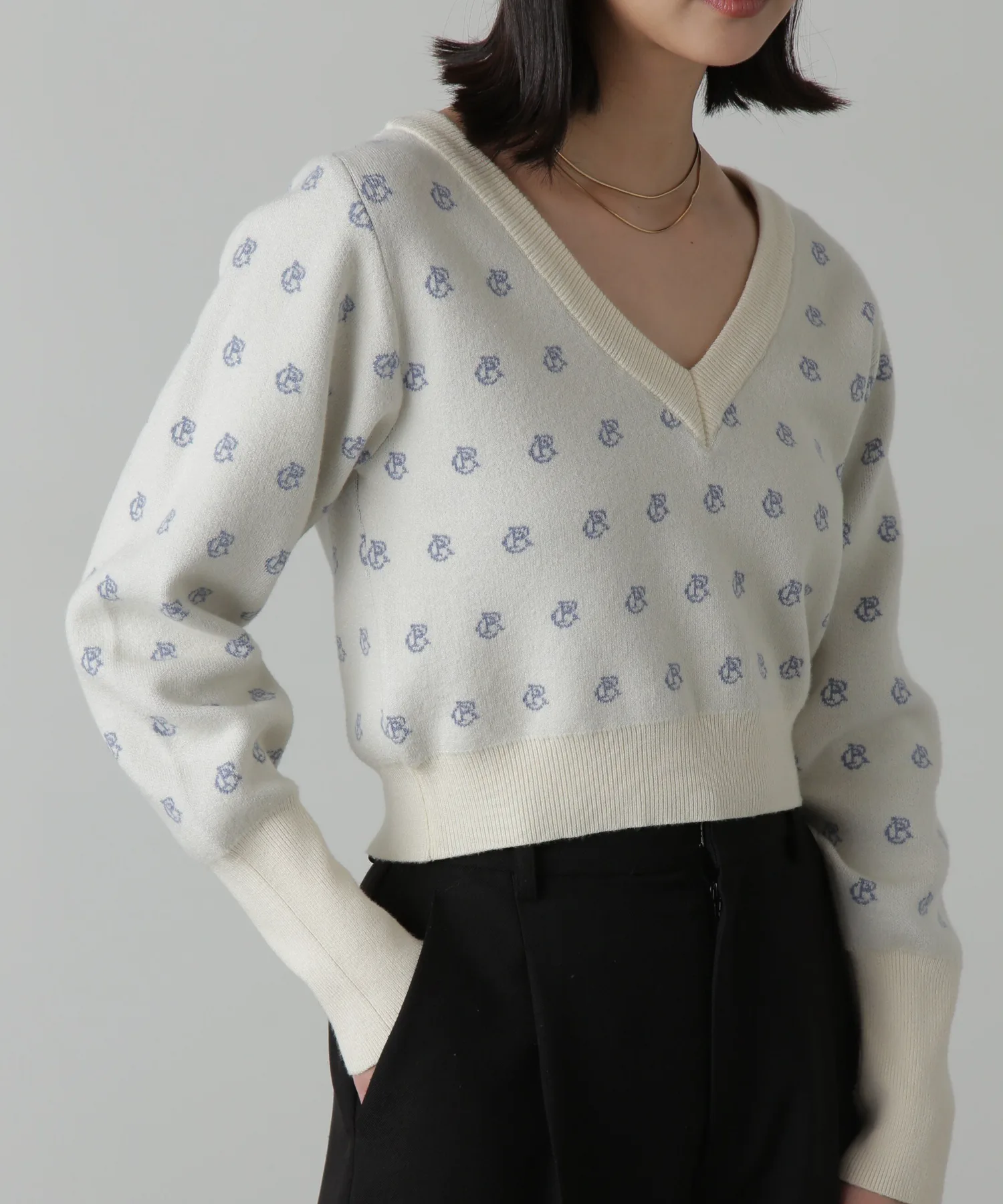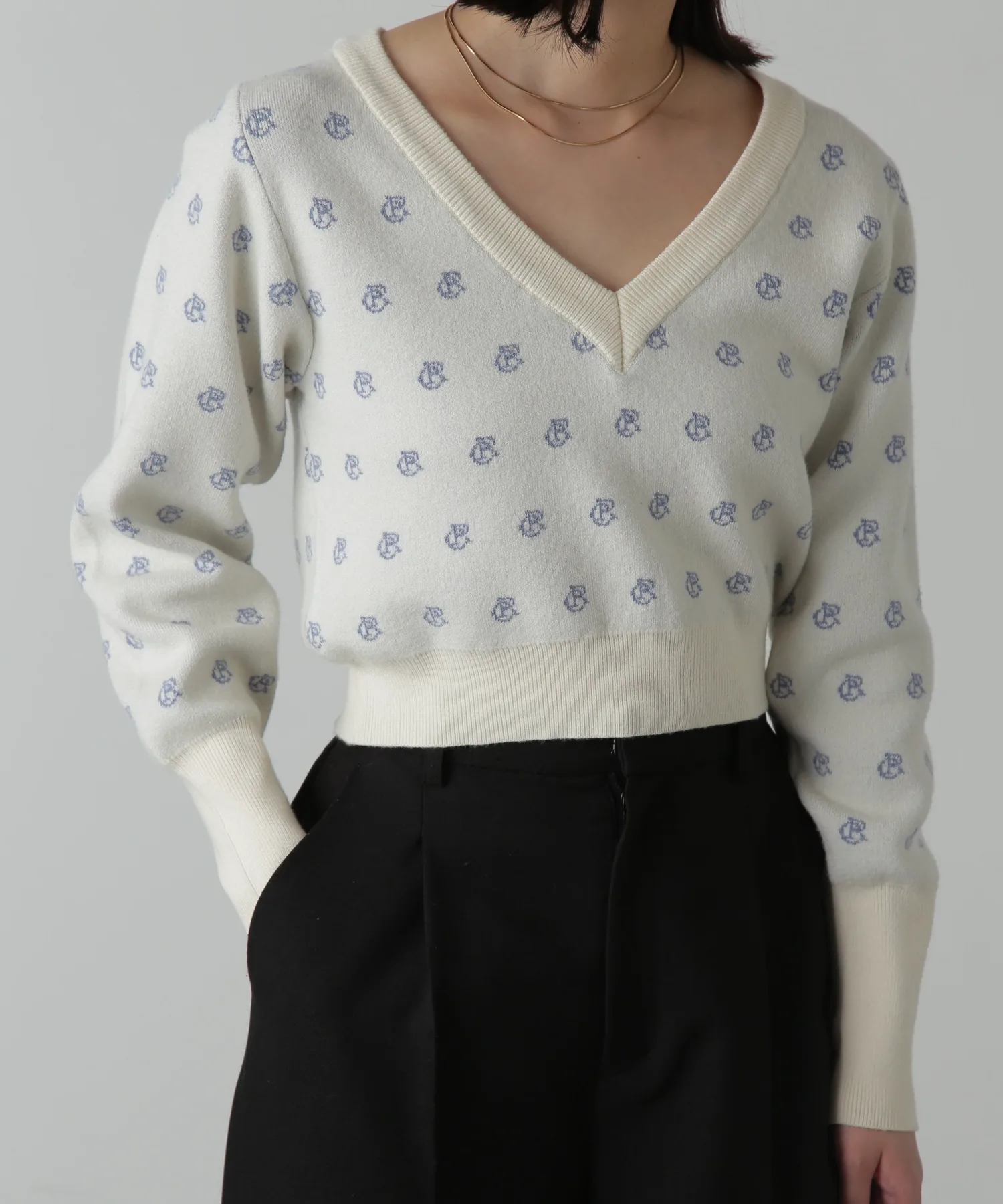 Трикотаж из смеси вискозы с логотипом, мягкий на ощупь и удобный в носке. V-образный вырез прекрасно подчеркивает декольте, а ширина изделия компактная. Рукава намеренно длинные, а объемная текстура на них также является изюминкой. Узор с инициалами выполнен в мягких тонах, что придает изделию женственный и милый вид. Узор выделяется, поэтому вы можете дополнить свой образ, просто сочетая его с джинсами или простыми брюками. Мы также рекомендуем сочетать его с мини-юбкой и высокими сапогами для создания женственного образа. *Значение логотипа с инициалами: CR = Повседневный и расслабленный