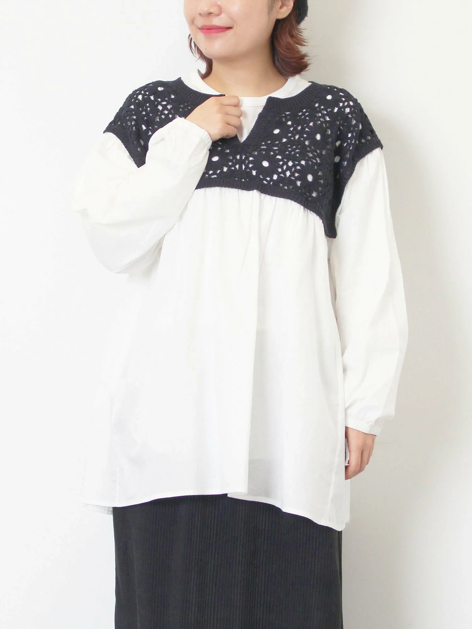 Туника с милым цветочным узором, выполненным в технике трикотажной вязки.