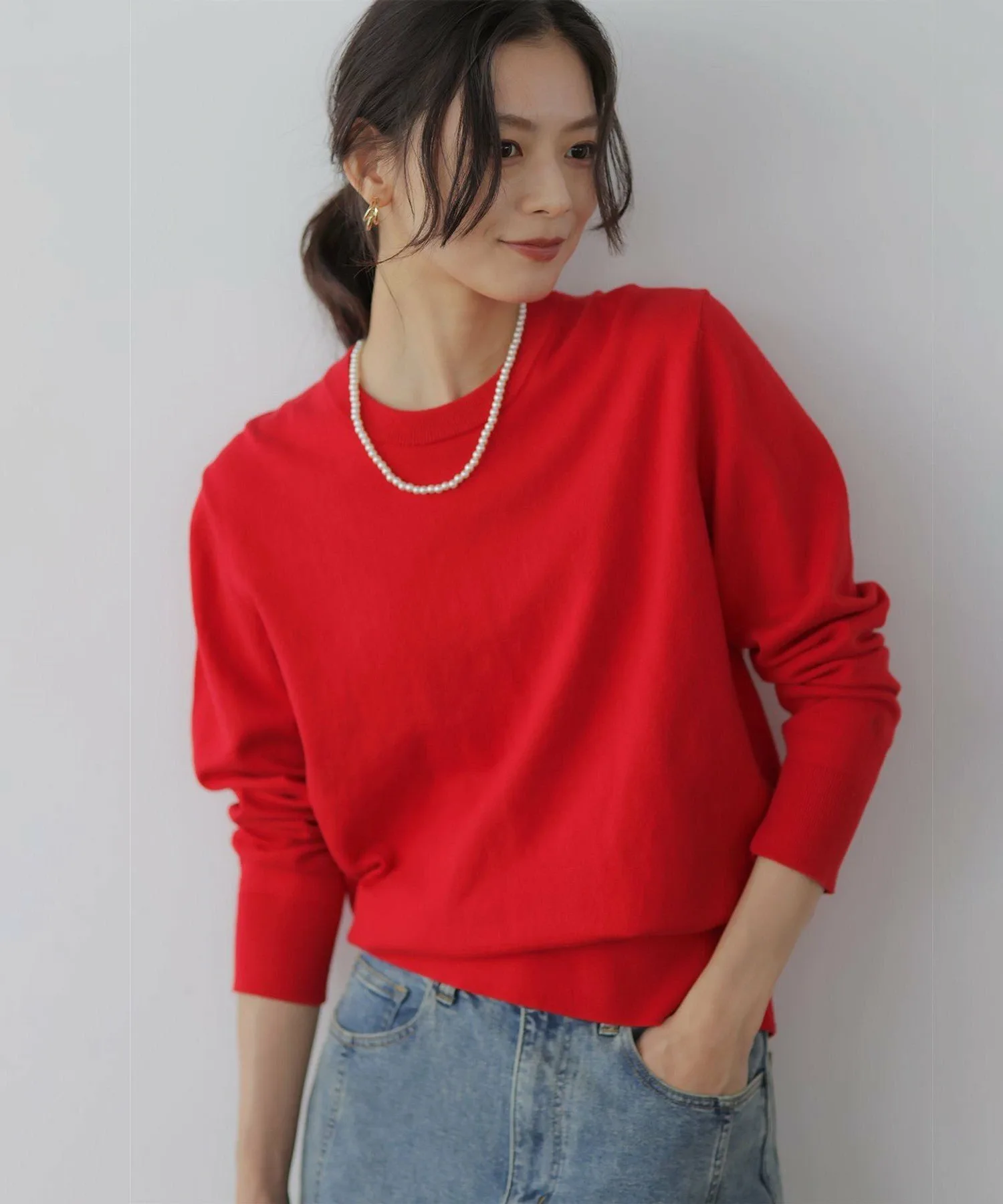 Материал・Хлопковый трикотаж с добавлением кашемира, идеально подходящий для адаптации к перепадам температуры. • Хлопок изготовлен из длинноволокнистого хлопка, что придает ему мягкость и легкий блеск. Этот хлопок смешан с высококачественным кашемиром, а затем покрыт эластичной пряжей для создания красивой трикотажной поверхности. Мягкая текстура кашемира делает эту вещь идеальной для создания изысканных образов.