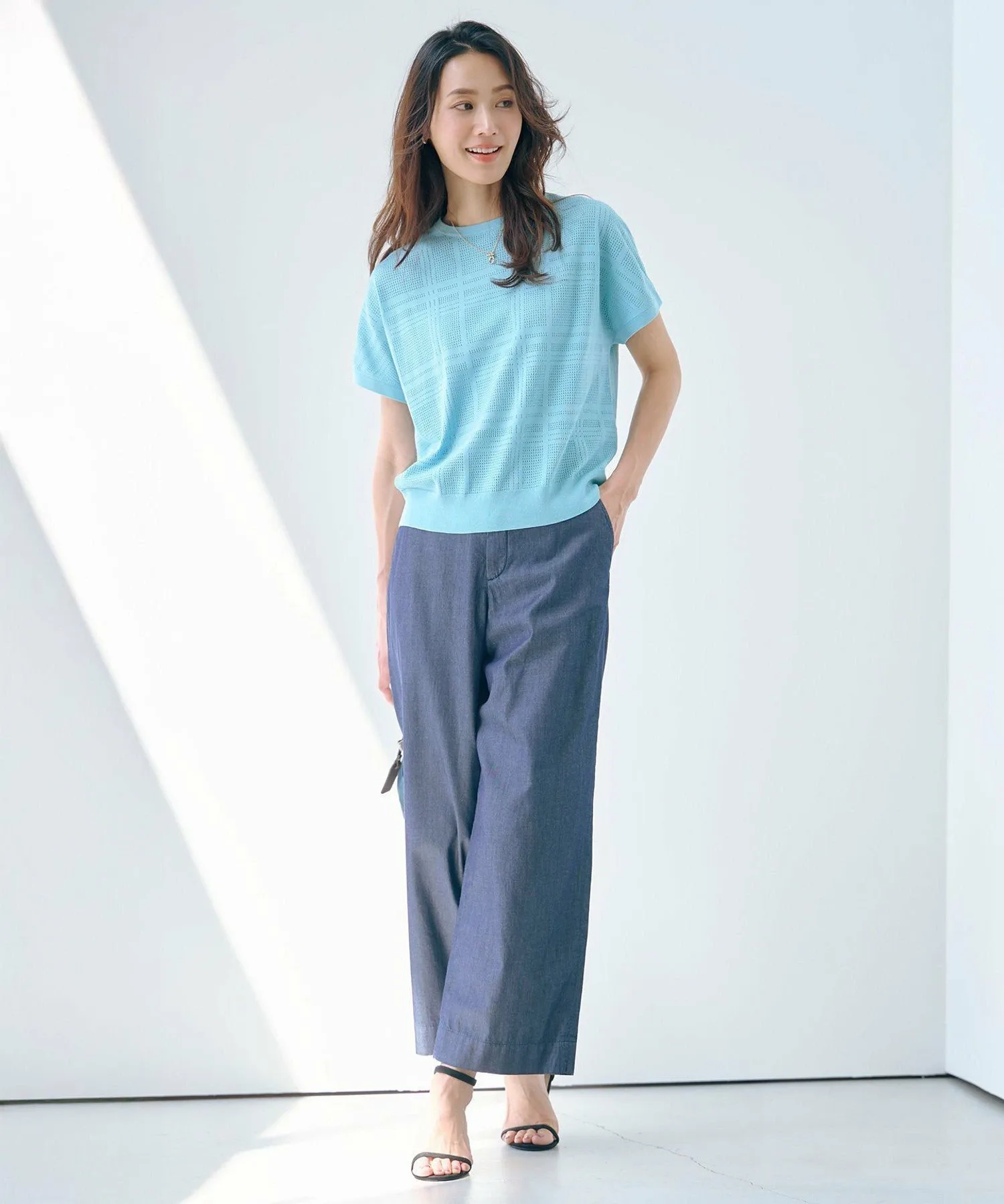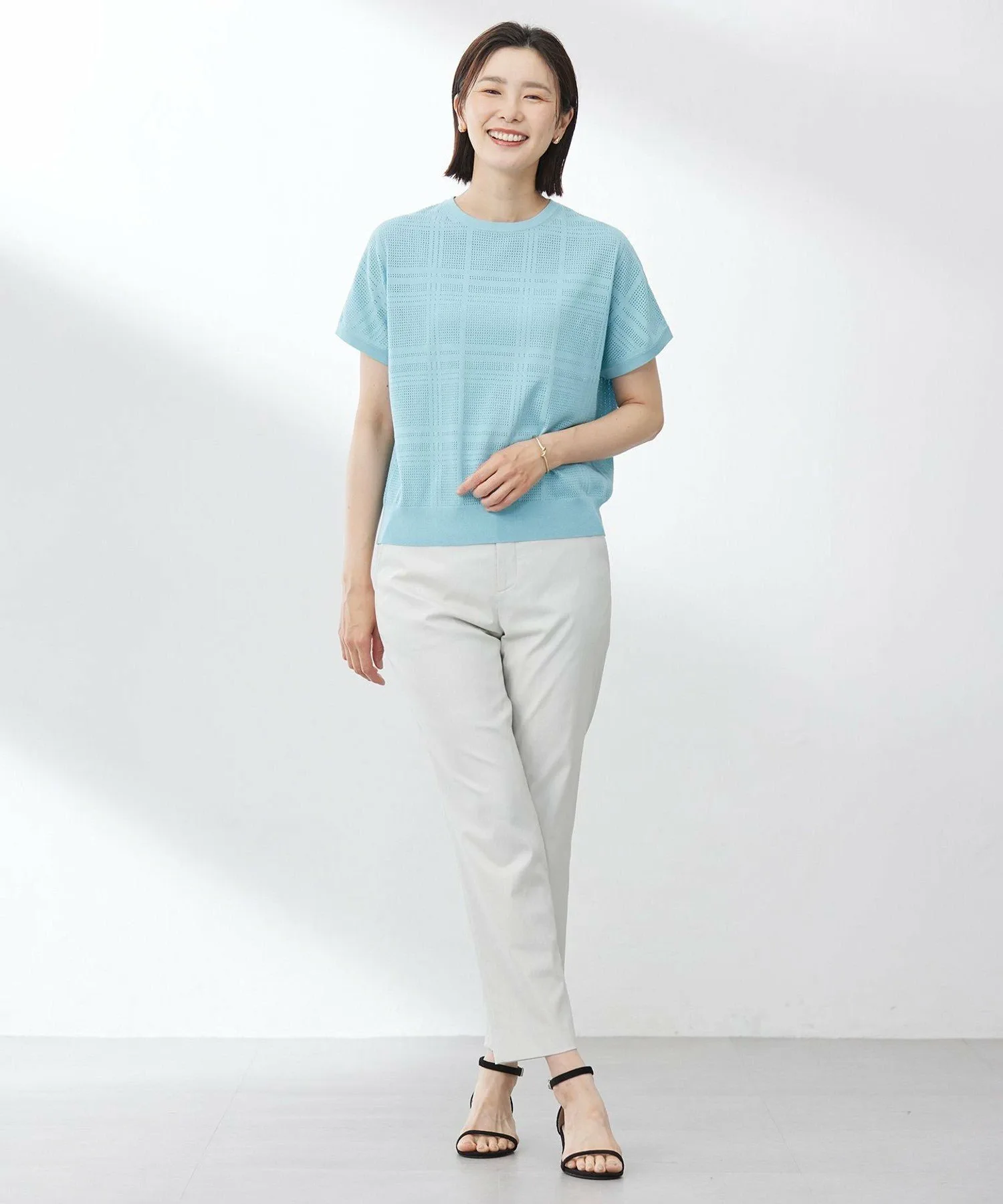 Добавьте нотку элегантности своему летнему образу! Летний трикотаж из натуральной сетчатой ткани. Дизайн Этот трикотаж выполнен из прохладной, освежающей сетчатой ткани. Легкая, полупрозрачная текстура создает изысканный, непринужденный образ, добавляя стиля вашему летнему наряду. Рукава достаточно длинные, чтобы закрывать предплечья, обеспечивая удобную и надежную посадку. Нежный клетчатый узор добавляет элегантности вашему образу, оставаясь при этом в тренде. Воздушный, свободный силуэт обеспечивает гладкую и комфортную посадку. Этот универсальный топ можно носить как самостоятельно, так и легко сочетать с брюками или юбками, что делает его незаменимым дополнением к вашему летнему гардеробу. Доступен в четырех цветах: мягкий и привлекательный светло-бежевый (#303), женственный розовый (#312), освежающий и привлекательный бирюзовый (#361) и изысканный темно-синий (#375), идеально подходящий как для формальной, так и для повседневной носки.