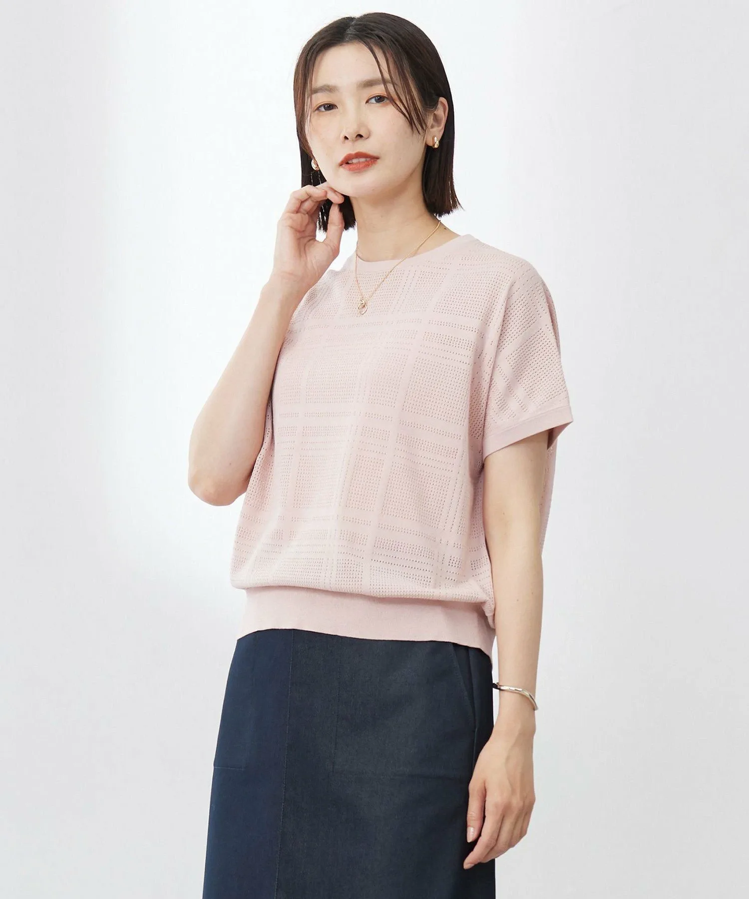 Добавьте нотку элегантности своему летнему образу! Летний трикотаж из натуральной сетчатой ткани. Дизайн Этот трикотаж выполнен из прохладной, освежающей сетчатой ткани. Легкая, полупрозрачная текстура создает изысканный, непринужденный образ, добавляя стиля вашему летнему наряду. Рукава достаточно длинные, чтобы закрывать предплечья, обеспечивая удобную и надежную посадку. Нежный клетчатый узор добавляет элегантности вашему образу, оставаясь при этом в тренде. Воздушный, свободный силуэт обеспечивает гладкую и комфортную посадку. Этот универсальный топ можно носить как самостоятельно, так и легко сочетать с брюками или юбками, что делает его незаменимым дополнением к вашему летнему гардеробу. Доступен в четырех цветах: мягкий и привлекательный светло-бежевый (#303), женственный розовый (#312), освежающий и привлекательный бирюзовый (#361) и изысканный темно-синий (#375), идеально подходящий как для формальной, так и для повседневной носки.