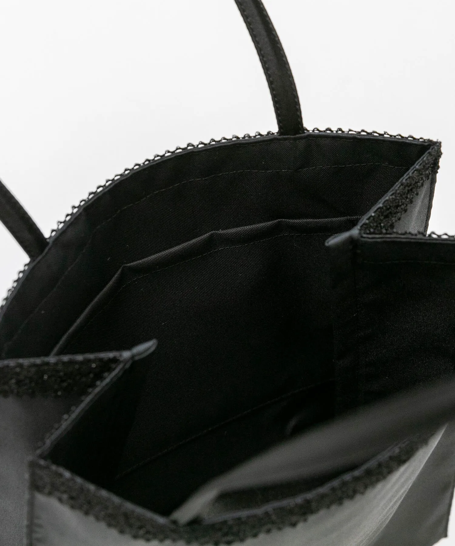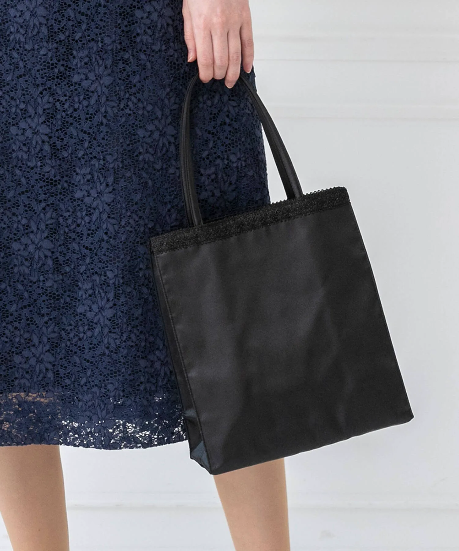 Сумка-тоут, украшенная изысканным кружевным мотивом. Она элегантна и подходит для торжественных случаев. *Обратите внимание, что кружевной узор отличается в черном, серебряном и золотом вариантах.