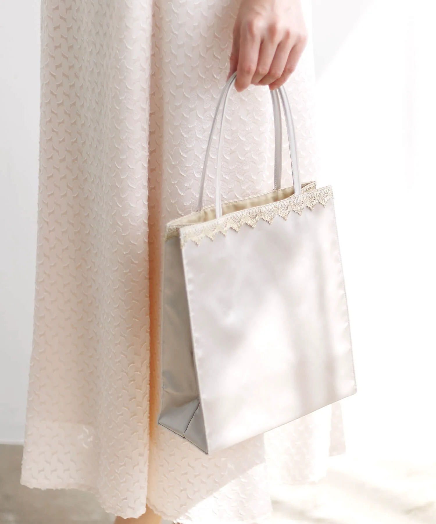 Сумка-тоут, украшенная изысканным кружевным мотивом. Она элегантна и подходит для торжественных случаев. *Обратите внимание, что кружевной узор отличается в черном, серебряном и золотом вариантах.