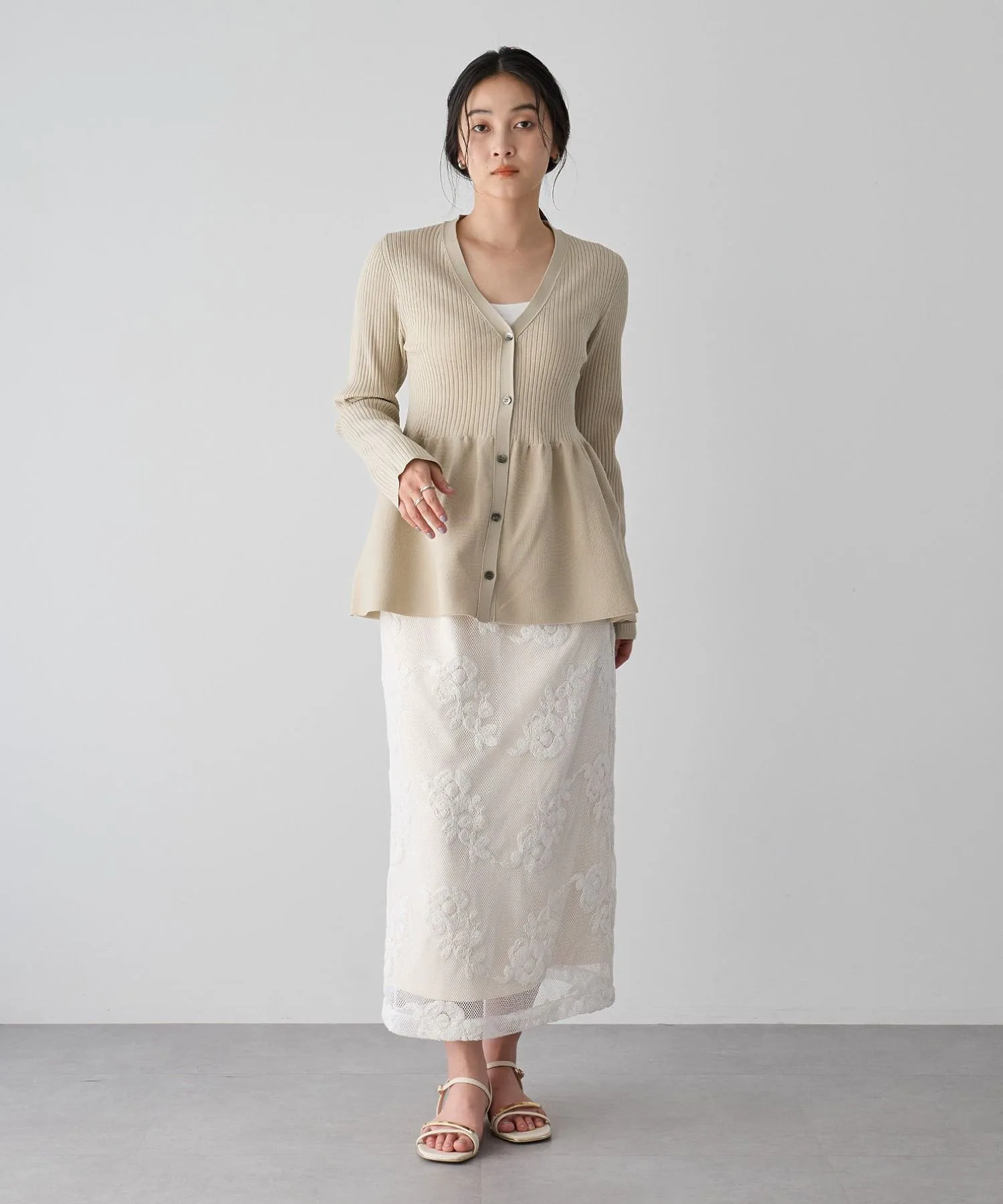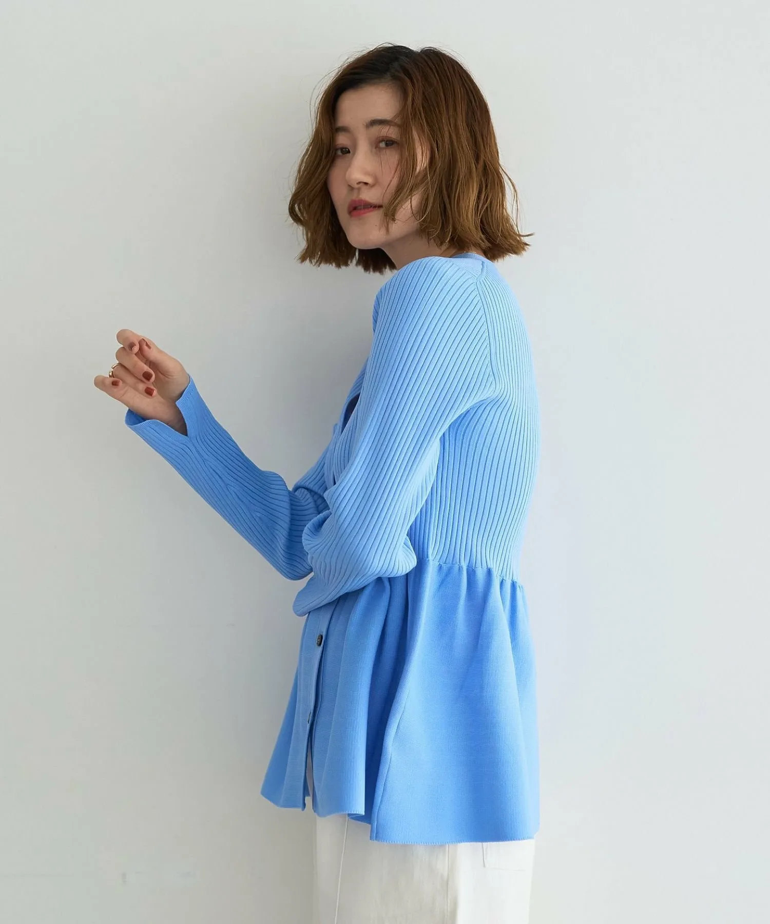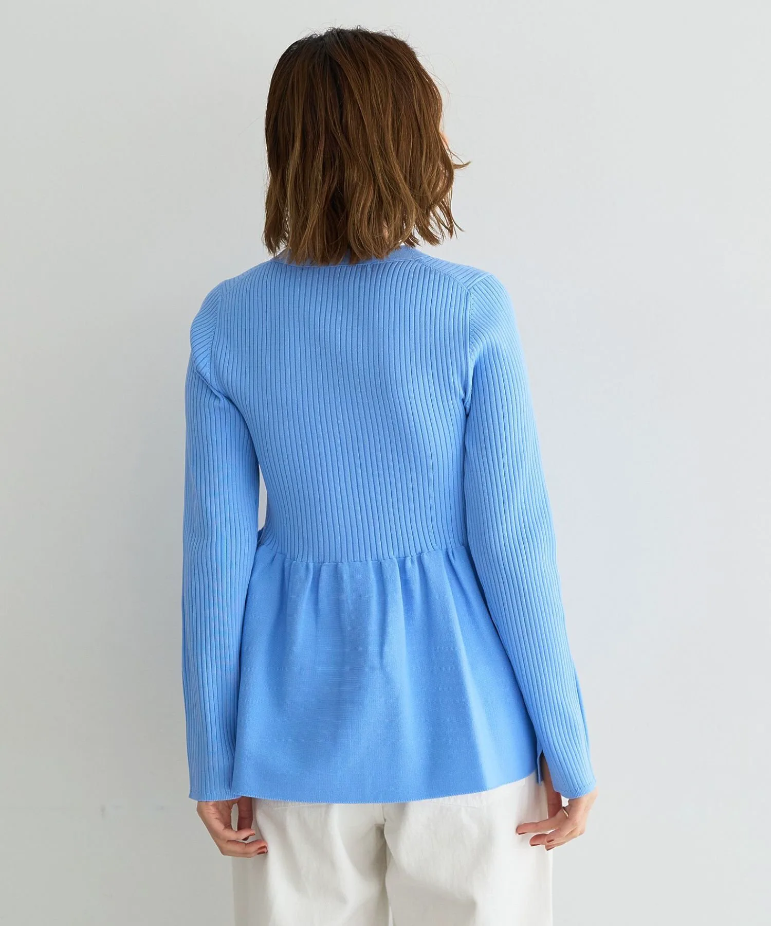 Кардиган с баской, плавно расширяющейся от линии талии.