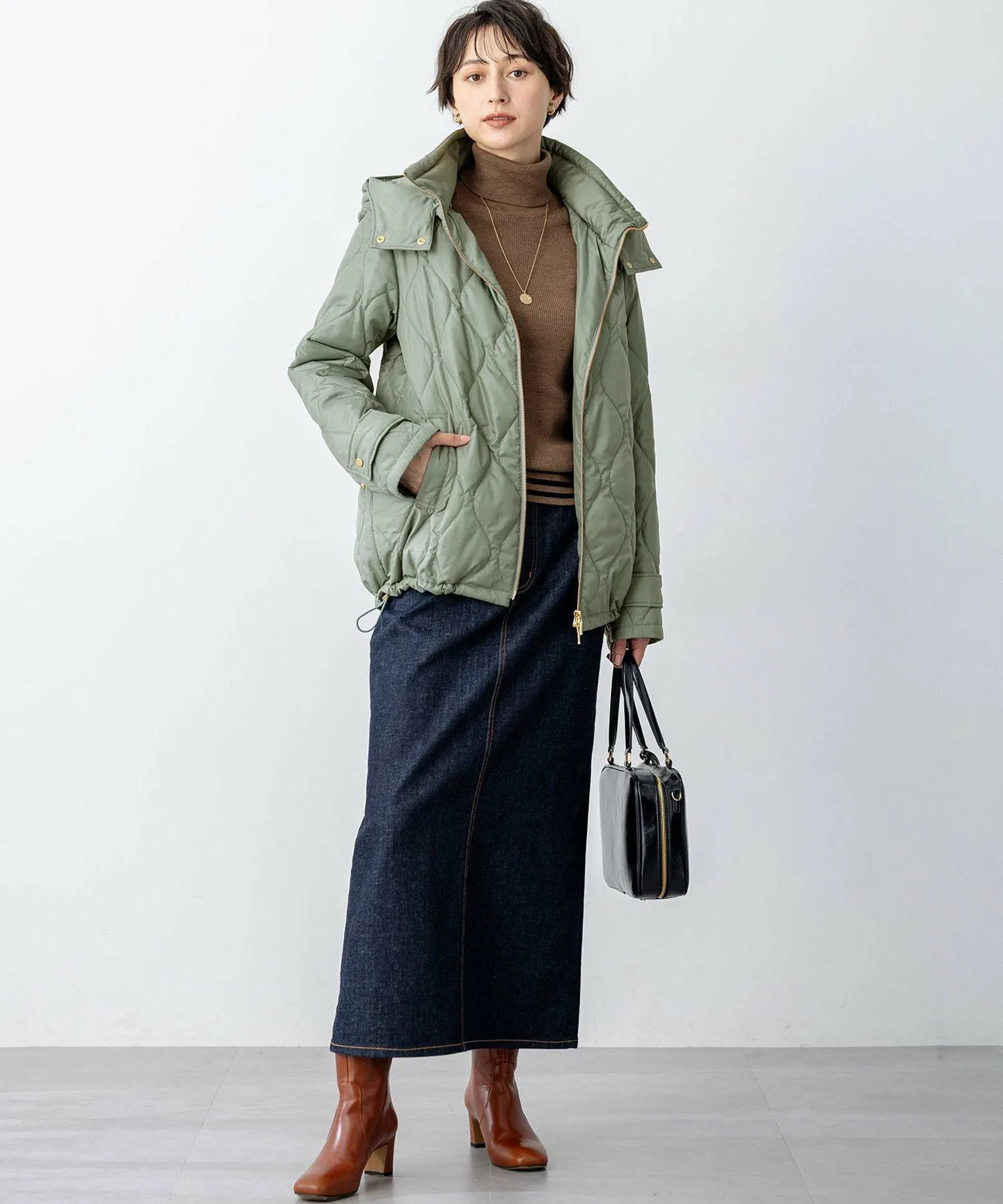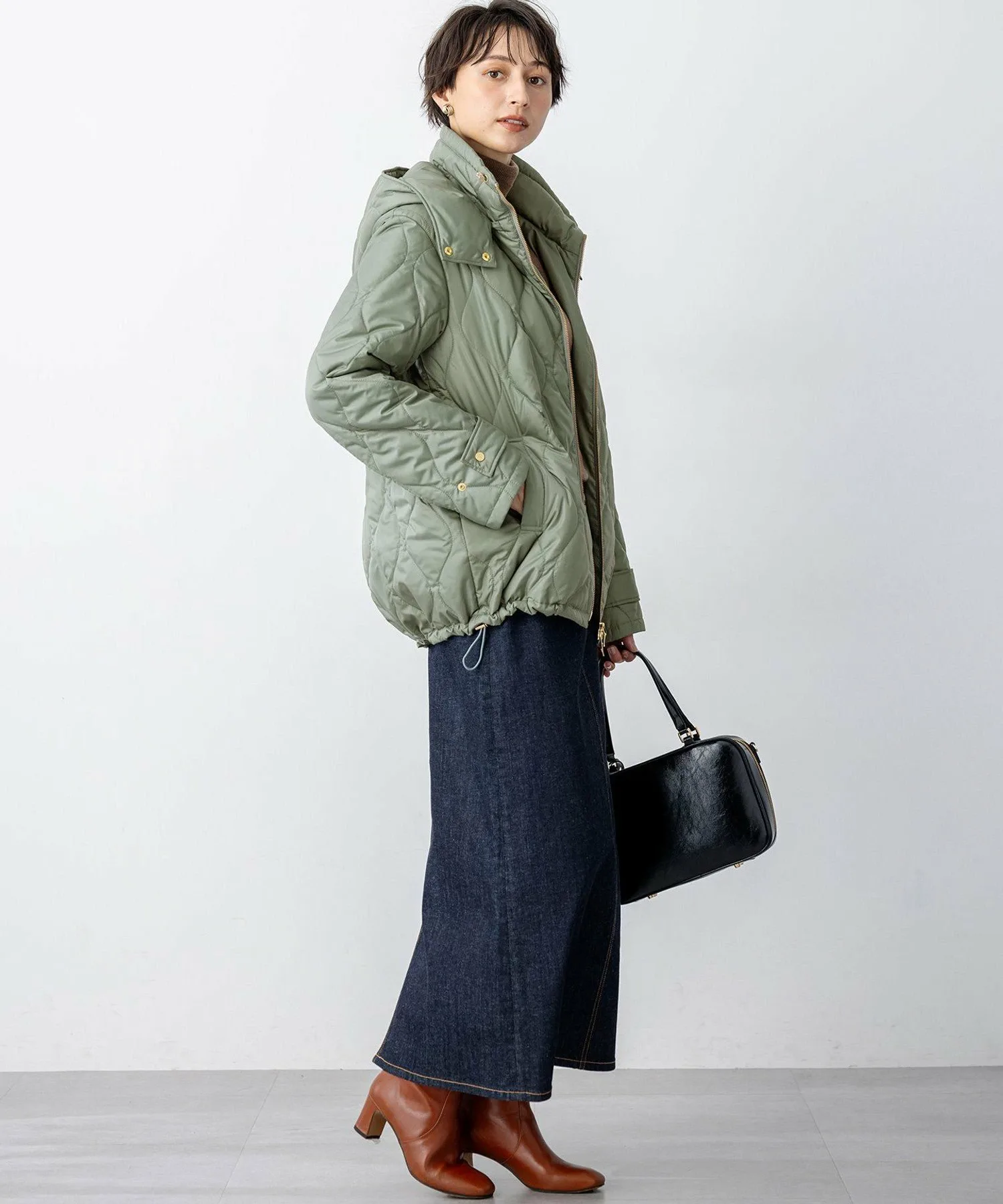 Эта утепленная верхняя одежда имеет съемный капюшон. Слегка высокий воротник создает привлекательный вид даже в расстегнутом виде. Металлическая застежка-молния по краю воротника и металлическая молния спереди добавляют акценты. Обратная молния позволяет менять образ в зависимости от брюк или юбки. Вы также можете изменить стиль, заузив подол, чтобы создать округлый силуэт. Доступна в четырех цветах: натуральный бежевый (#033), нежно-зеленый (#053), элегантный темно-серый (#004) и модный черный (#005).
