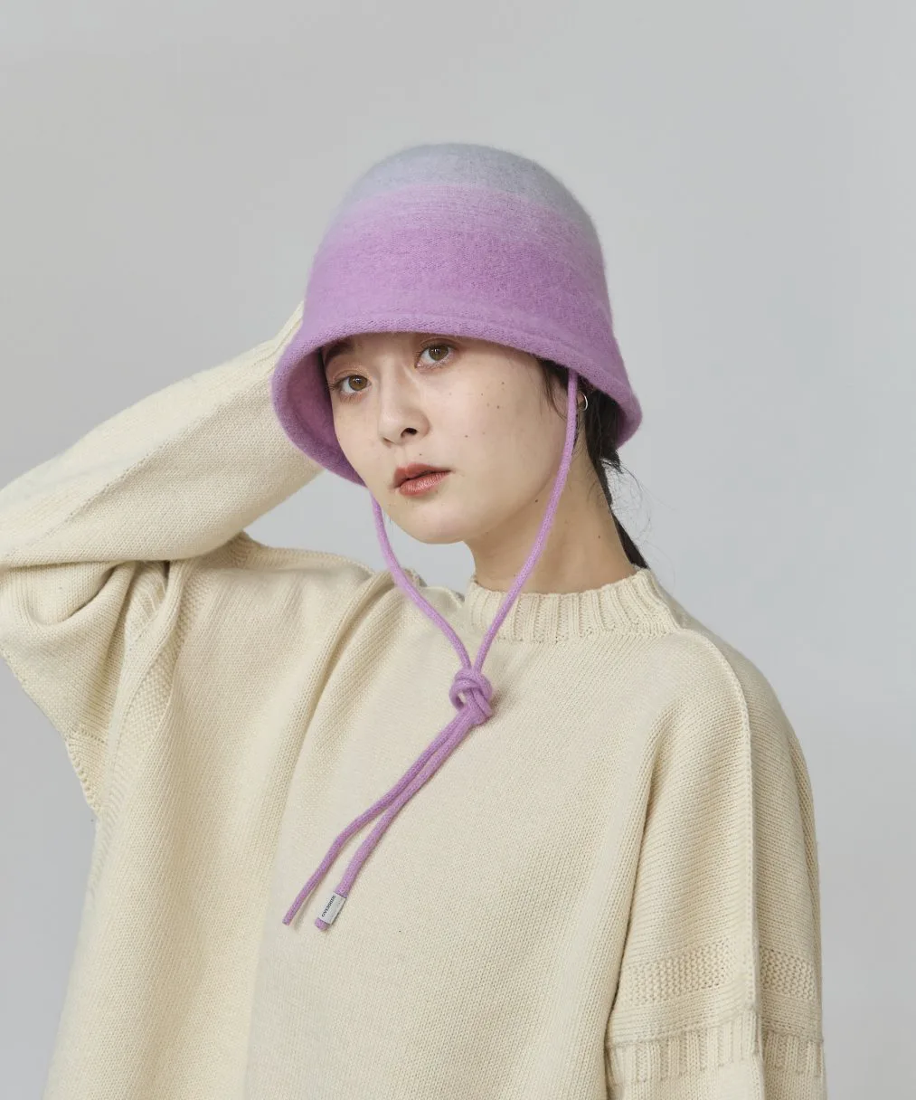 Эта шапка-тюльпан из двух частей изготовлена из войлочной шерсти. Внешний слой выполнен из смеси шерсти китайского енота, создавая мягкую, пушистую, ворсистую текстуру, идеально подходящую для осени и зимы. Это повседневная шапка, а внутренний слой изготовлен из войлочной шерстяной вязки. Наслаждайтесь контрастными текстурами спереди и сзади. Ее также можно носить с обеих сторон. Носите завязки свободно, завяжите их под подбородком, завяжите на макушке или завяжите сзади для создания банта. Поднимите или опустите поля для разнообразных вариантов укладки. В этом сезоне внешний слой был обновлен с помощью мягкого градиентного узора. Она сохраняет свою форму даже в сложенном или свернутом виде, что делает ее удобной для переноски.