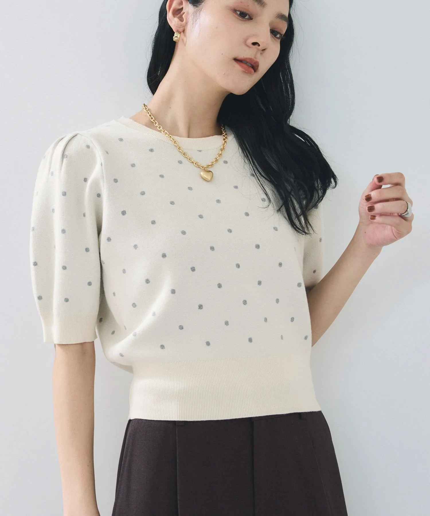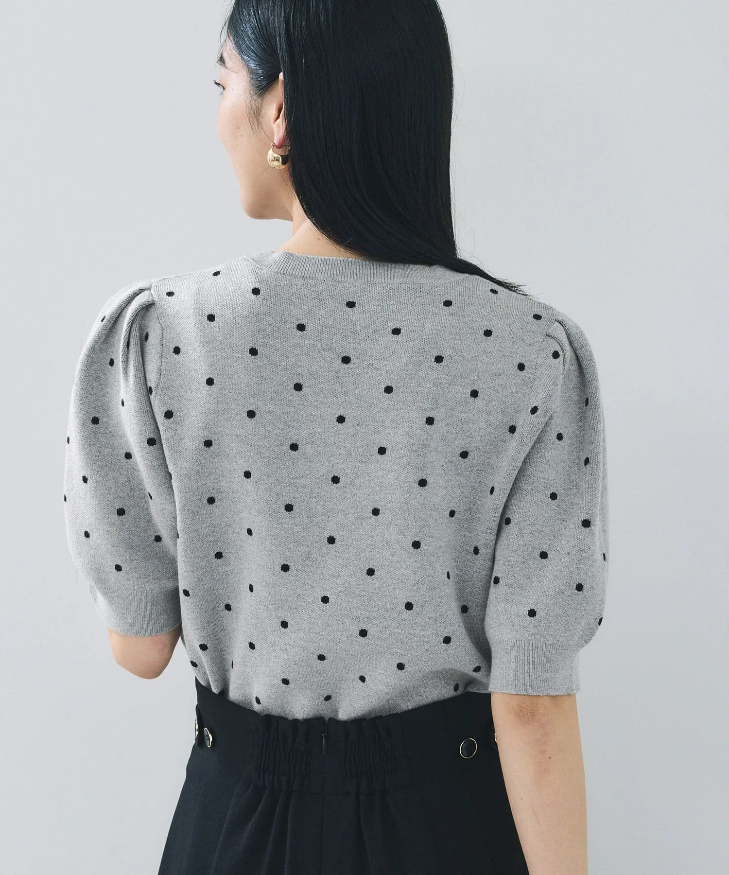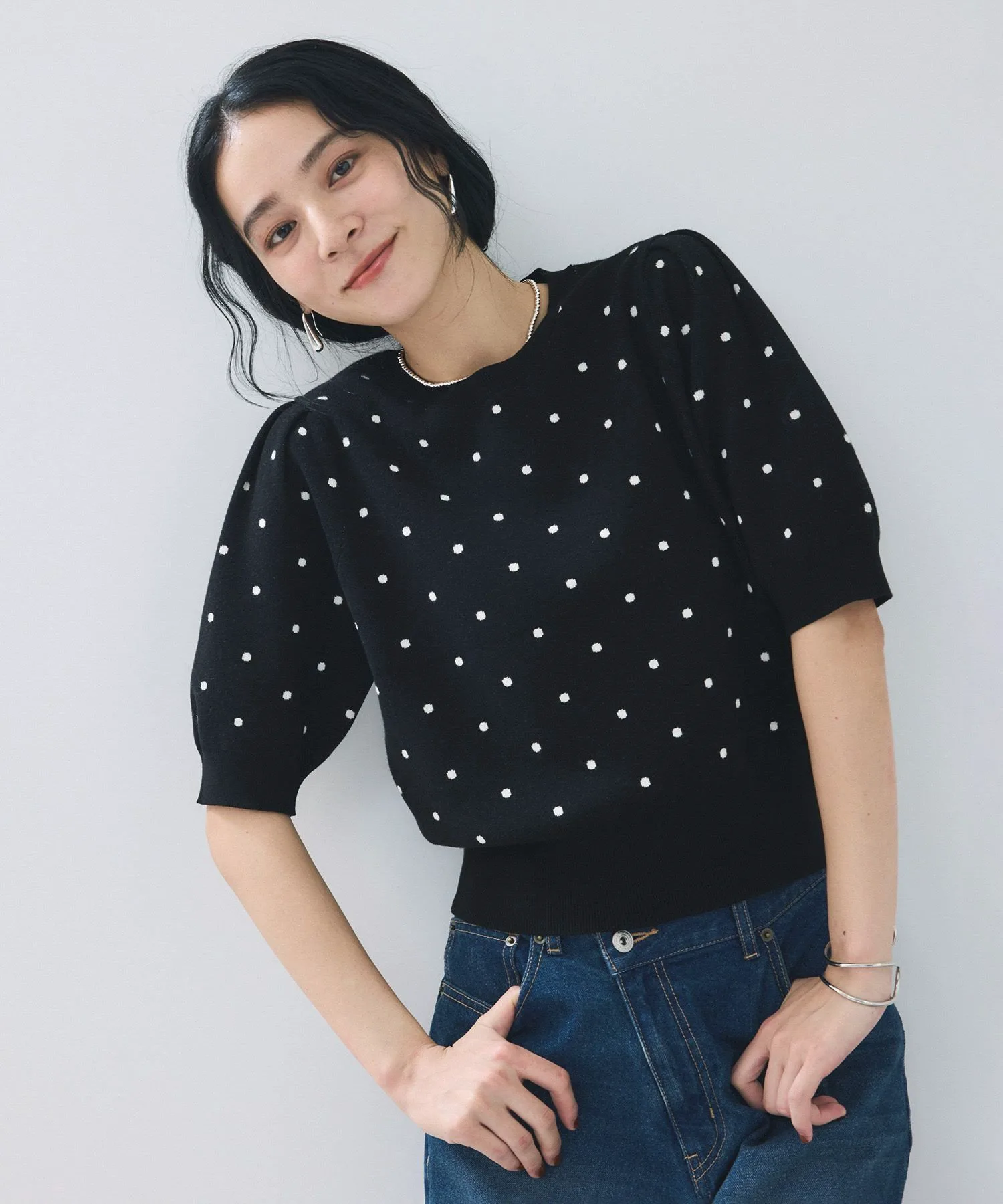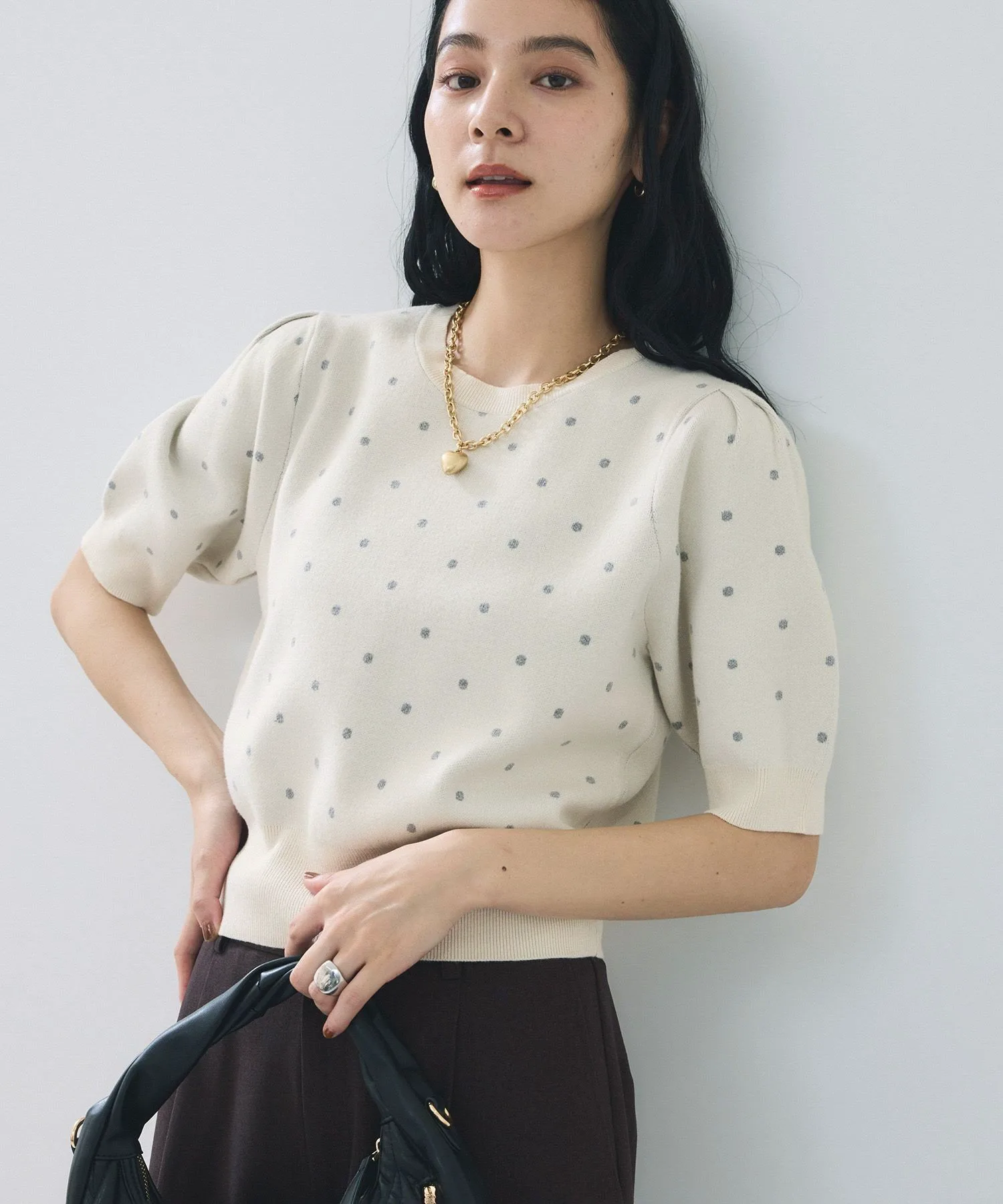 Круглый вырез горловины позволяет легко сочетать его с изящными ожерельями. Узор в горошек универсален и подходит как для формальных, так и для повседневных случаев, что делает эту вещь универсальной.