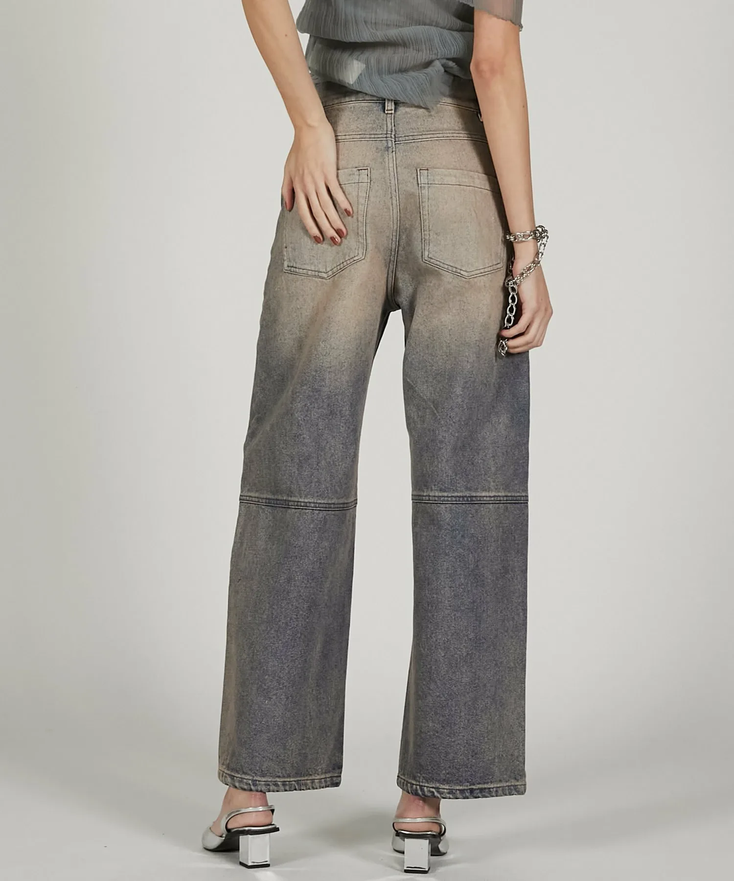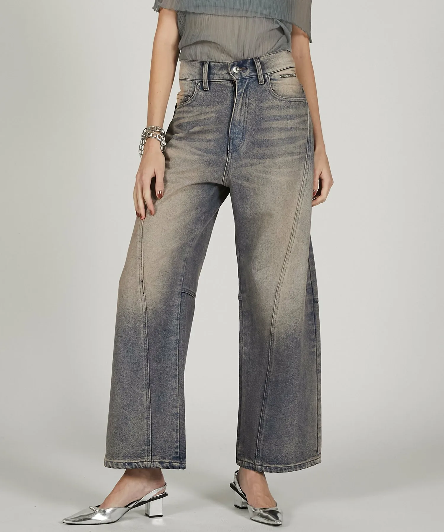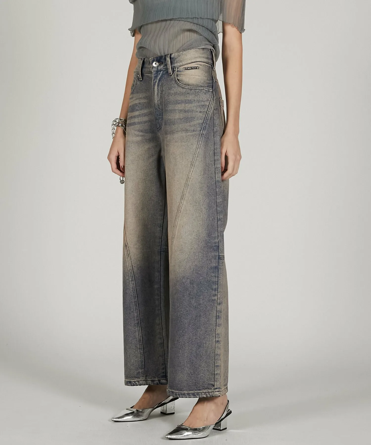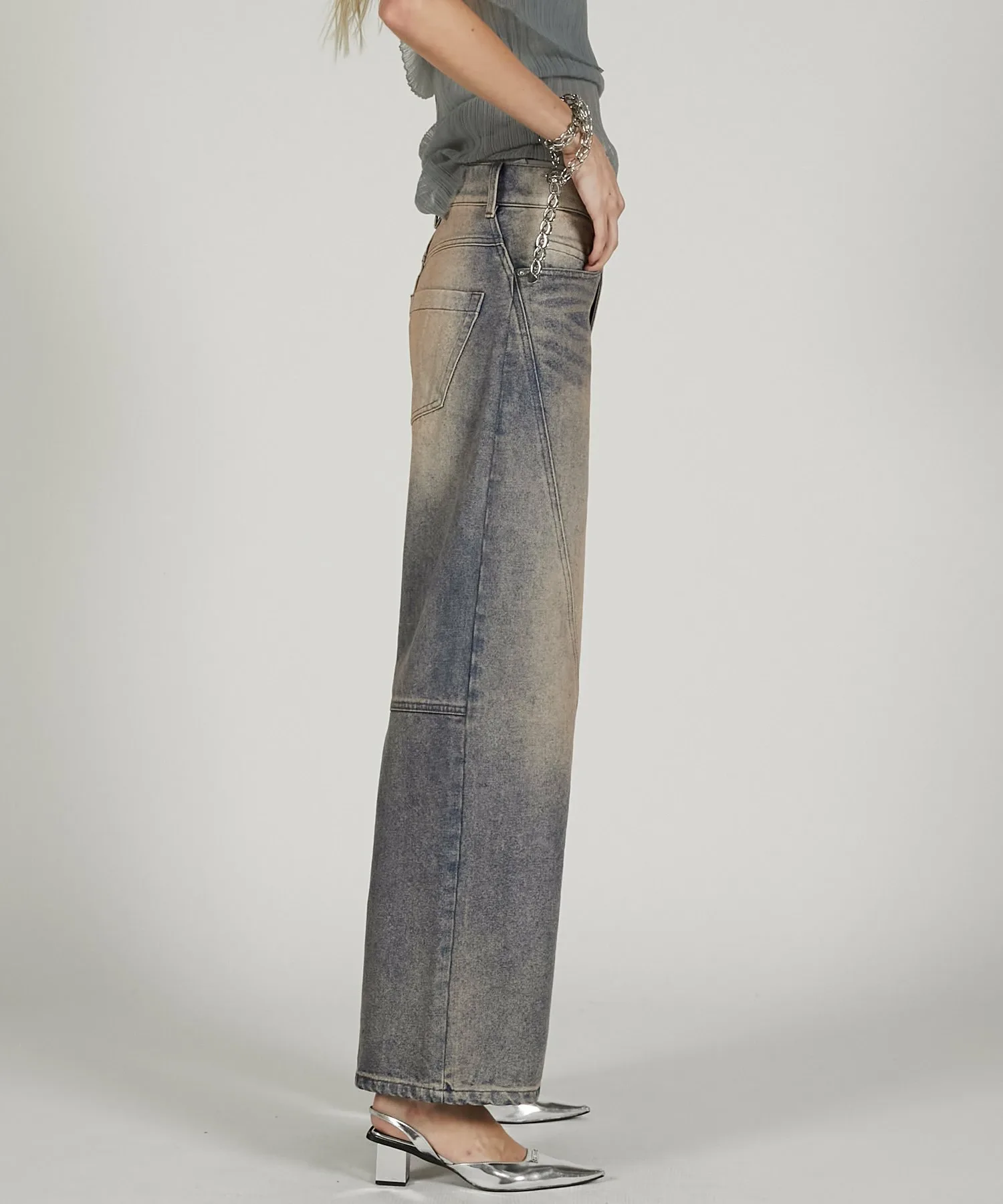 Широкие джинсовые брюки с изогнутыми внутрь вставками.