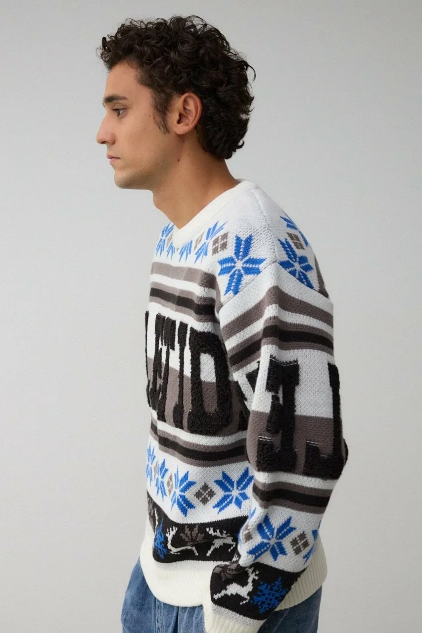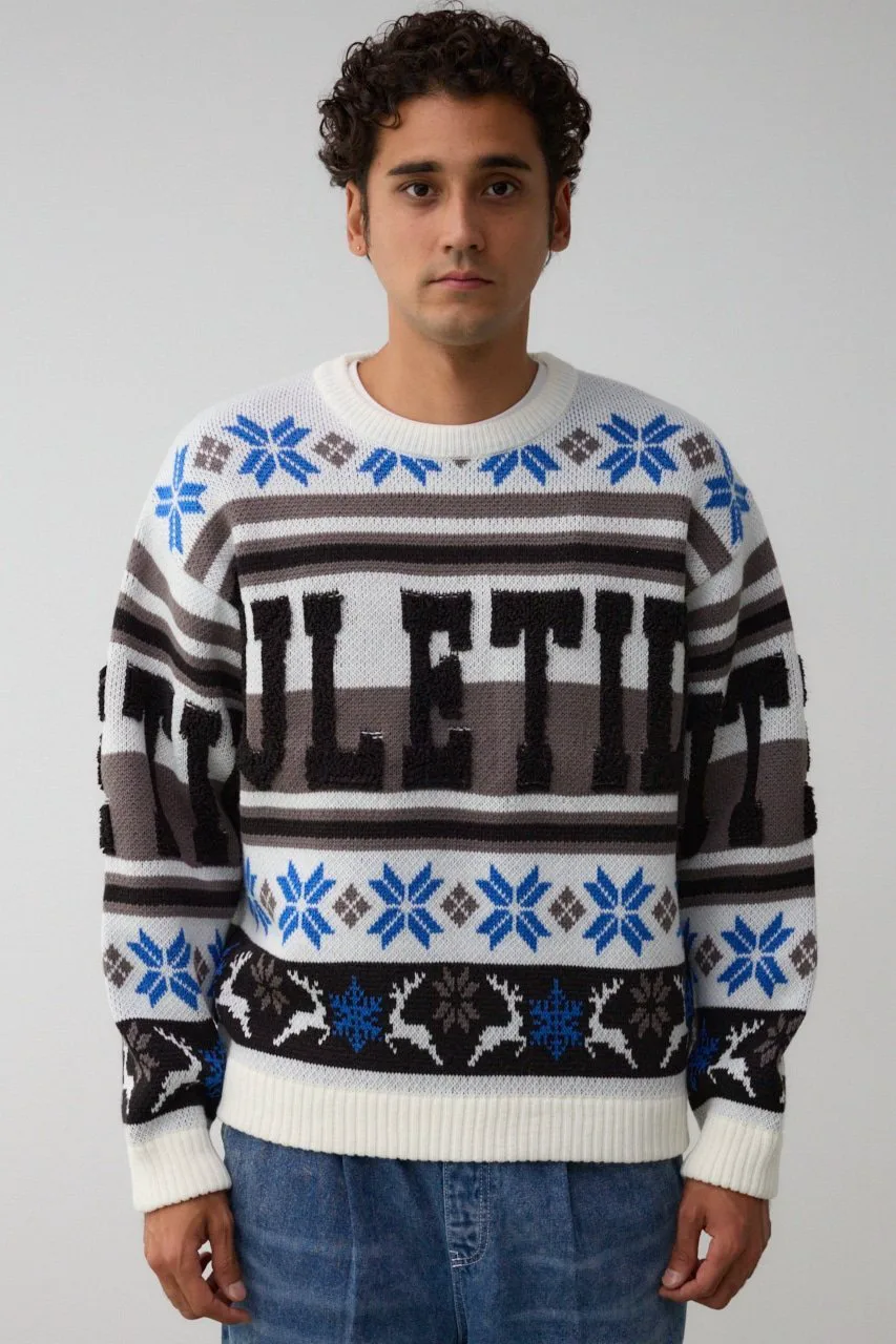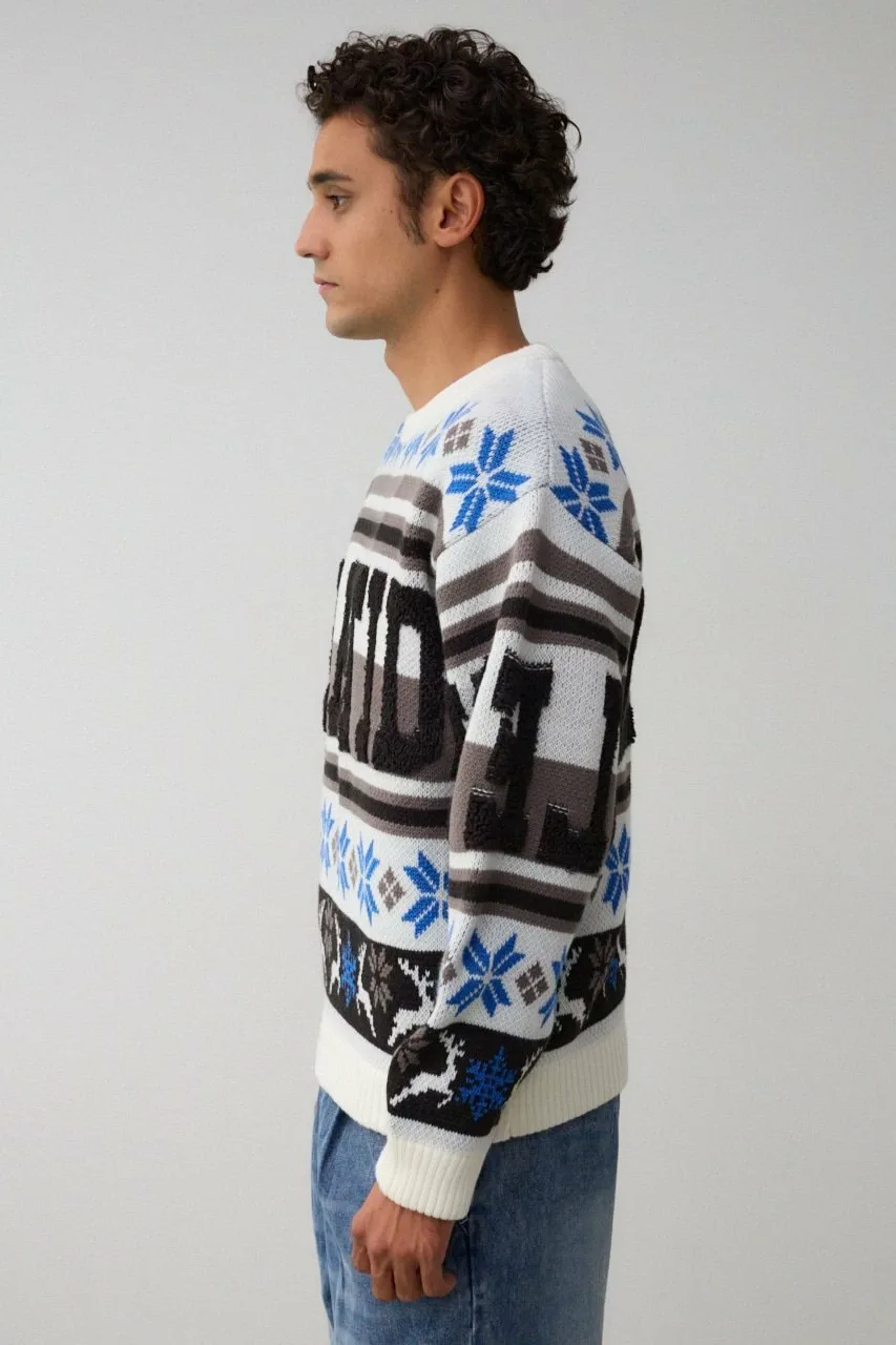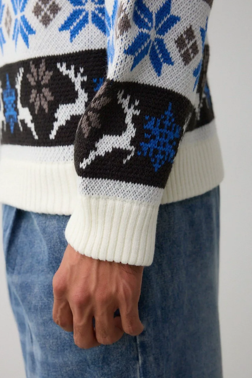 Этот жаккардовый свитер выполнен в технике петлевого вязания, поэтому из-за особенностей свитера и материала на поверхности могут встречаться небольшие узелки и свободные нити.