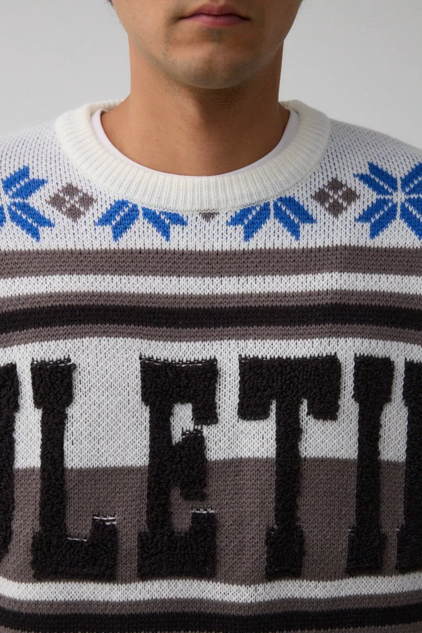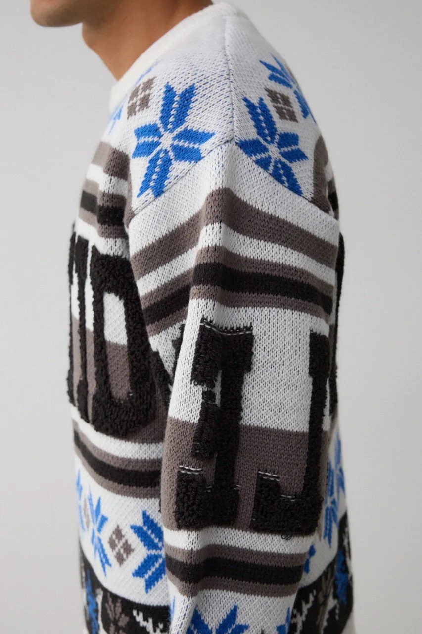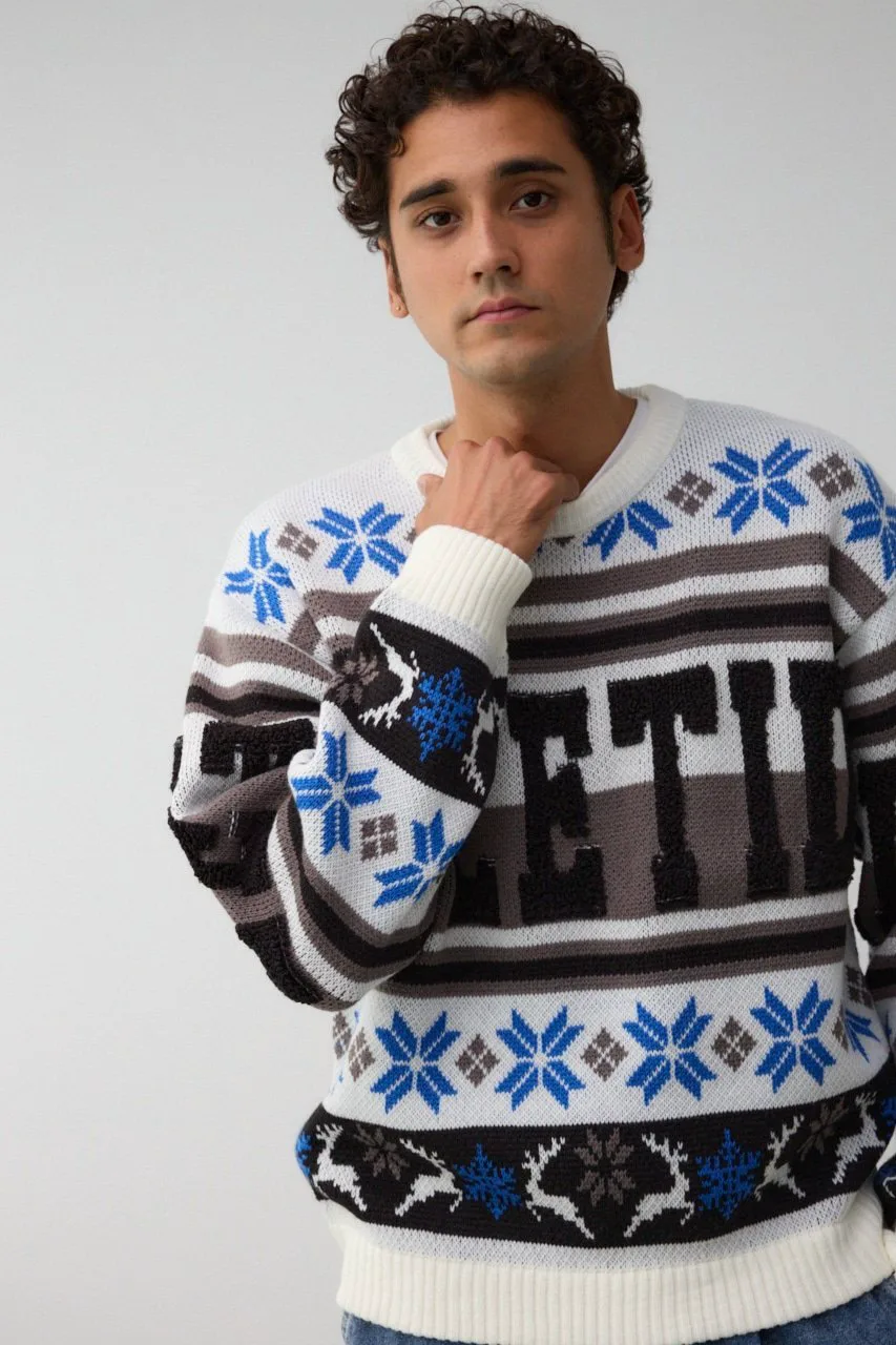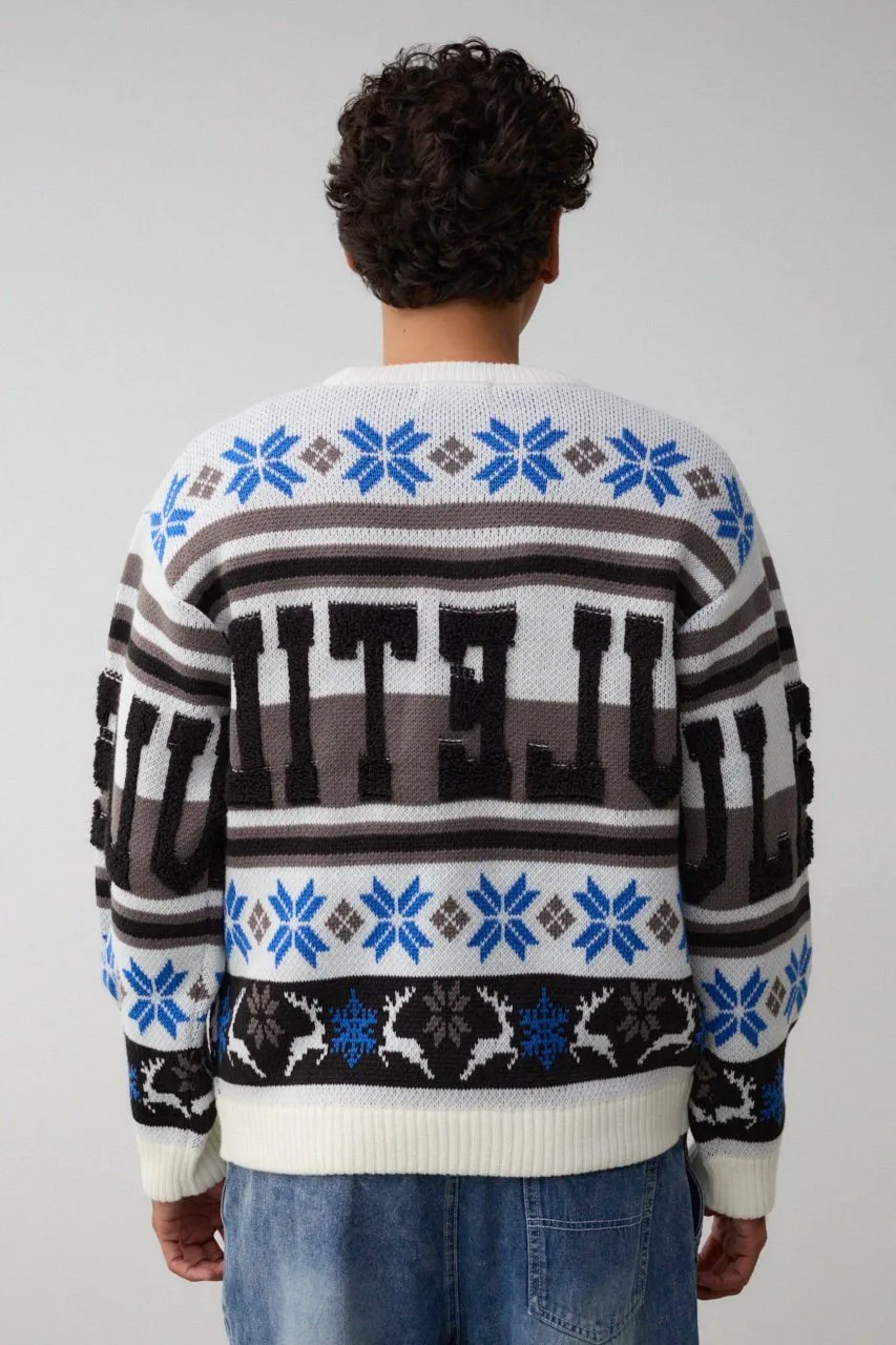 Этот жаккардовый свитер выполнен в технике петлевого вязания, поэтому из-за особенностей свитера и материала на поверхности могут встречаться небольшие узелки и свободные нити.