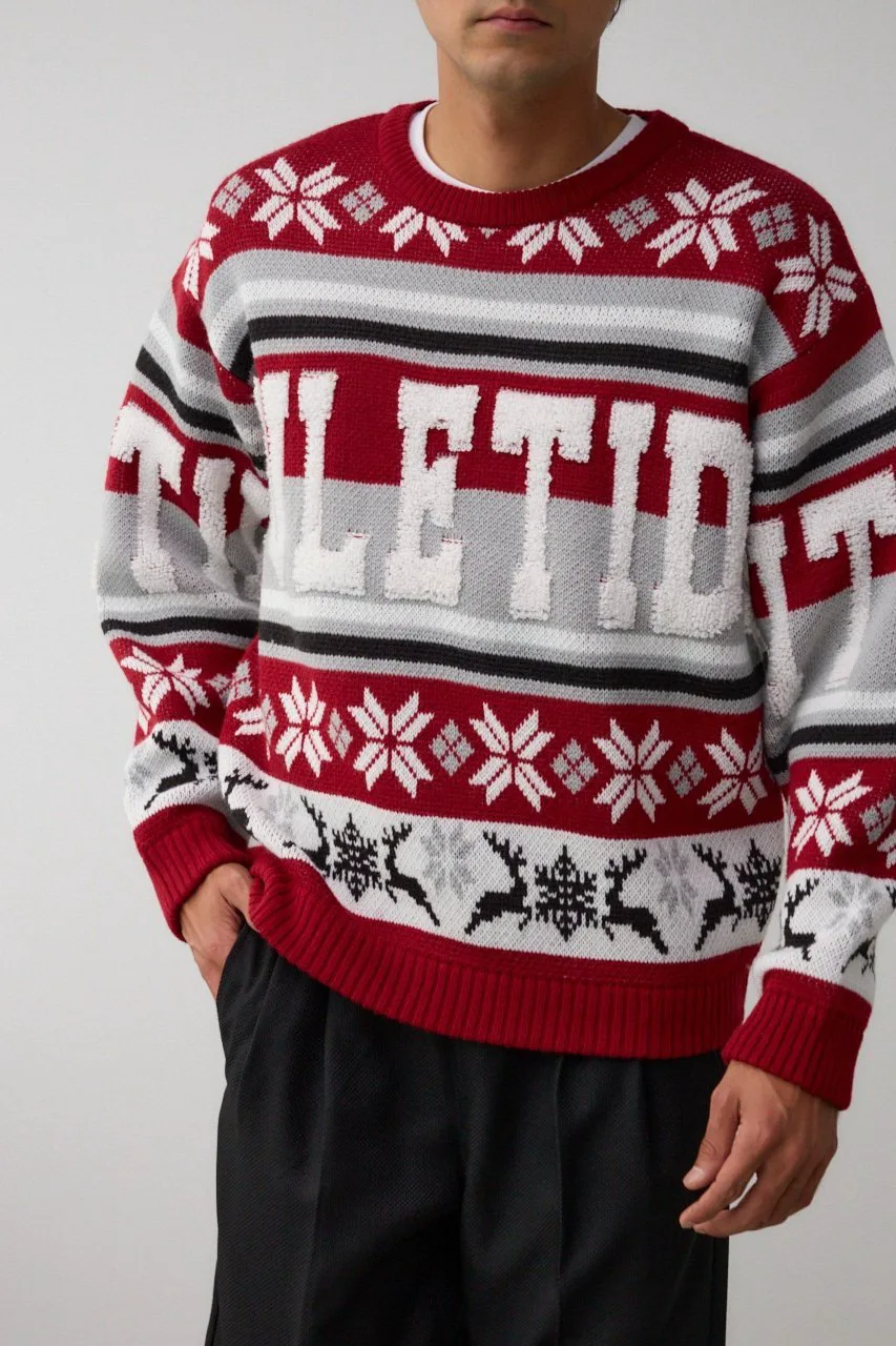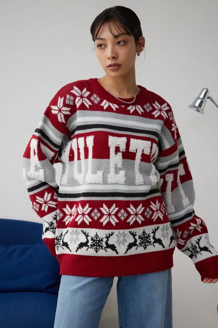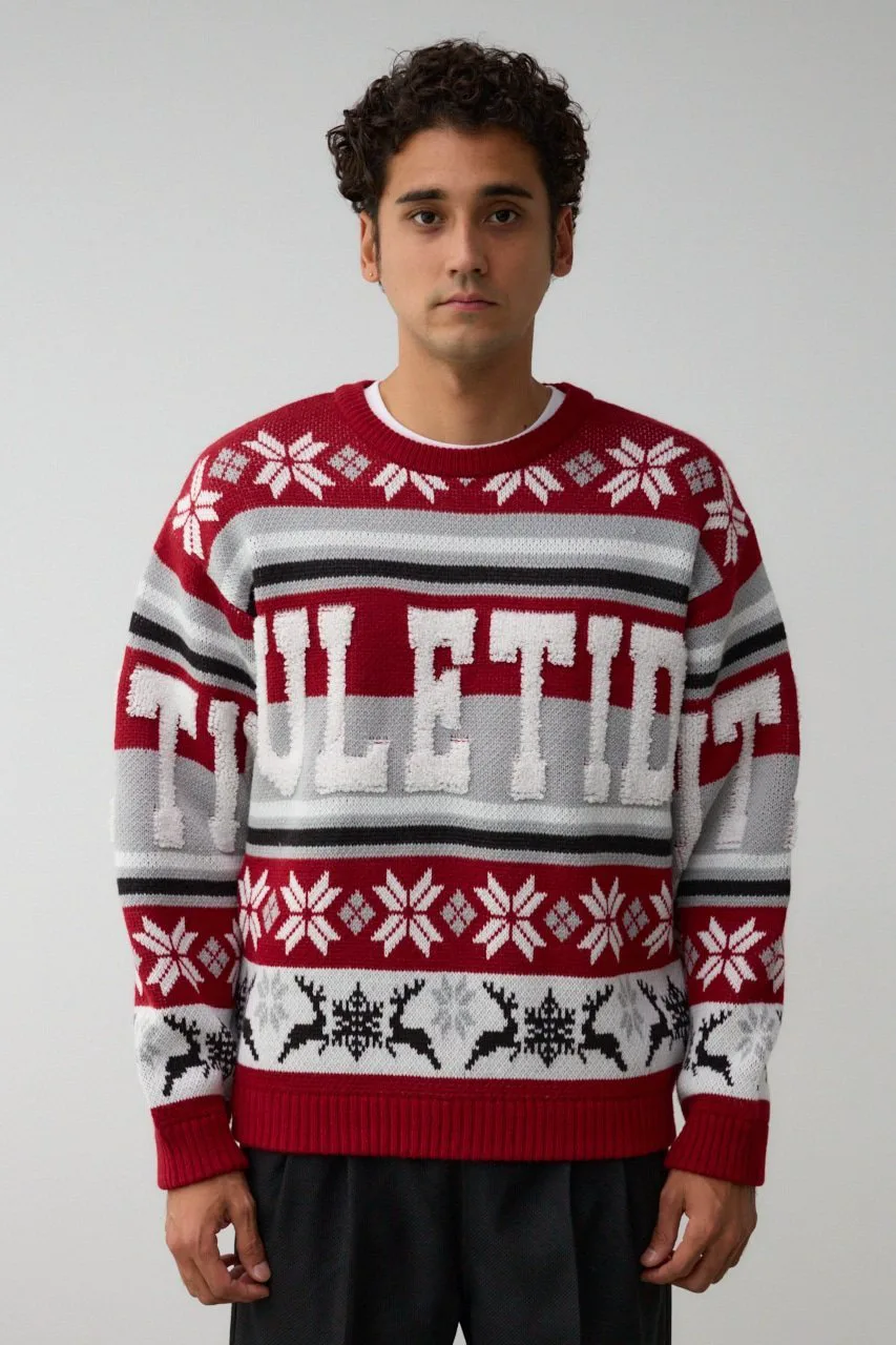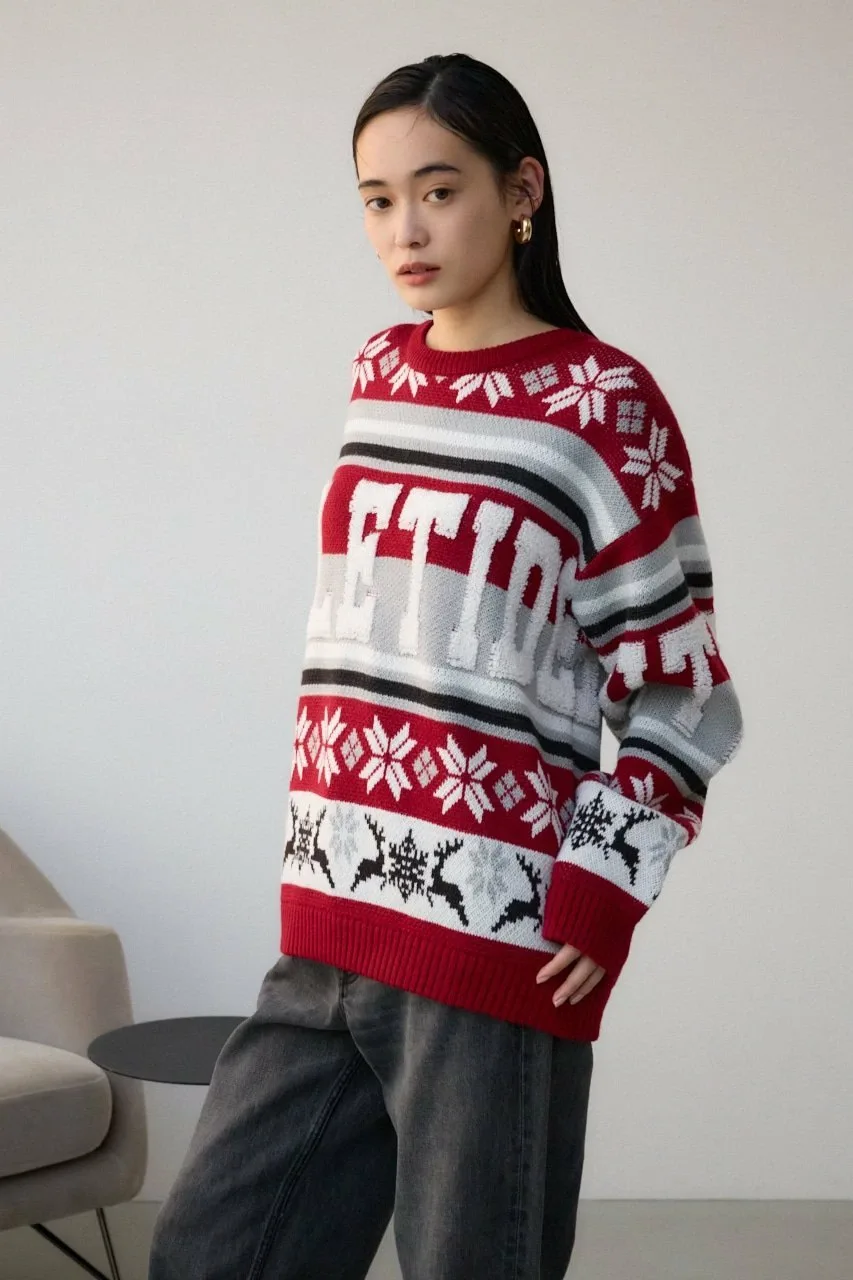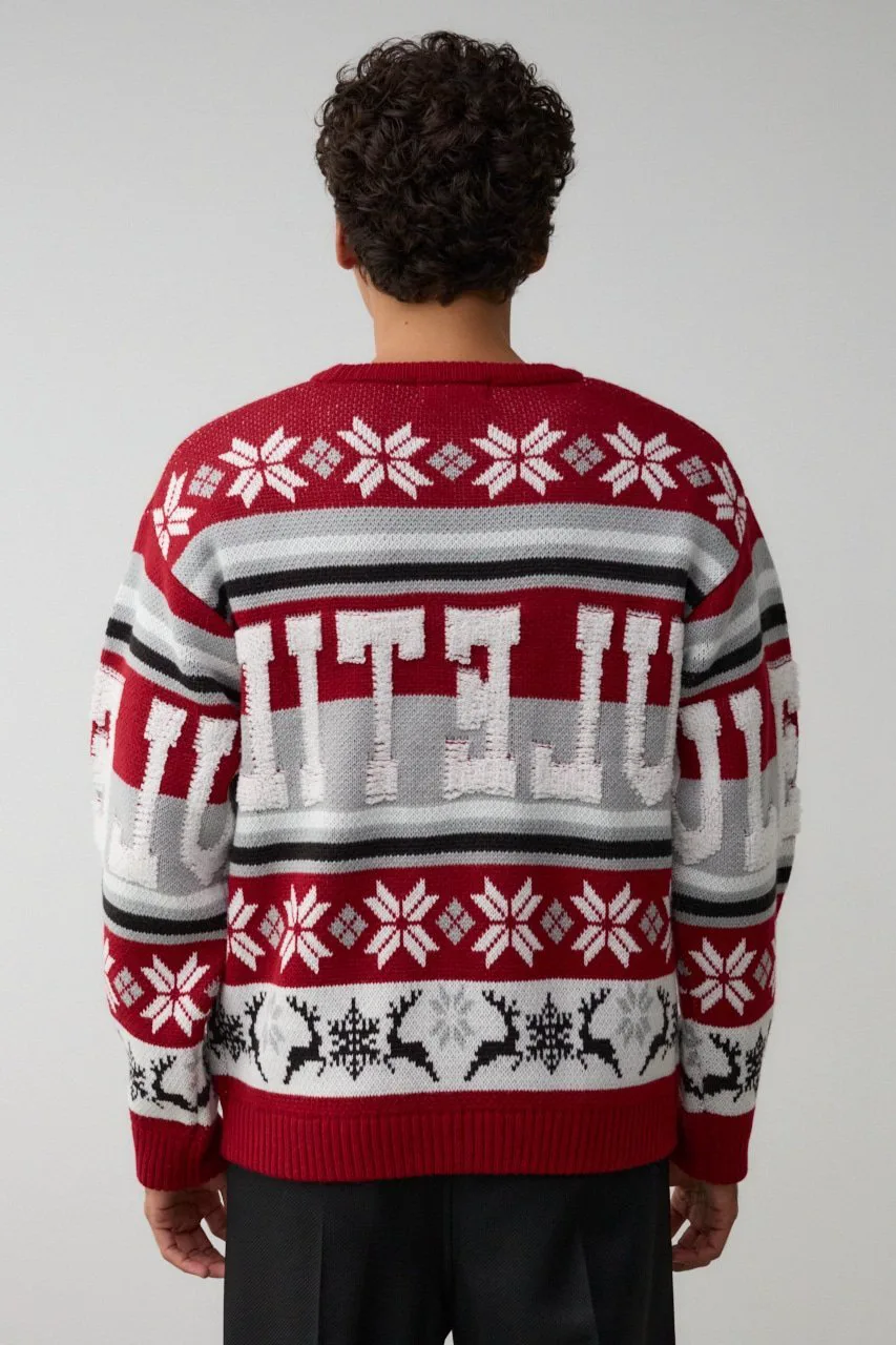 Этот жаккардовый свитер выполнен в технике петлевого вязания, поэтому из-за особенностей свитера и материала на поверхности могут встречаться небольшие узелки и свободные нити.