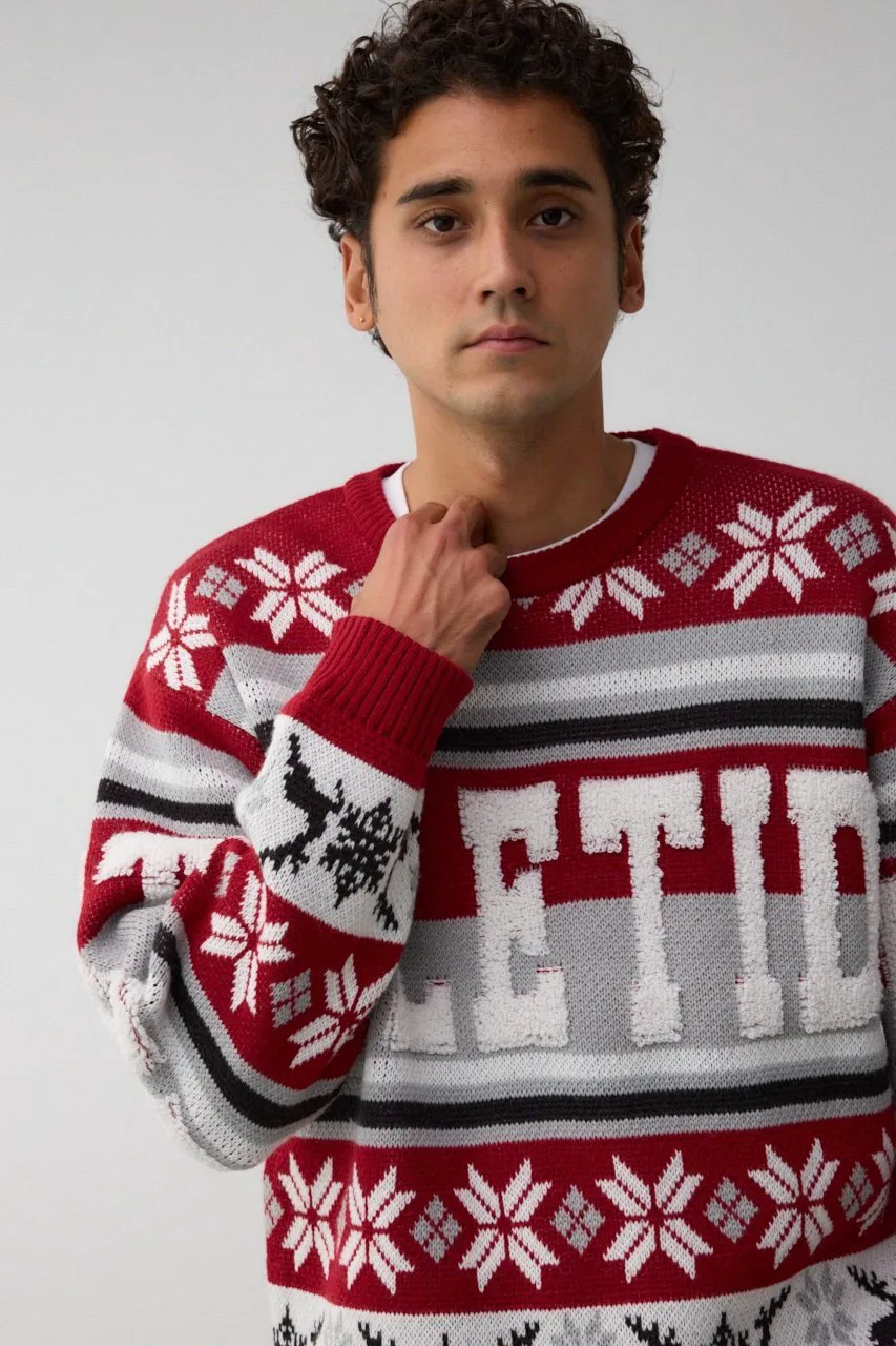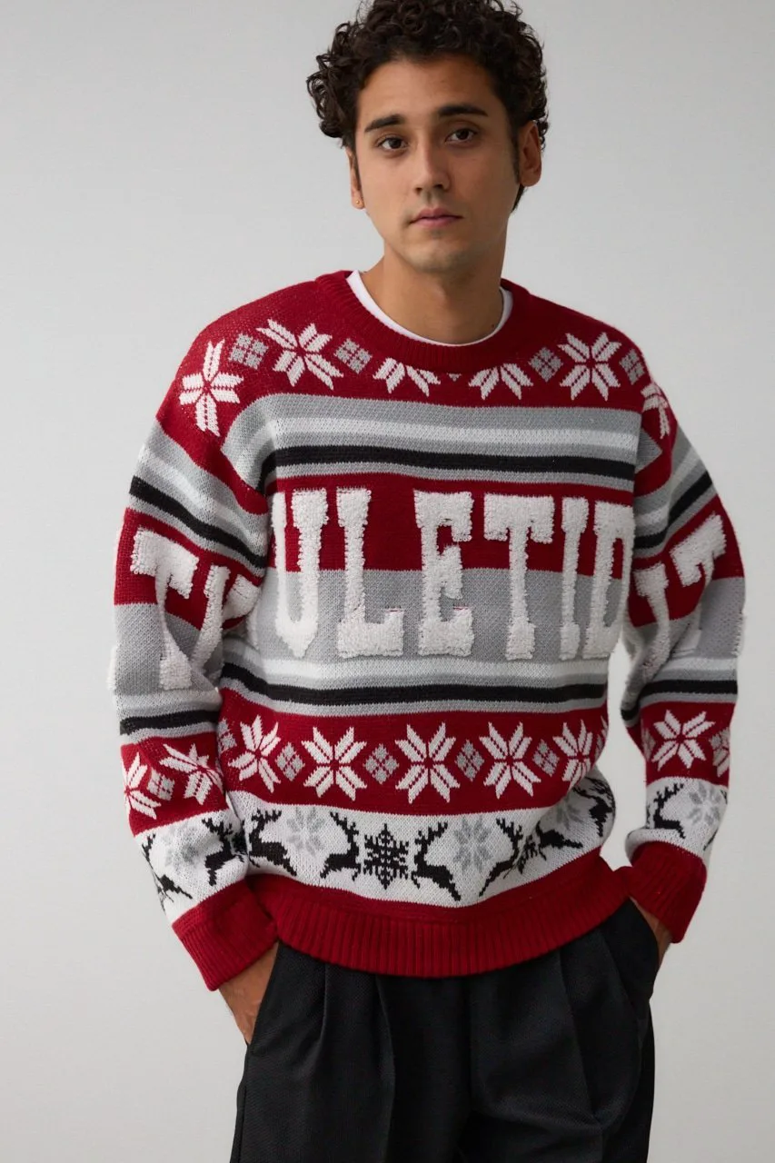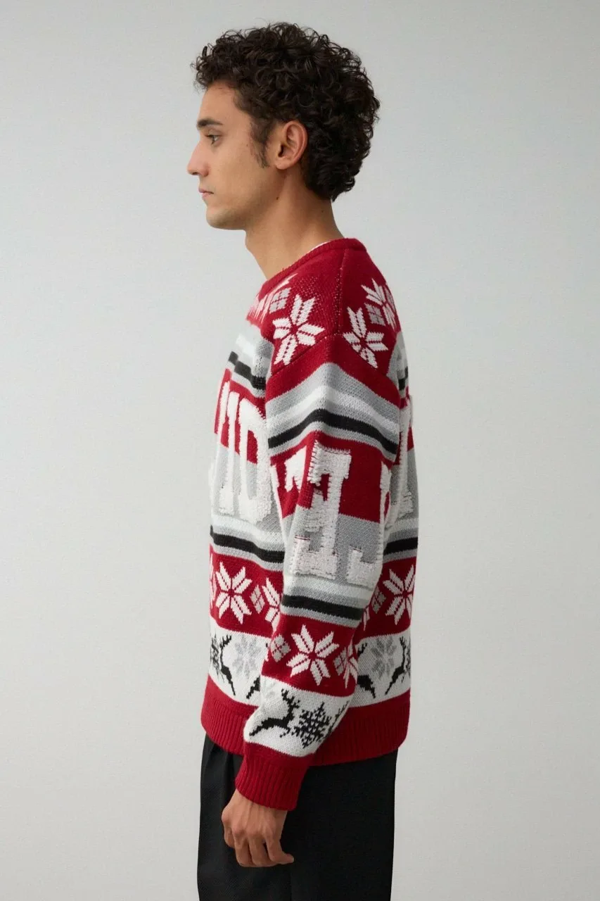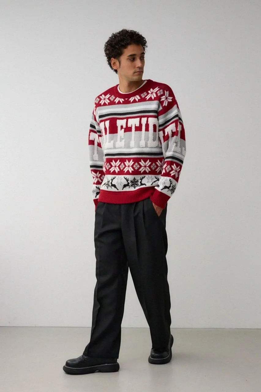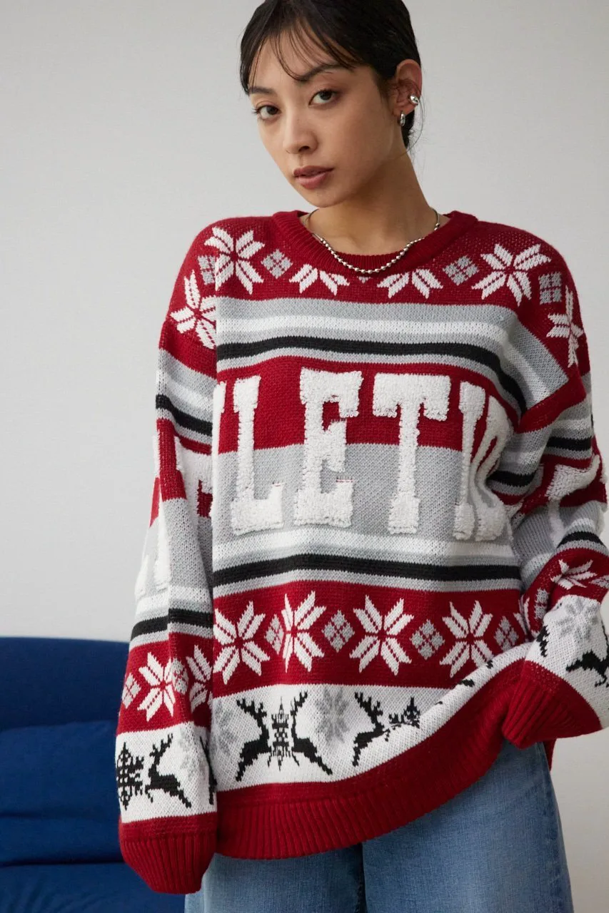 Этот жаккардовый свитер выполнен в технике петлевого вязания, поэтому из-за особенностей свитера и материала на поверхности могут встречаться небольшие узелки и свободные нити.