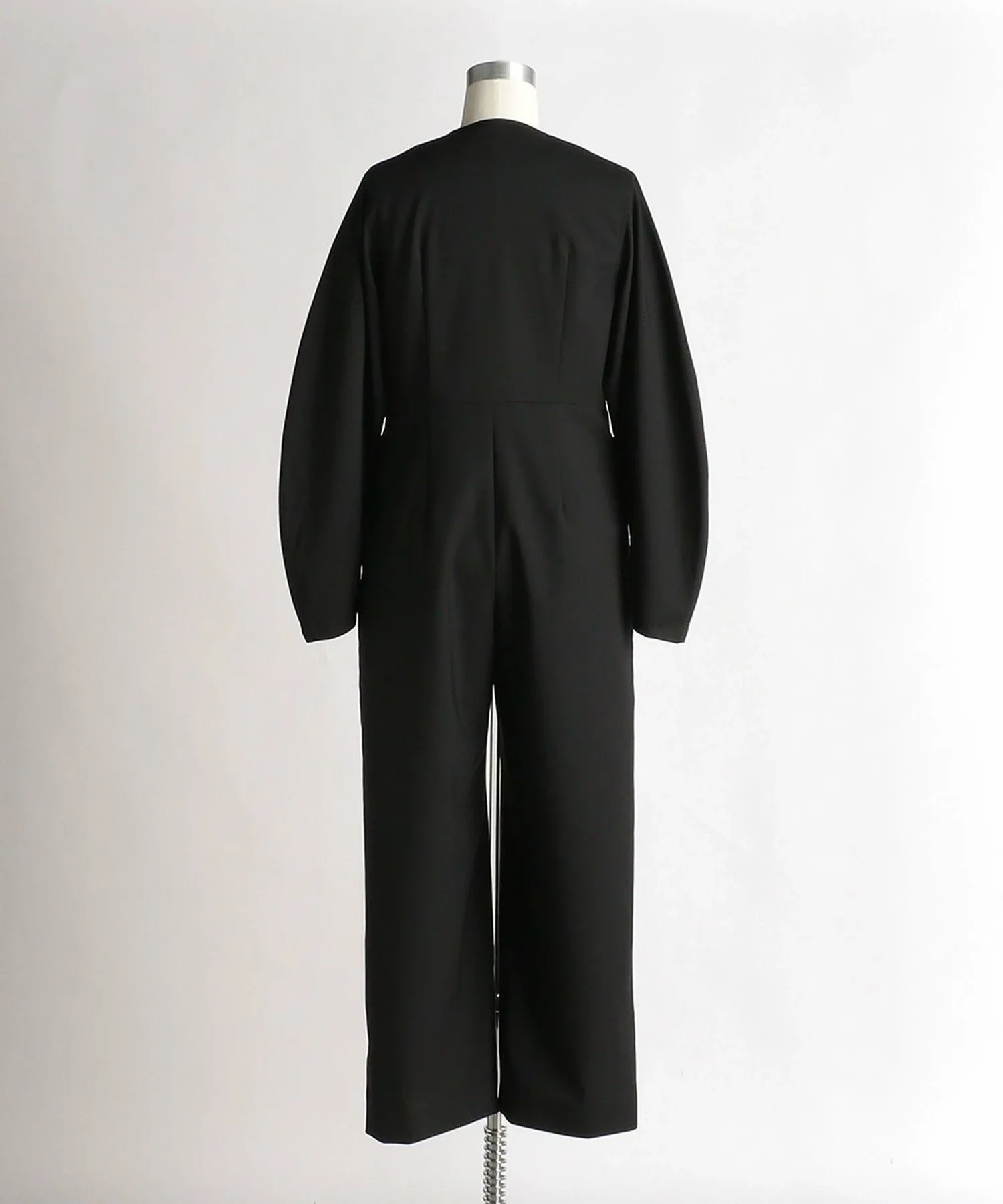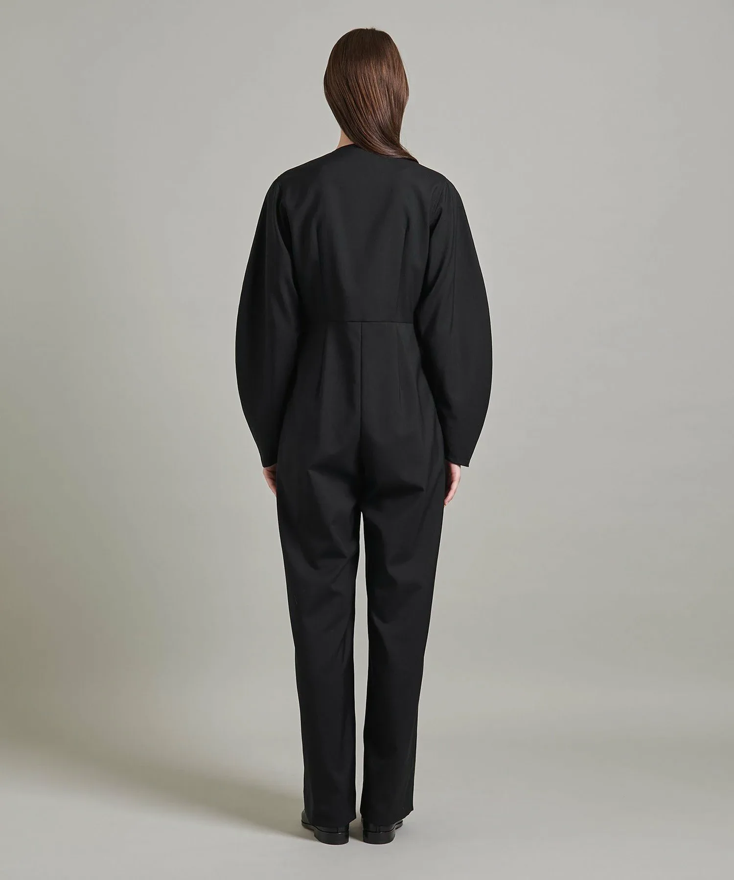 Этот комбинезон имеет силуэт, подчеркивающий талию, созданный вытачками на спине, а также закругленные рукава и струящиеся линии.