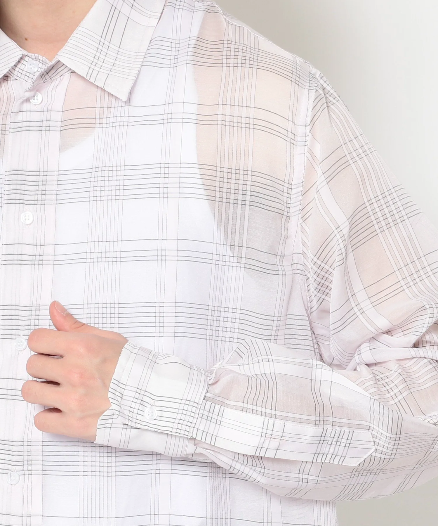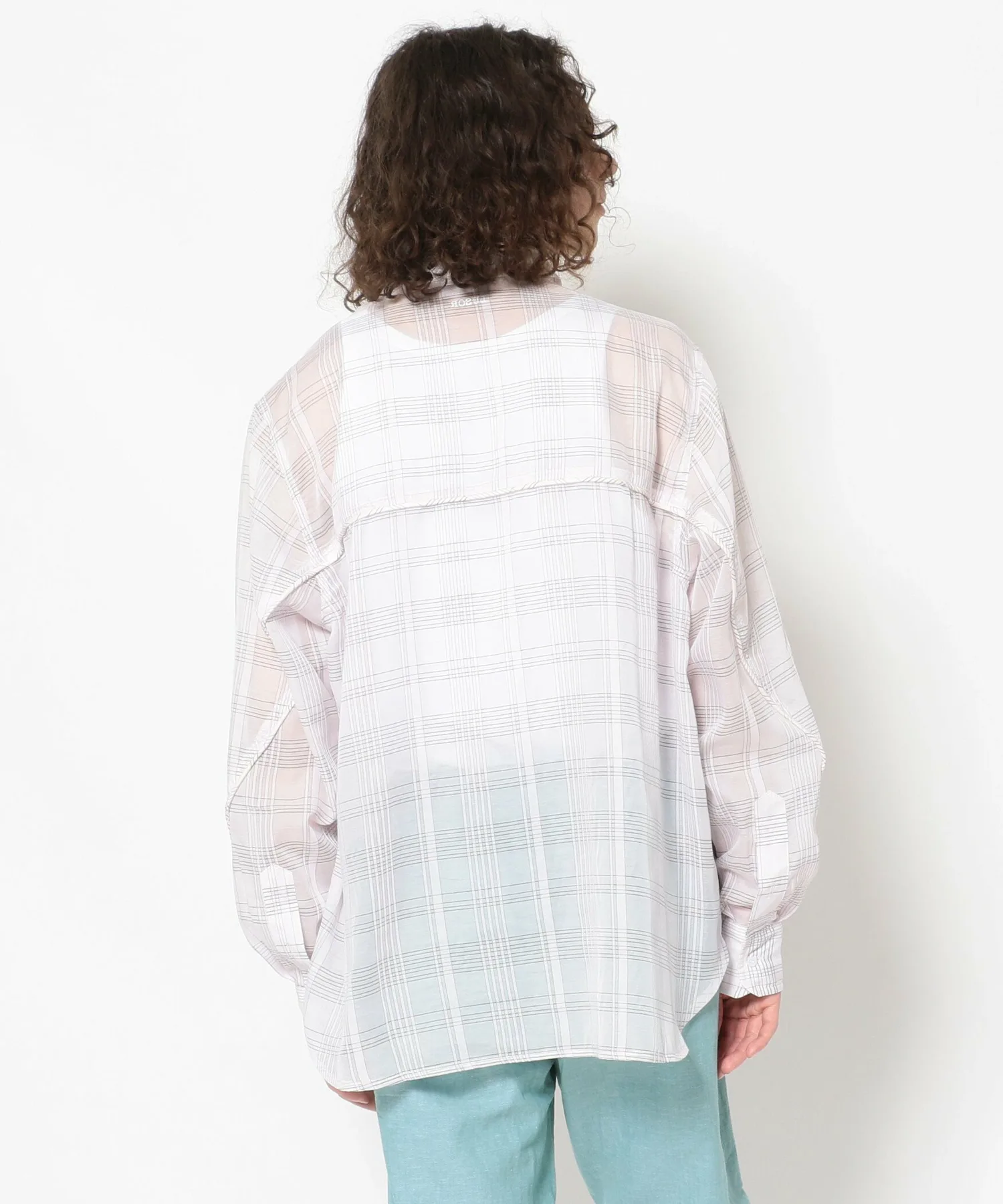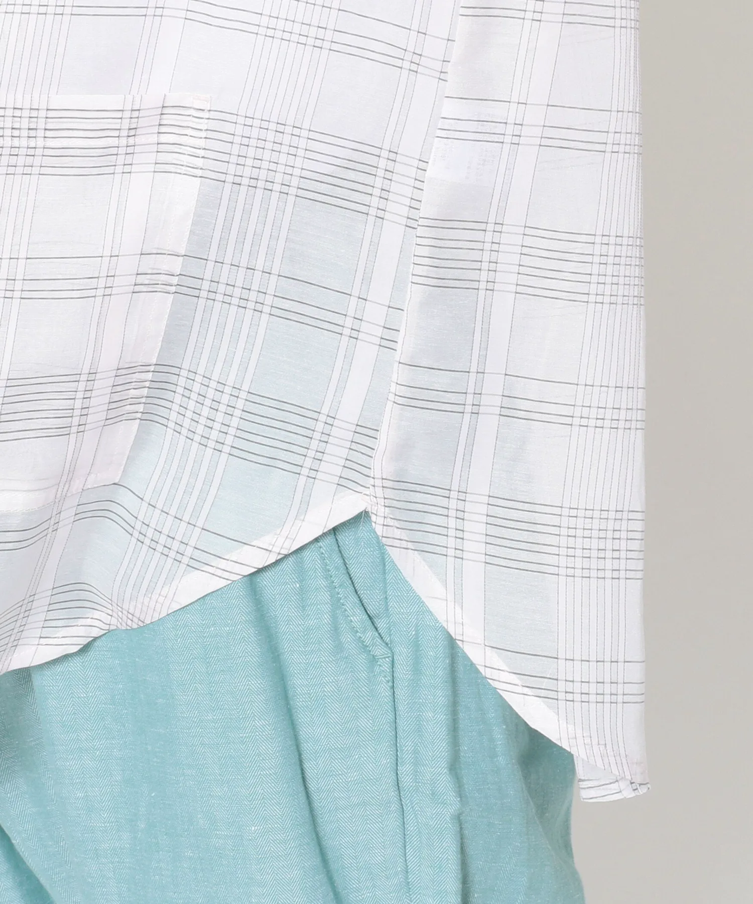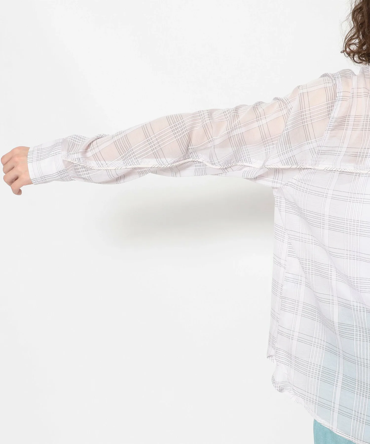 Рубашка изготовлена из тонкой клетчатой ткани и имеет контрастную спинку.