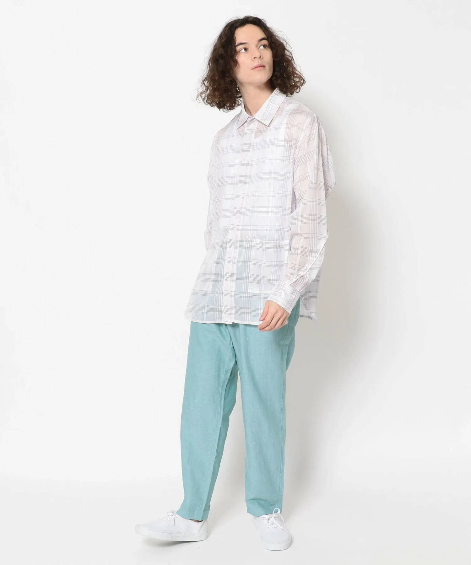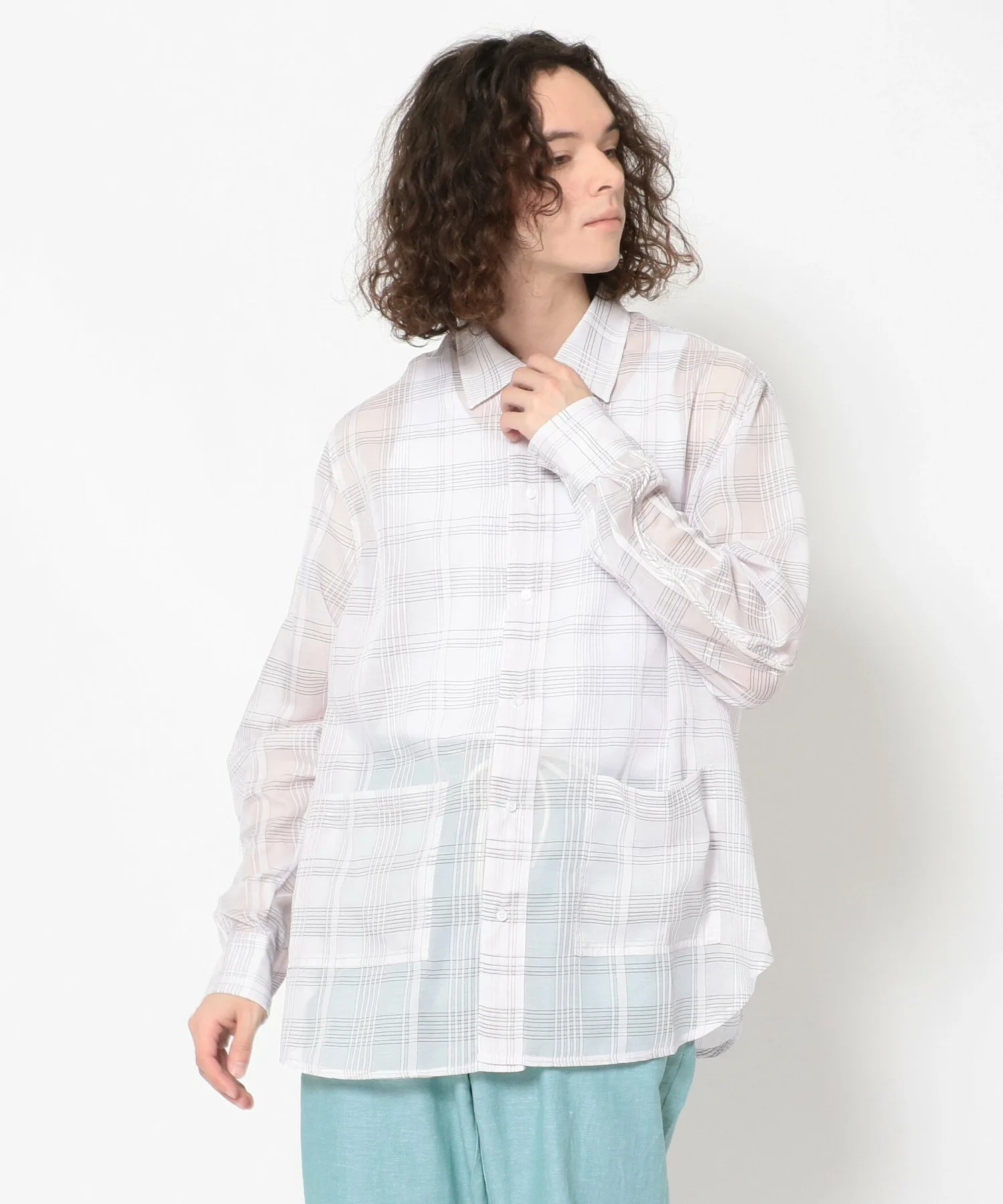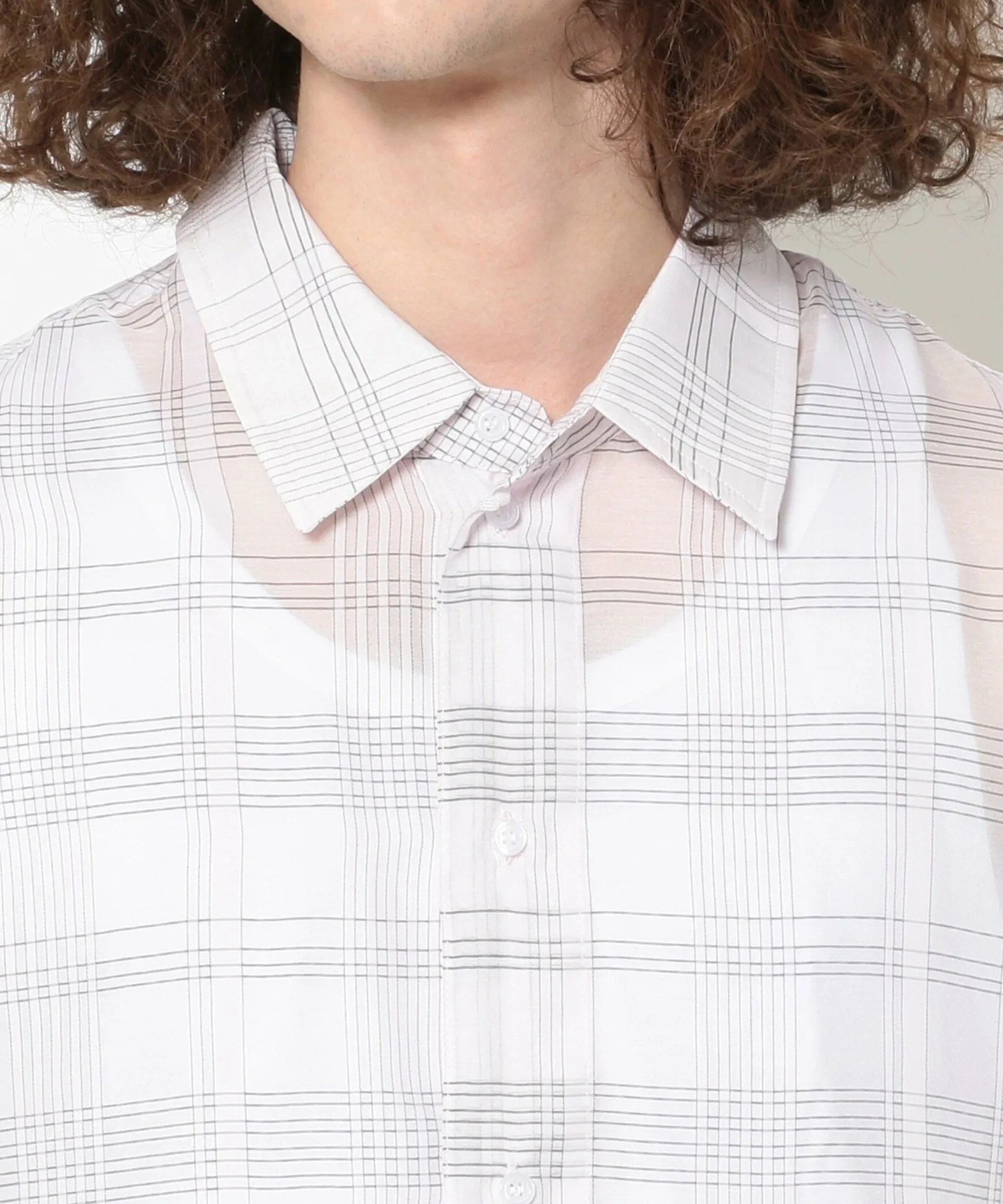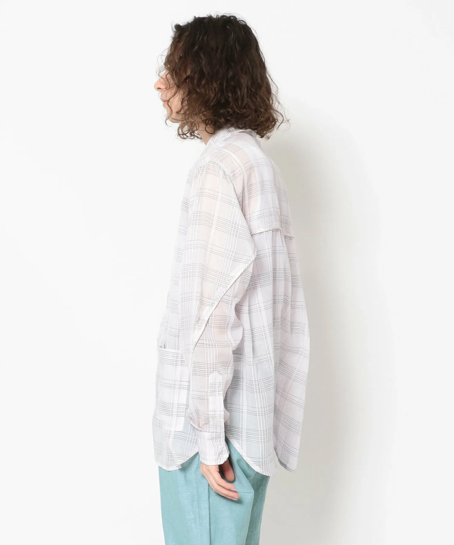 Рубашка изготовлена из тонкой клетчатой ткани и имеет контрастную спинку.