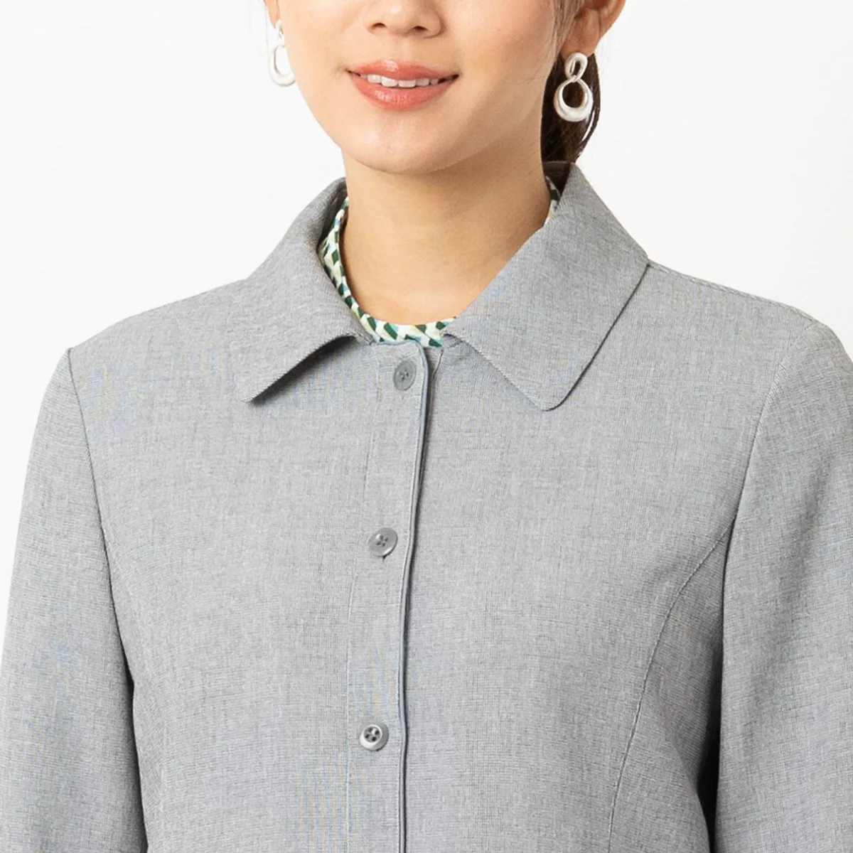 Закругленный воротник и баска сзади придают ей женственный вид.