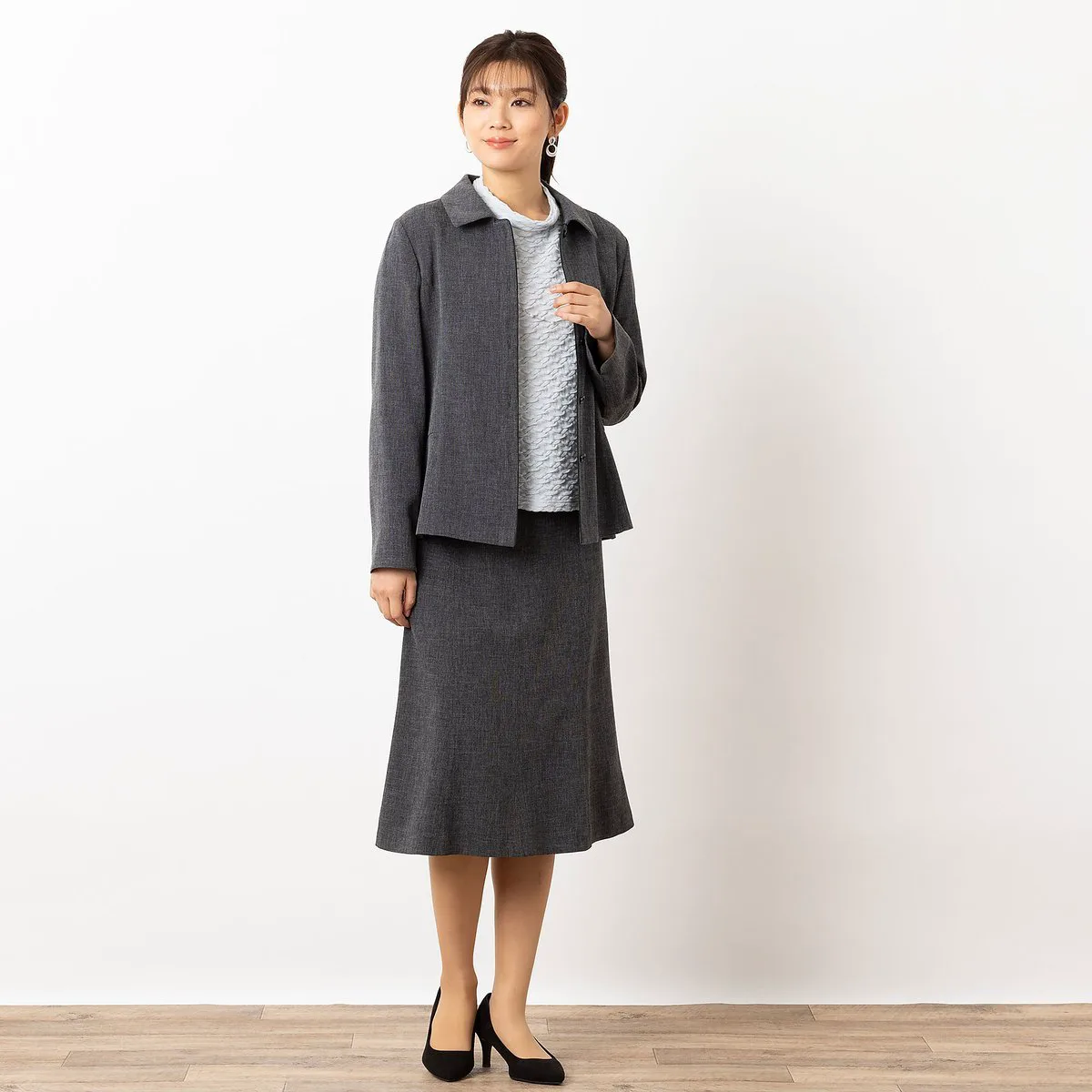 Закругленный воротник и баска сзади придают ей женственный вид.