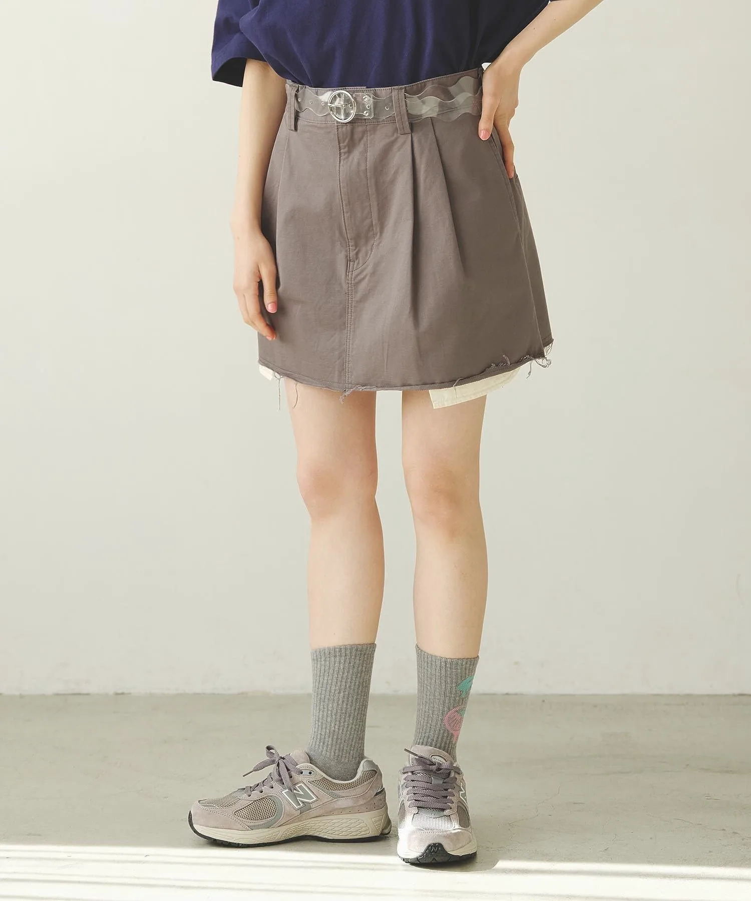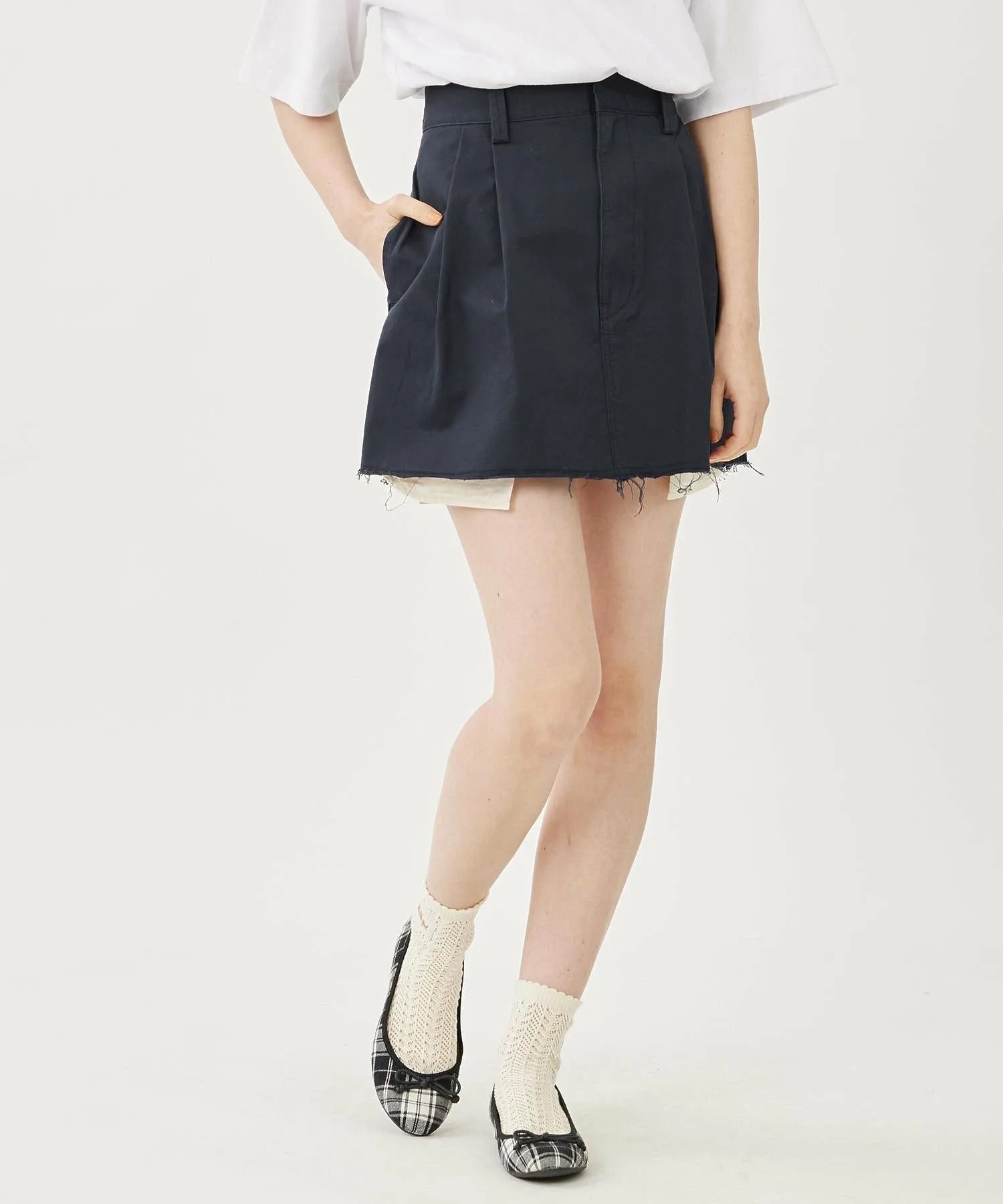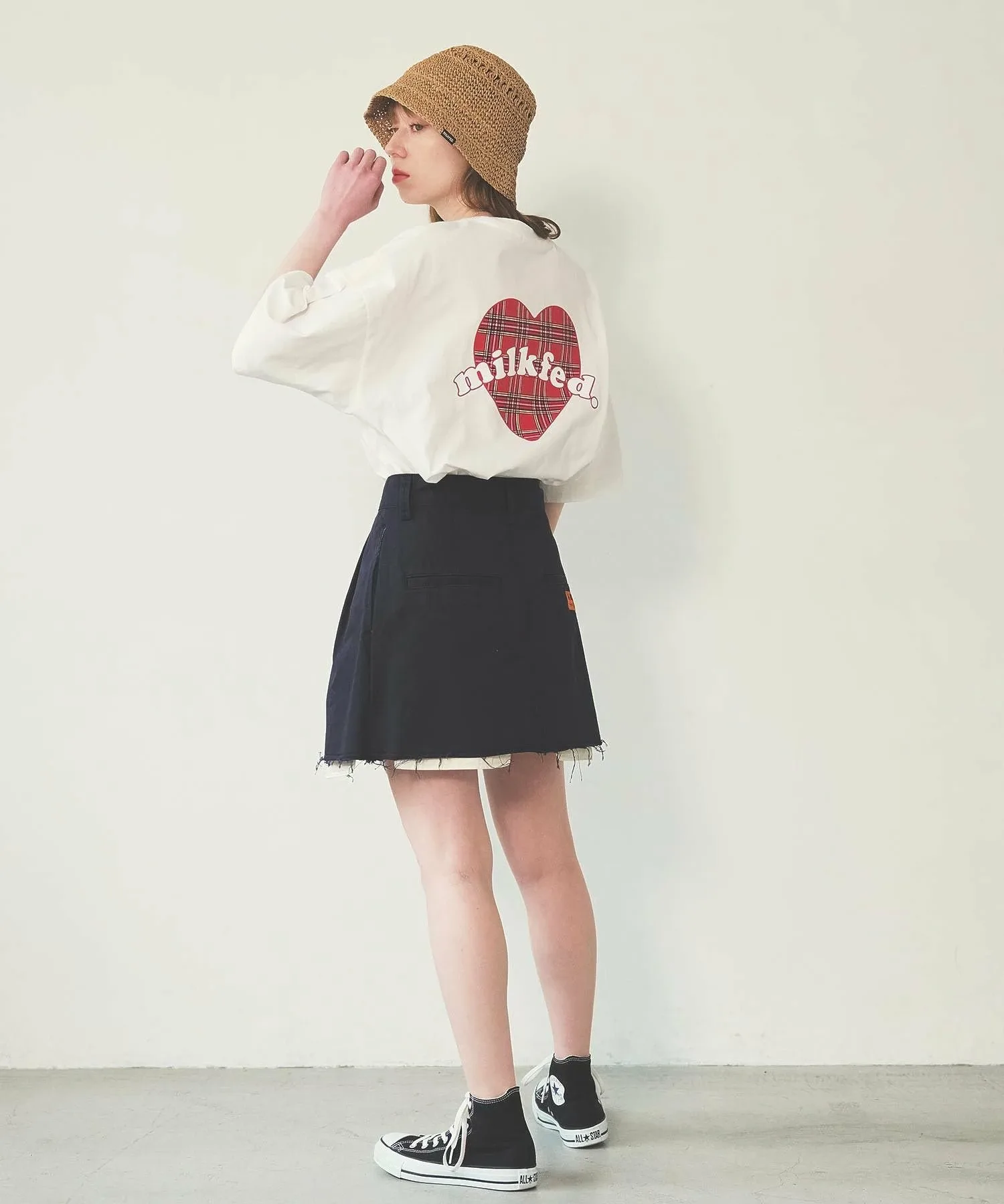 Вещи с необработанным краем создают непринужденное впечатление, поэтому их легко сбалансировать, сочетая с простым топом○При сочетании с более аккуратными вещами, добавление аксессуаров, таких как вязаная шапка или кепка, сбалансирует образ и сделает его еще более стильным! Хорошо сочетается с девичьими вещами, такими как футболки мини-длины и облегающие вязаные топы!