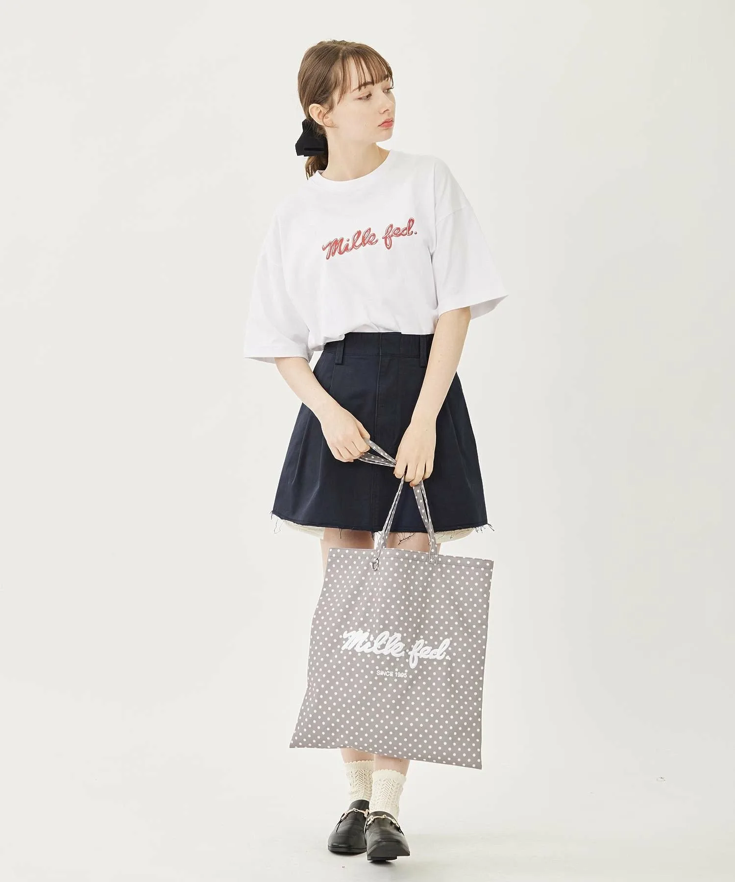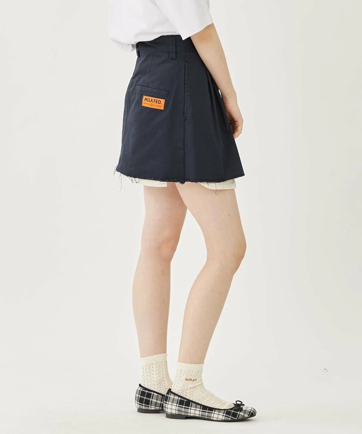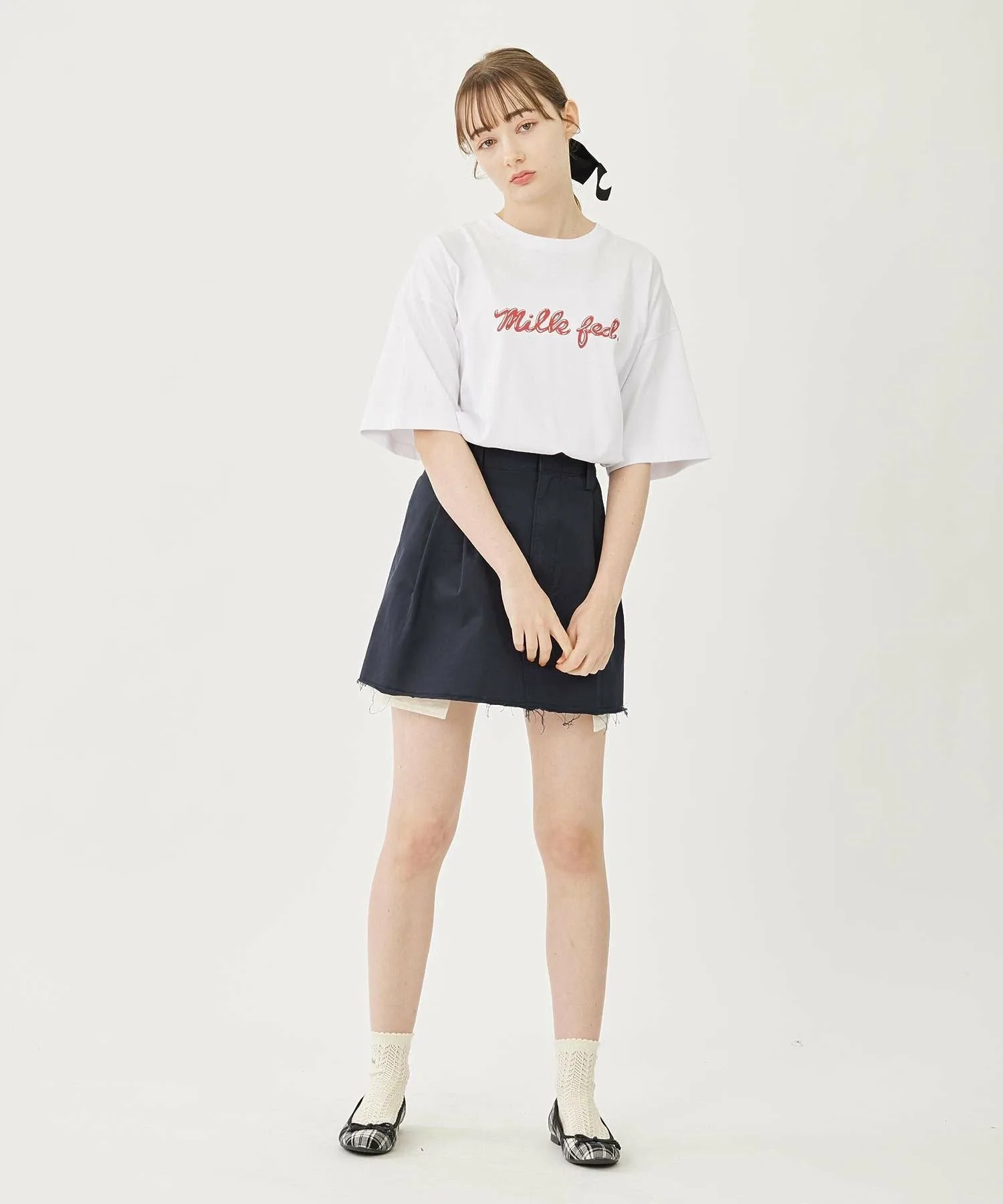Вещи с необработанным краем создают непринужденное впечатление, поэтому их легко сбалансировать, сочетая с простым топом○При сочетании с более аккуратными вещами, добавление аксессуаров, таких как вязаная шапка или кепка, сбалансирует образ и сделает его еще более стильным! Хорошо сочетается с девичьими вещами, такими как футболки мини-длины и облегающие вязаные топы!