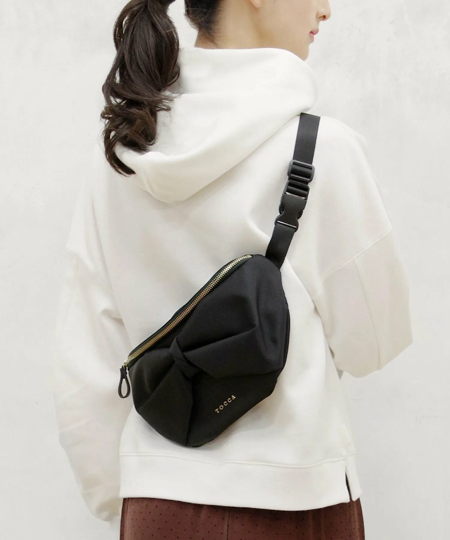 Эта модная сумка-боди украшена фирменными ленточными деталями TOCCA. Объемная лента в центре и блестящая молния создают непринужденную, но роскошную атмосферу. Сочетайте ее с платьем или простым нарядом, чтобы добавить романтичности и стиля вашему весеннему образу.