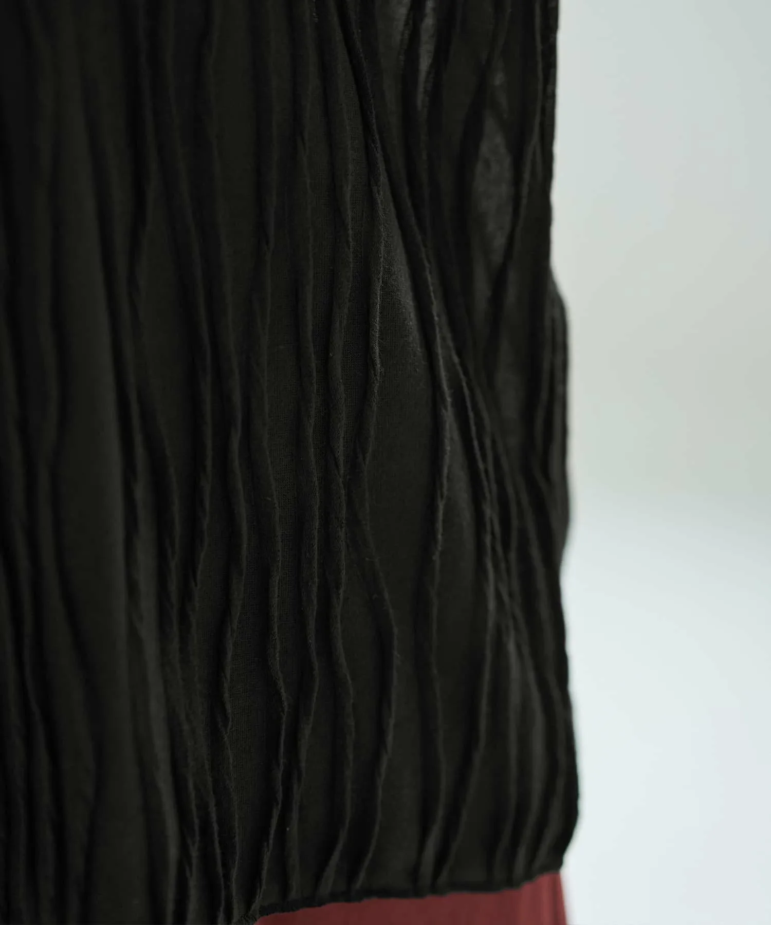 Прозрачный пуловер с легкой прозрачностью. Дизайн внутреннего слоя не особенно заметен, поэтому в холодную погоду его можно носить с подкладкой с длинными рукавами, например, Heattech.