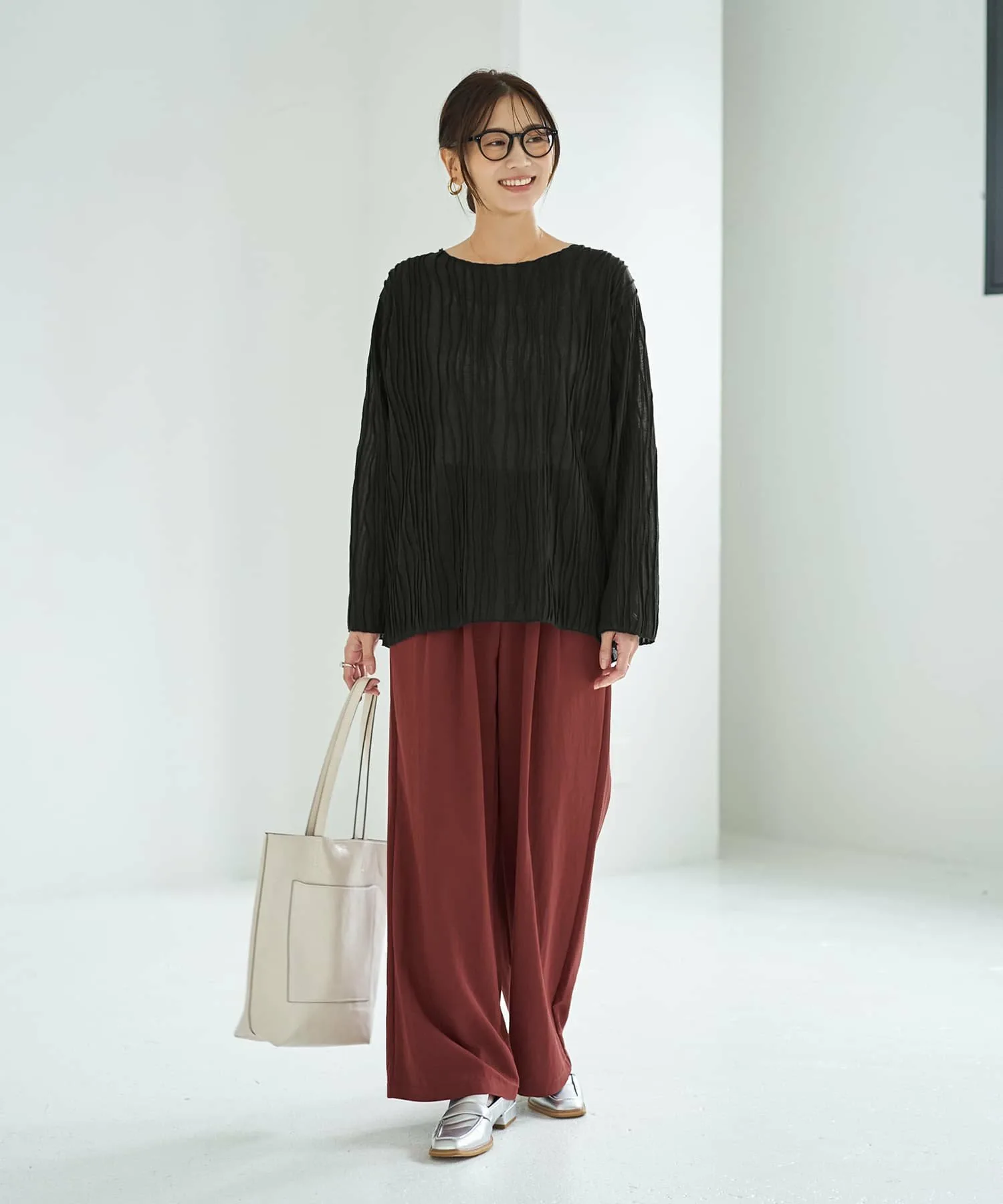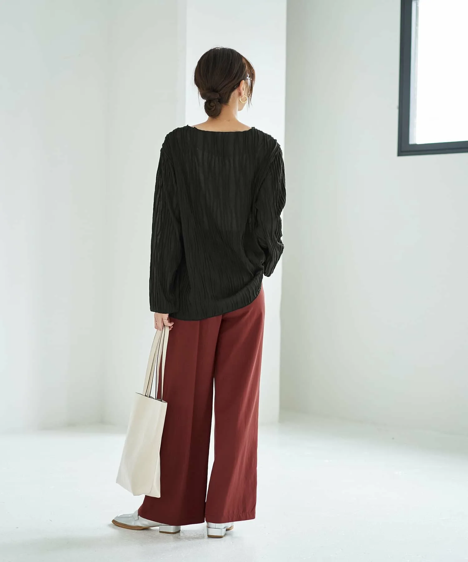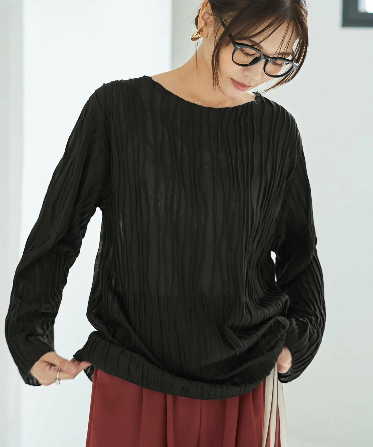 Свободный крой не облегает тело. Как и топ с длинными рукавами, это удобный топ. Симпатичная форма и детали создают струящийся силуэт, поэтому мы рекомендуем носить его с заправленным низом. Ткань не толстая, поэтому вы можете заправить его для создания симпатичного образа. Вырез горловины — женственный вырез-лодочка. Он немного более открытый, чем обычный вырез-лодочка, с плавно изогнутой линией декольте. Он достаточно открытый, чтобы скрыть бретельки нижнего белья. Низ прямой и обработан фестончатым краем. Этот фестончатый стиль не создает ощущения рюшей или волн. Хотя сама ткань эластична, волнистая, защипнутая отделка и фестончатый край не позволяют ей растягиваться дальше. Однако, благодаря свободному крою, она удобна и не стесняет движений, что делает её особенно комфортной и привлекательной. Эта уникальная и стильная вещь сочетает в себе комфорт топа и элегантность блузки. Мягкость марли, едва заметная прозрачность и плавные линии выреза-лодочки создают цельный, женственный образ. Таким образом, она излучает естественное, чувственное очарование, не выглядя искусственной.